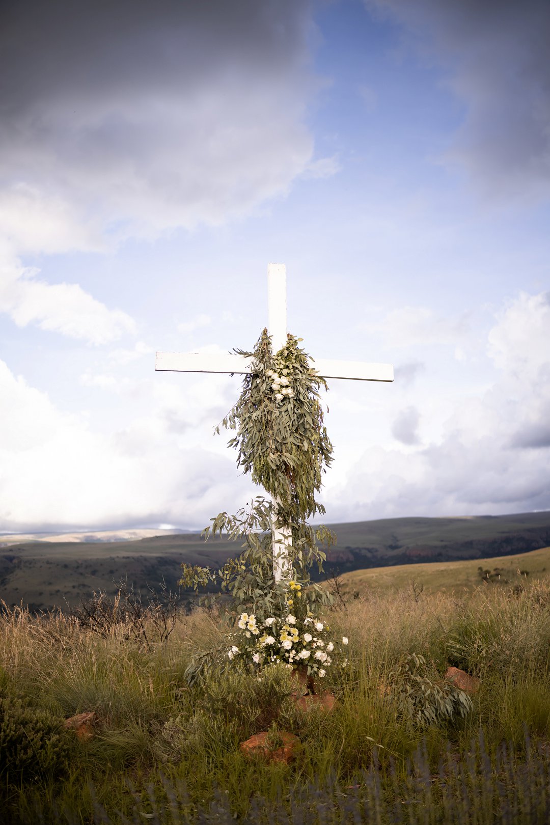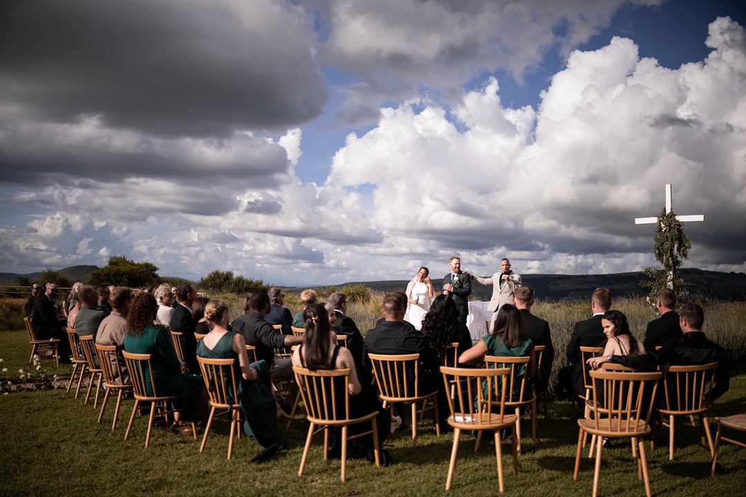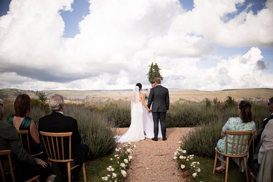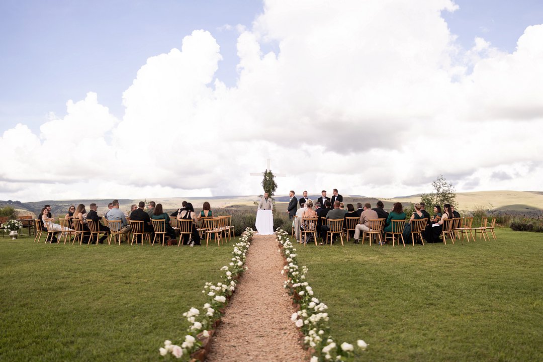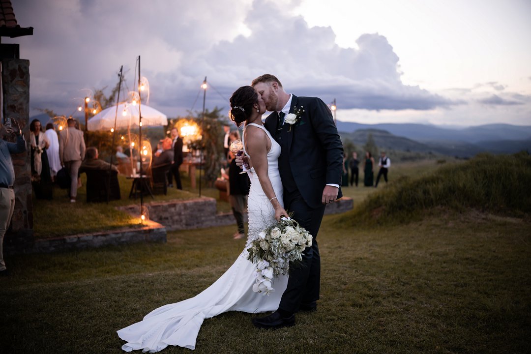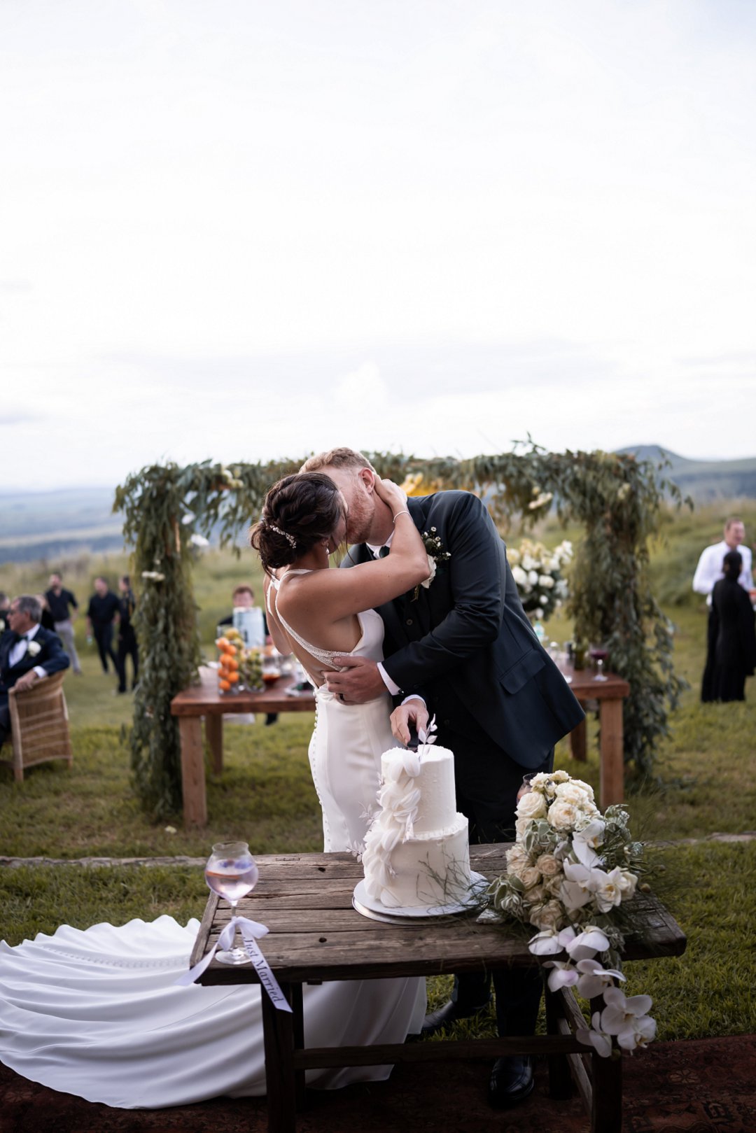 Die buitelug seremonie was net so asemrowend omring deur pragtige uitsigte wat nét Mpumalanga kan bied. Die dramatiese wolke in hul troufoto’s het ’n ekstra tikkie magie daaraan bygedra! Ná die seremonie het die paartjie dadelik hul troukoek saam gesny. Dit was ’n spesiale oomblik vir hul gaste. Ook ’n slim manier om almal se aandag op die koek te fokus. Die elegante, minimalistiese troukoek met twee lae was versier met fyn wit blommetjies en ’n subtiele patroon vir ekstra tekstuur.