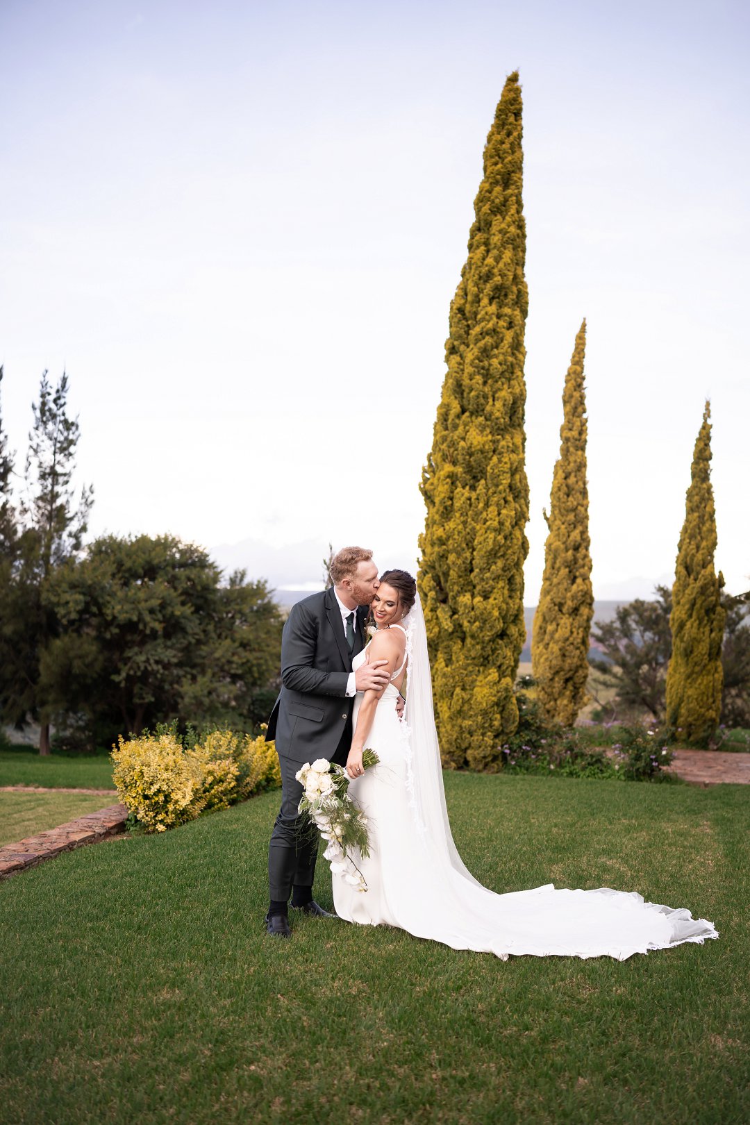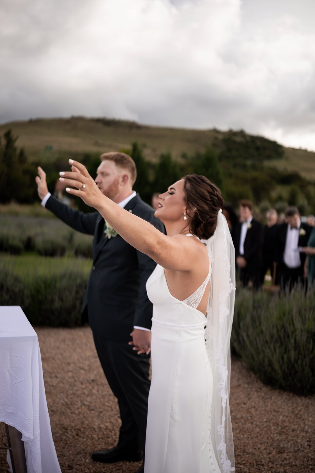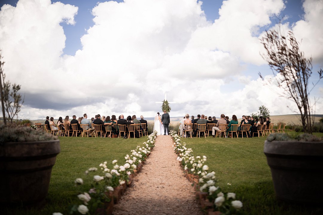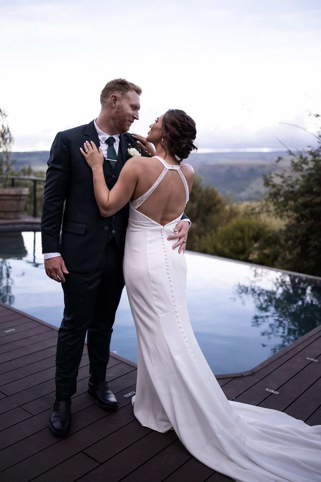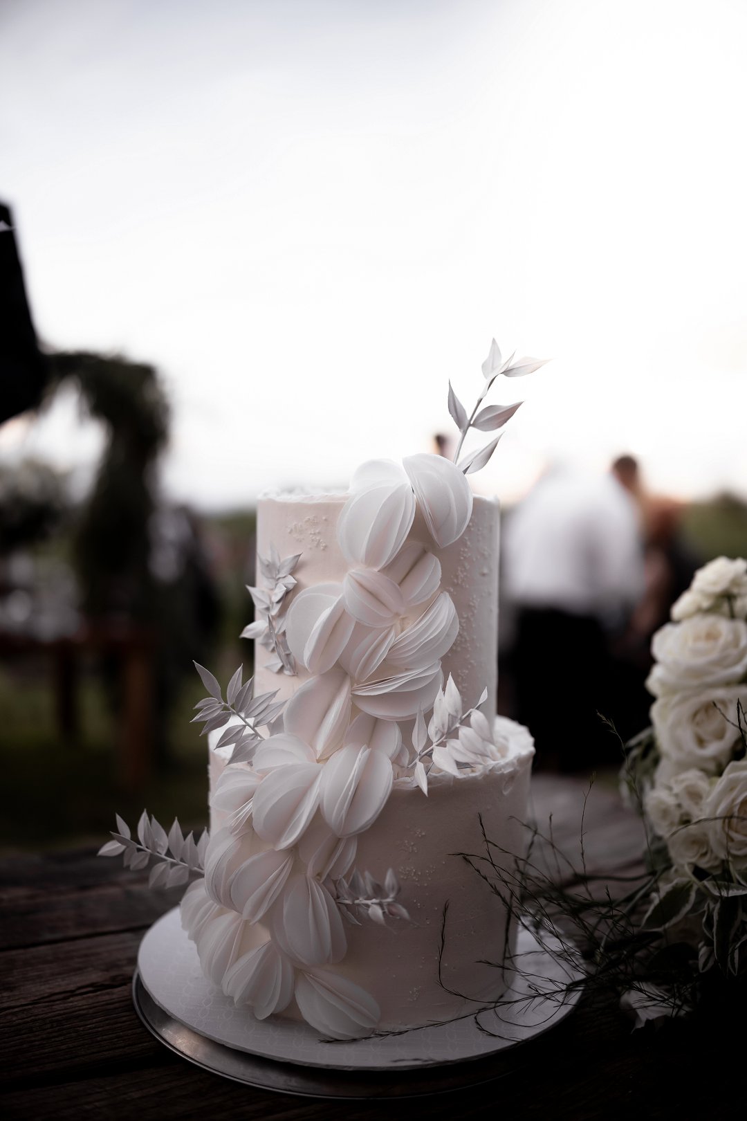 Die buitelug seremonie was net so asemrowend omring deur pragtige uitsigte wat nét Mpumalanga kan bied. Die dramatiese wolke in hul troufoto’s het ’n ekstra tikkie magie daaraan bygedra! Ná die seremonie het die paartjie dadelik hul troukoek saam gesny. Dit was ’n spesiale oomblik vir hul gaste. Ook ’n slim manier om almal se aandag op die koek te fokus. Die elegante, minimalistiese troukoek met twee lae was versier met fyn wit blommetjies en ’n subtiele patroon vir ekstra tekstuur.