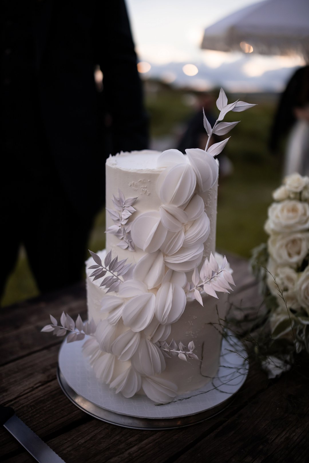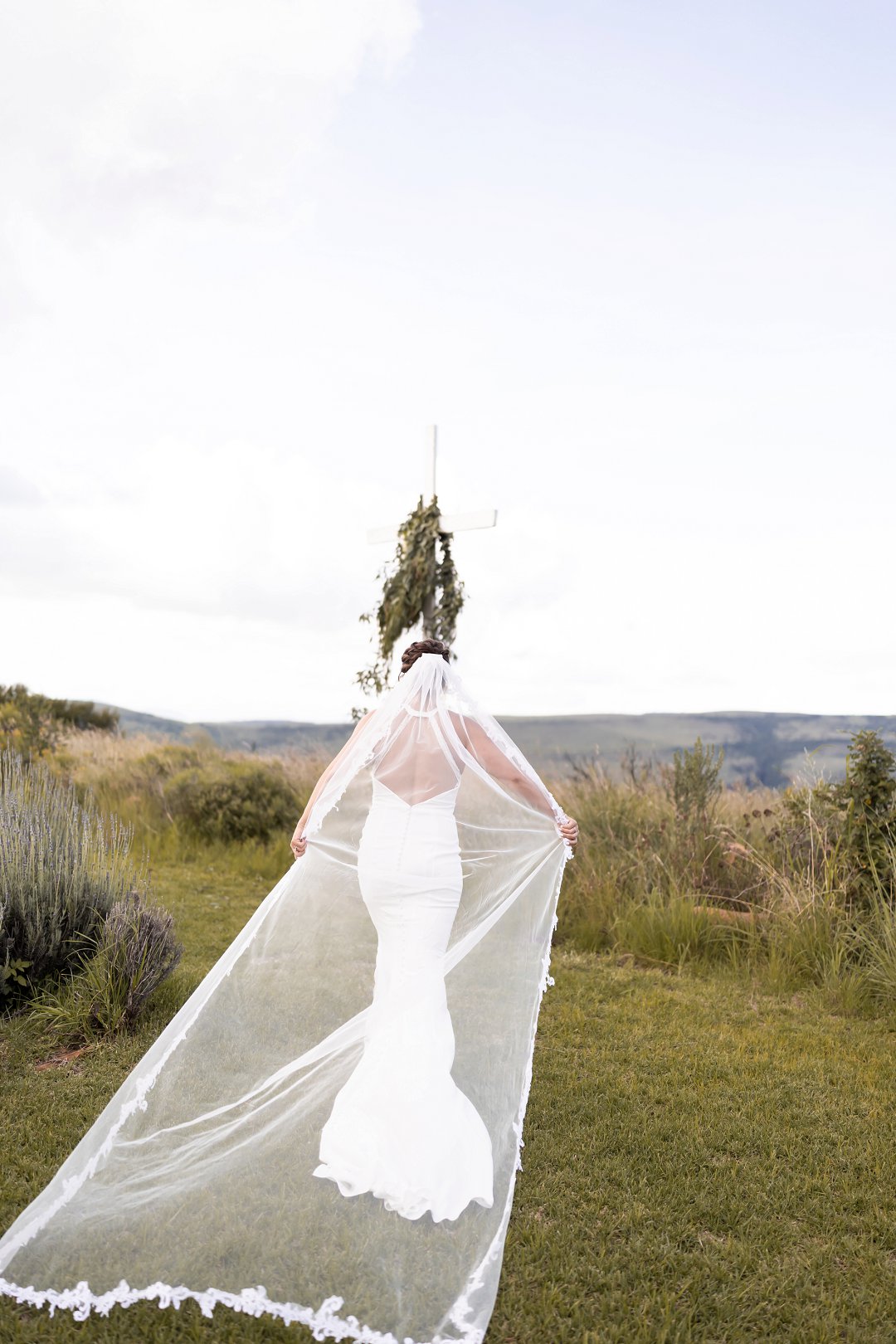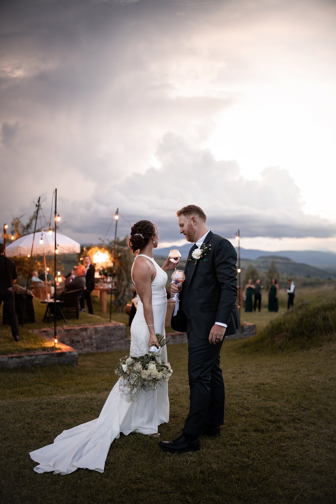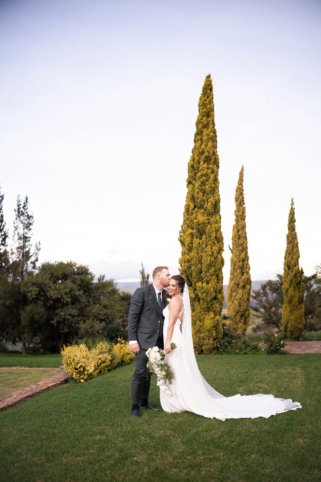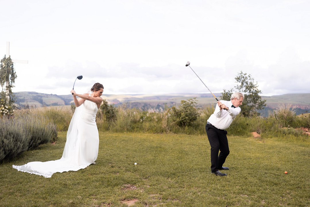 Die buitelug seremonie was net so asemrowend omring deur pragtige uitsigte wat nét Mpumalanga kan bied. Die dramatiese wolke in hul troufoto’s het ’n ekstra tikkie magie daaraan bygedra! Ná die seremonie het die paartjie dadelik hul troukoek saam gesny. Dit was ’n spesiale oomblik vir hul gaste. Ook ’n slim manier om almal se aandag op die koek te fokus. Die elegante, minimalistiese troukoek met twee lae was versier met fyn wit blommetjies en ’n subtiele patroon vir ekstra tekstuur.