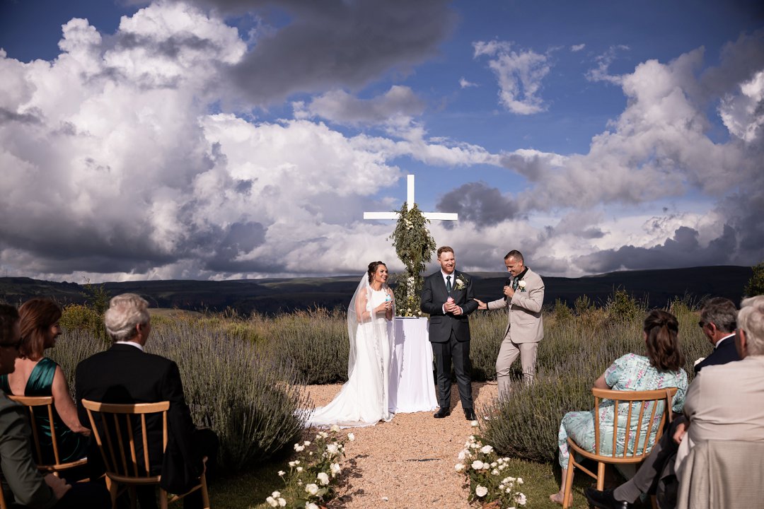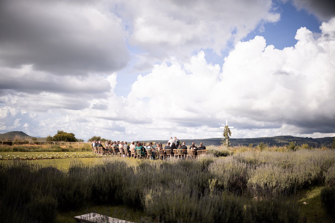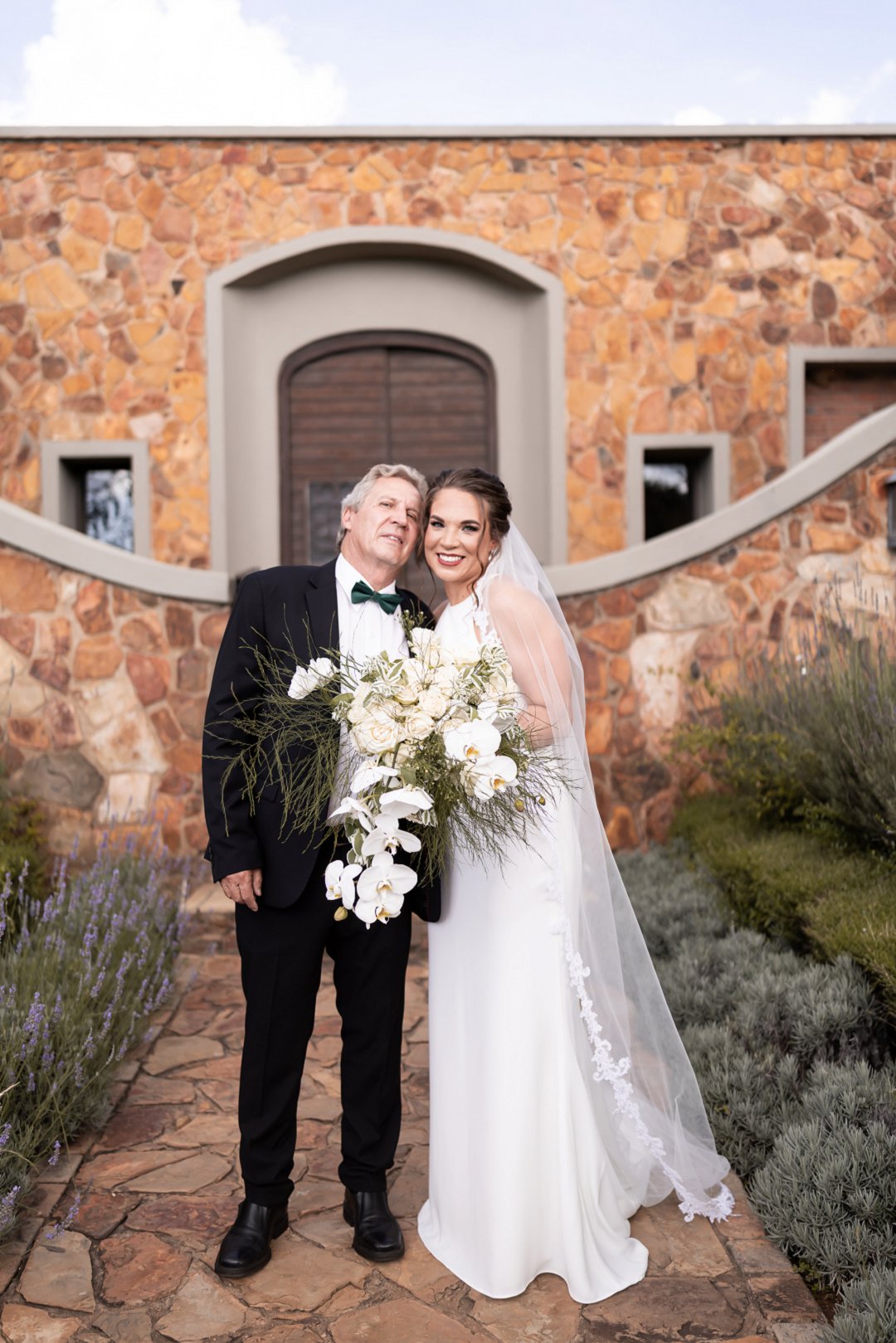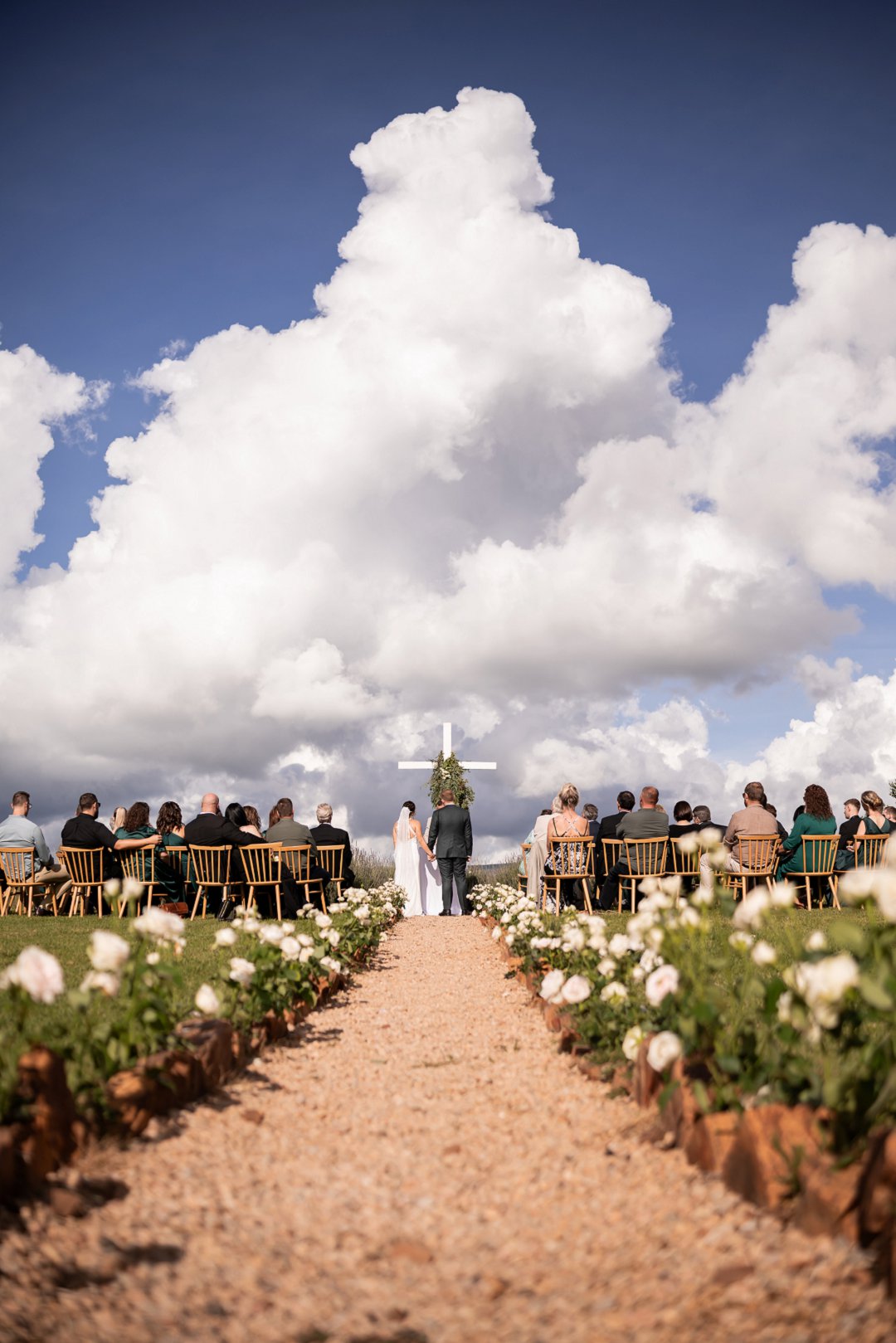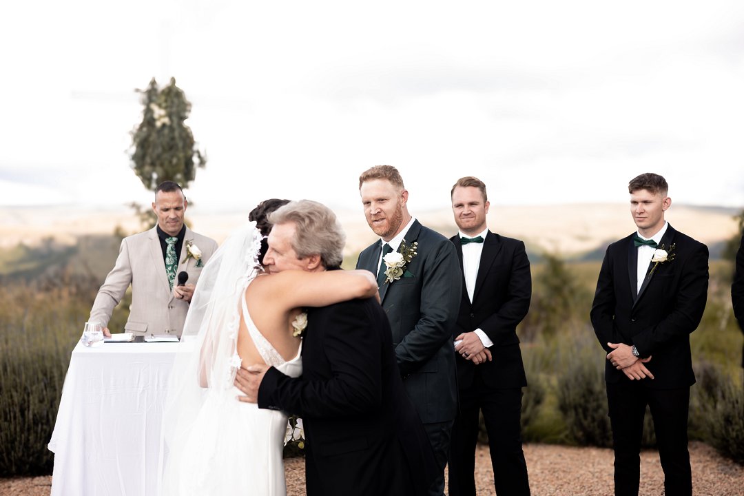 Die buitelug seremonie was net so asemrowend omring deur pragtige uitsigte wat nét Mpumalanga kan bied. Die dramatiese wolke in hul troufoto’s het ’n ekstra tikkie magie daaraan bygedra! Ná die seremonie het die paartjie dadelik hul troukoek saam gesny. Dit was ’n spesiale oomblik vir hul gaste. Ook ’n slim manier om almal se aandag op die koek te fokus. Die elegante, minimalistiese troukoek met twee lae was versier met fyn wit blommetjies en ’n subtiele patroon vir ekstra tekstuur.