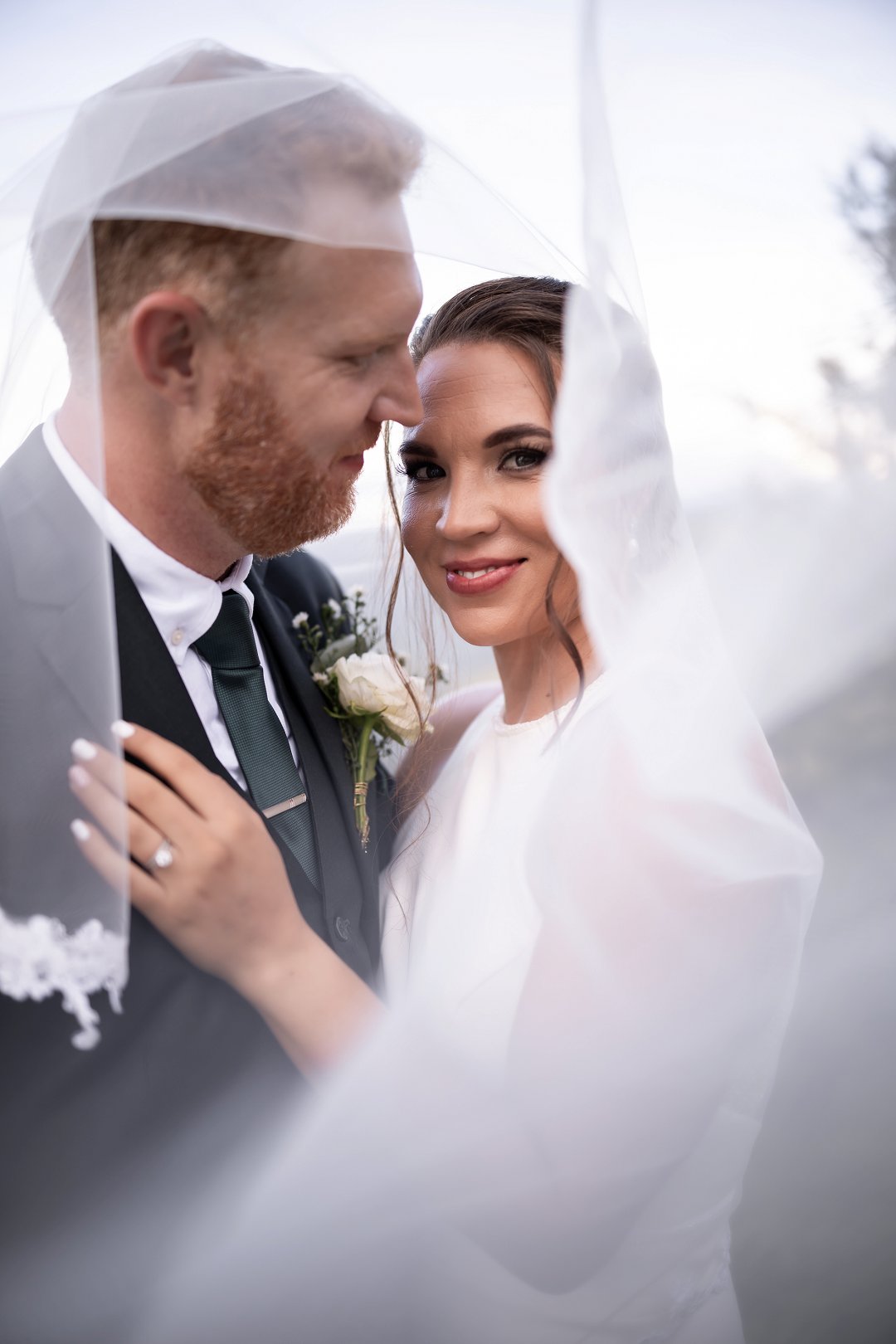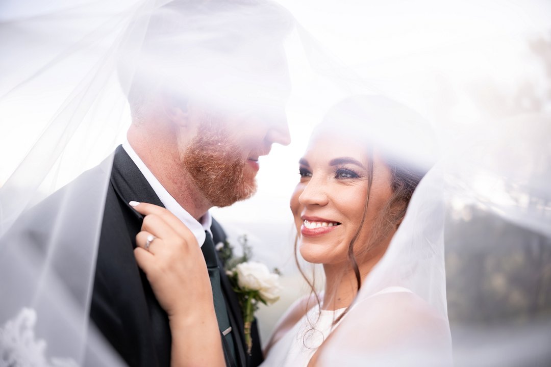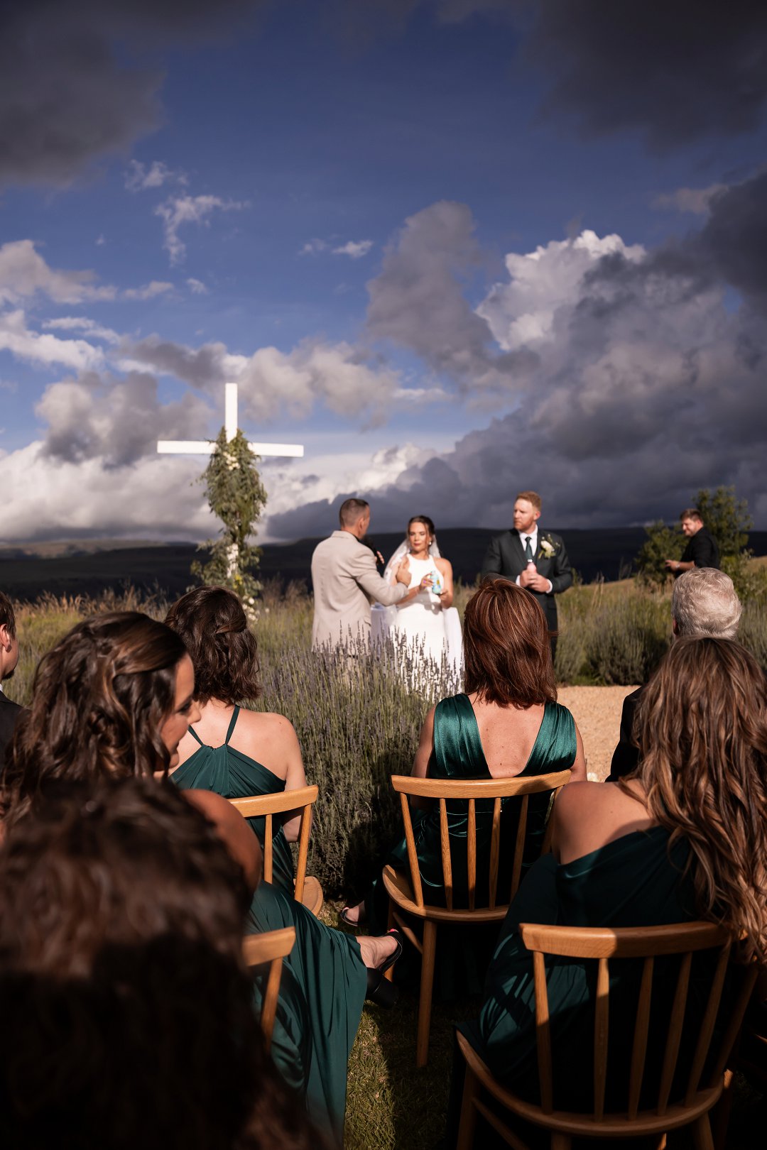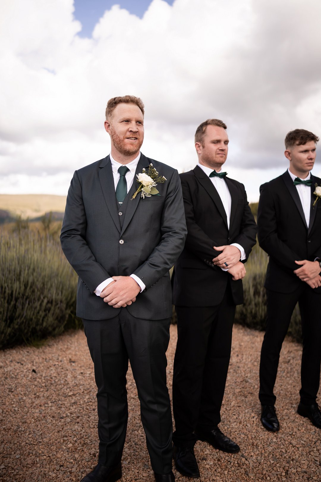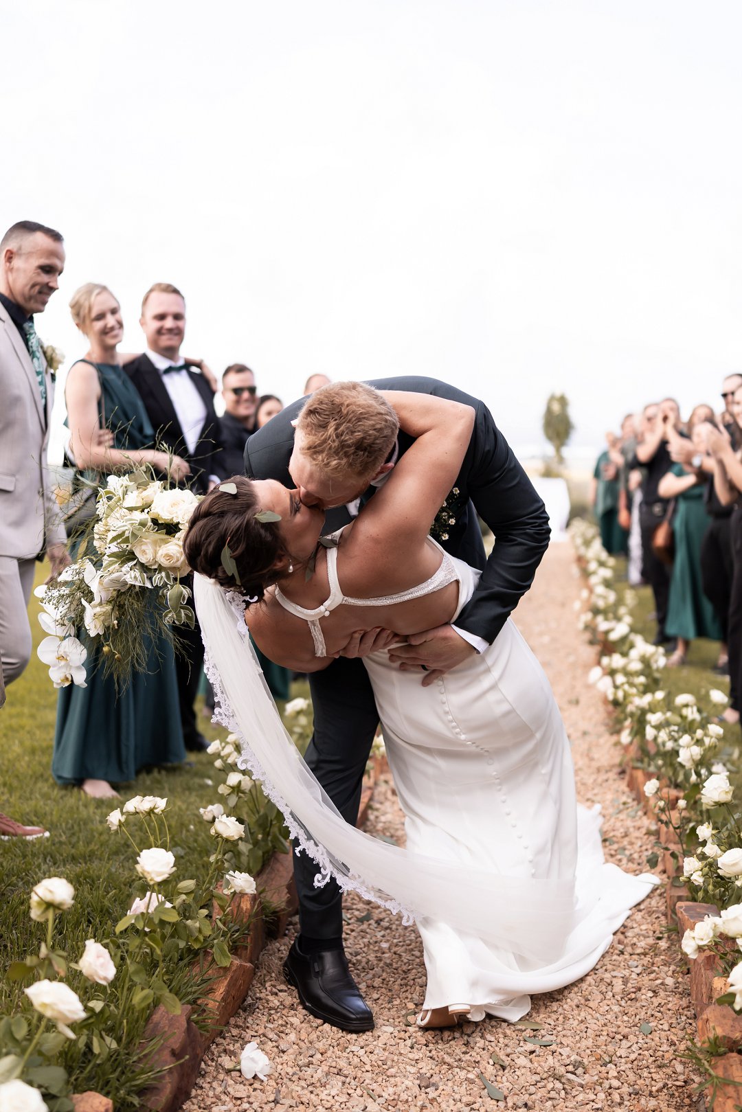Die buitelug seremonie was net so asemrowend omring deur pragtige uitsigte wat nét Mpumalanga kan bied. Die dramatiese wolke in hul troufoto’s het ’n ekstra tikkie magie daaraan bygedra! Ná die seremonie het die paartjie dadelik hul troukoek saam gesny. Dit was ’n spesiale oomblik vir hul gaste. Ook ’n slim manier om almal se aandag op die koek te fokus. Die elegante, minimalistiese troukoek met twee lae was versier met fyn wit blommetjies en ’n subtiele patroon vir ekstra tekstuur.