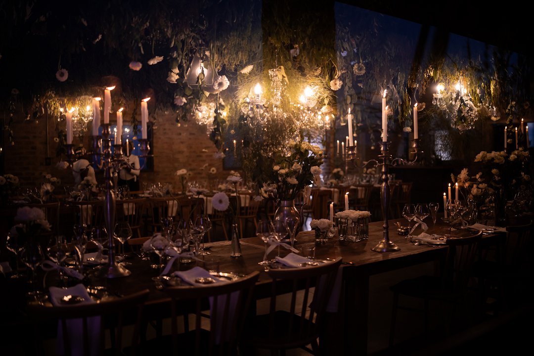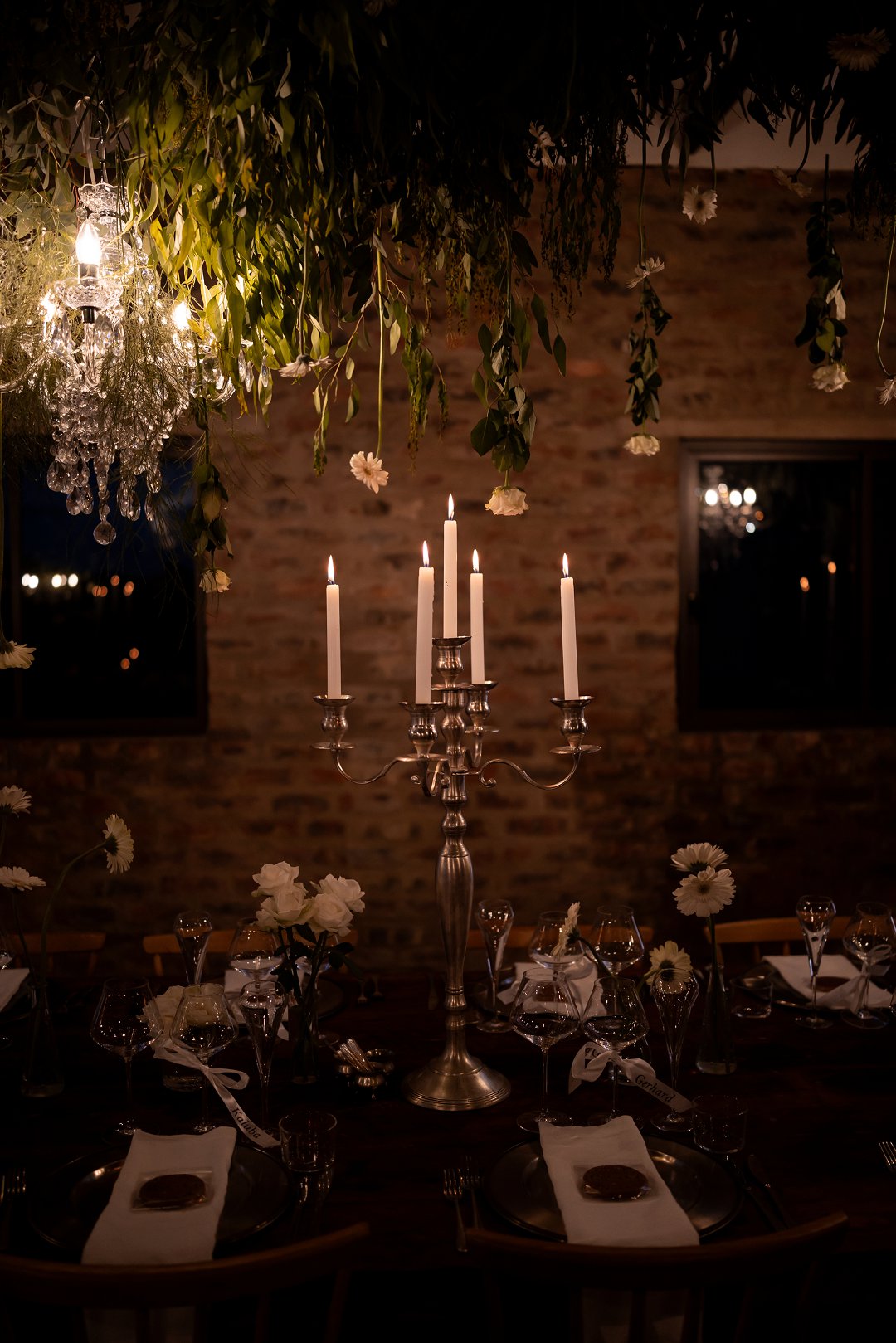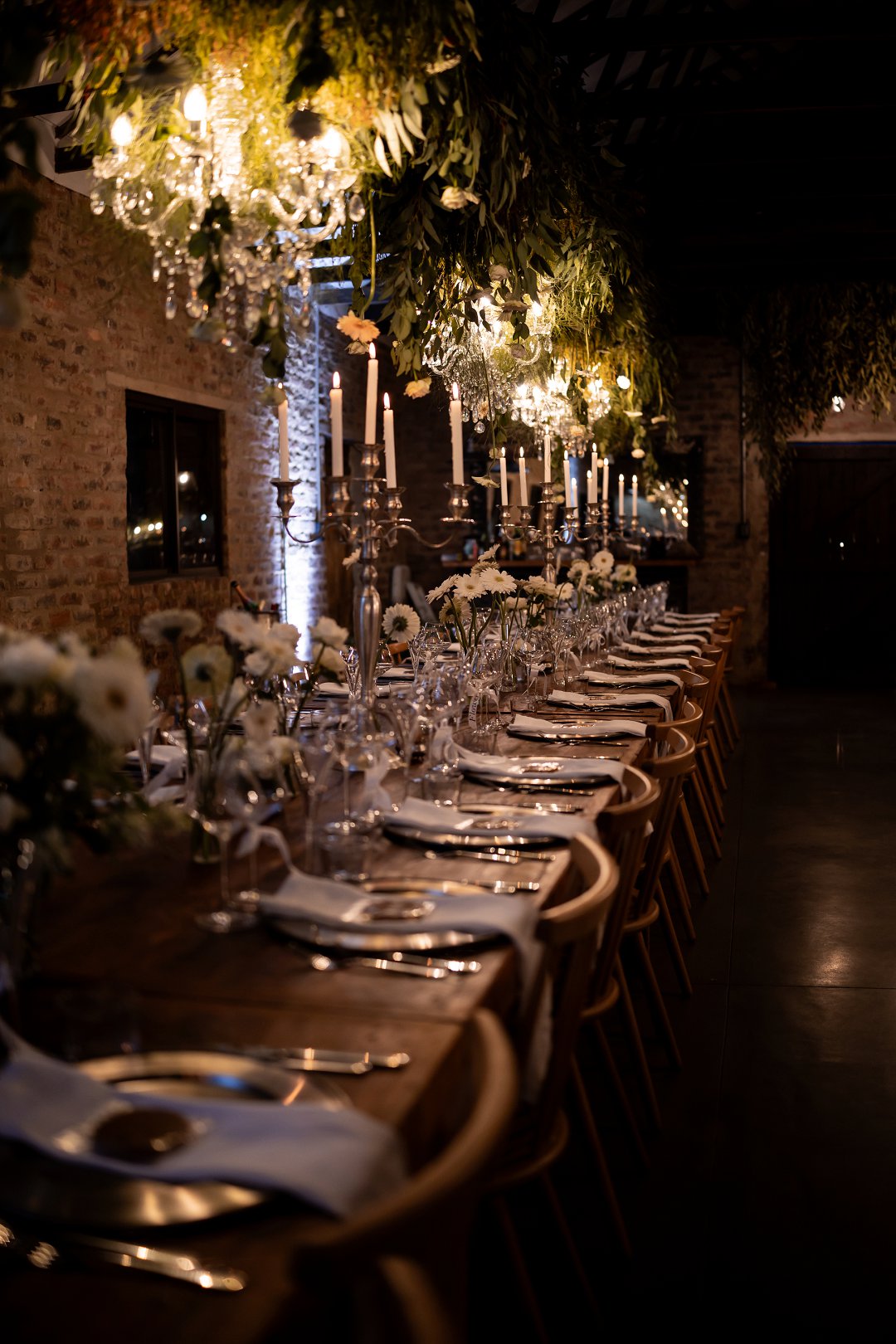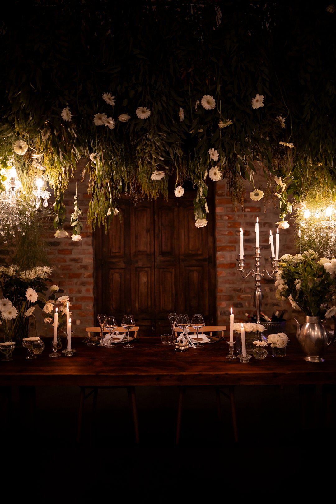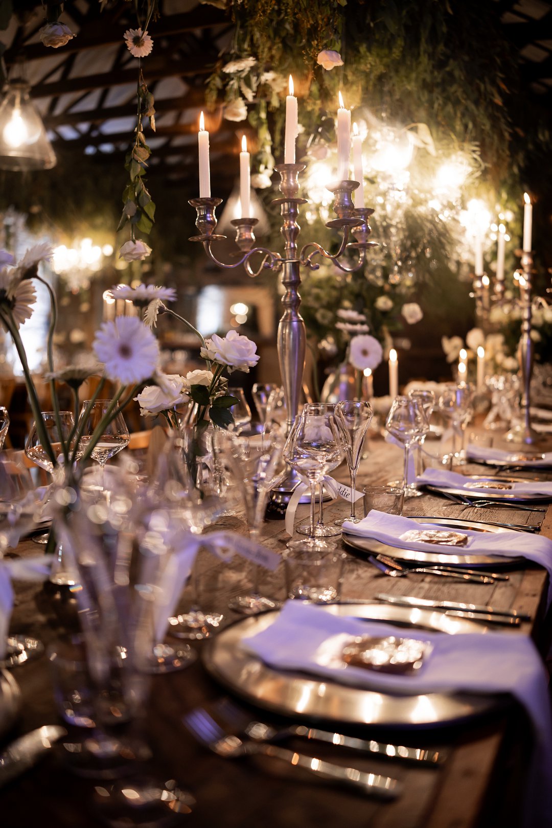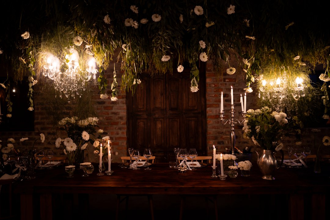 Die trou venue was ’n ware sprokieswêreld met groen kranse wat vanaf donker houtbalke gehang het. Trosse wit blomme het pragtig daarmee saamgesmelt, bo en op die lang houttafels, vir ’n romantiese en effens rustieke gevoel. Groot silwer kandelare met wit kerse het ’n elegante en intieme atmosfeer geskep, perfek balanseer tussen formaliteit en ontspanne warmte.
