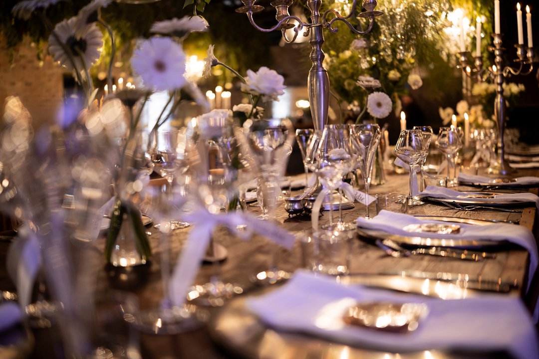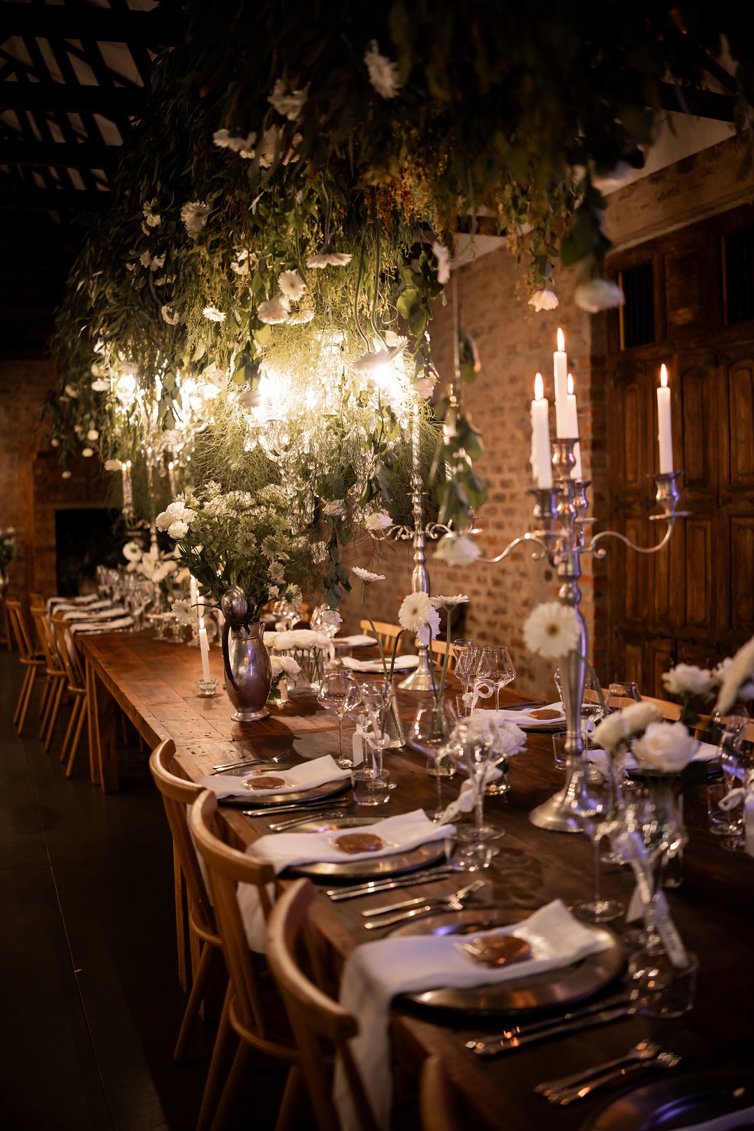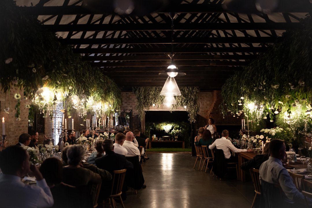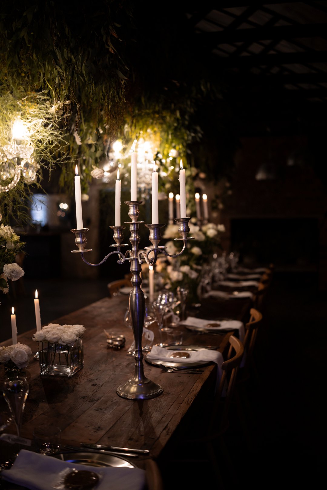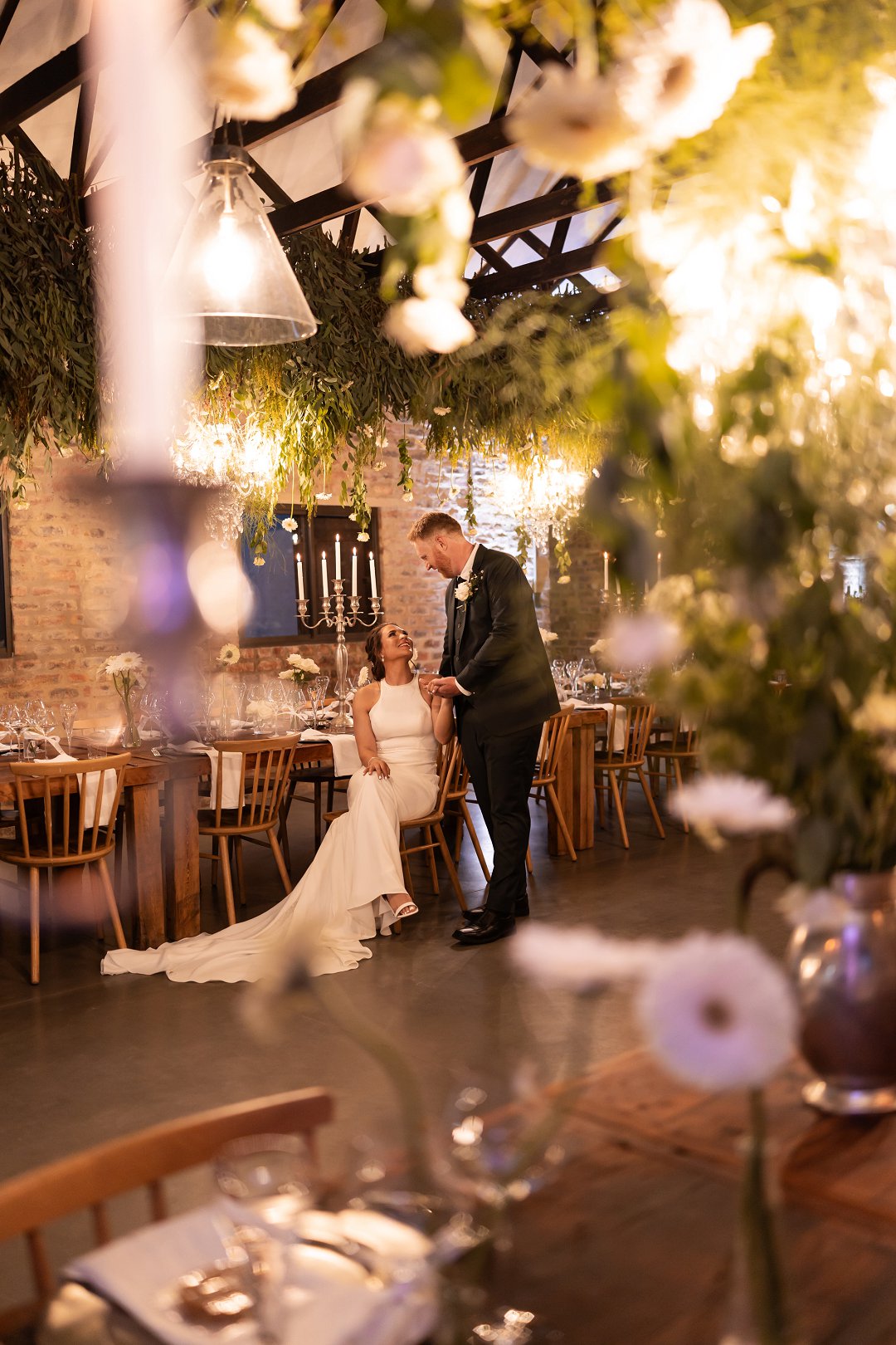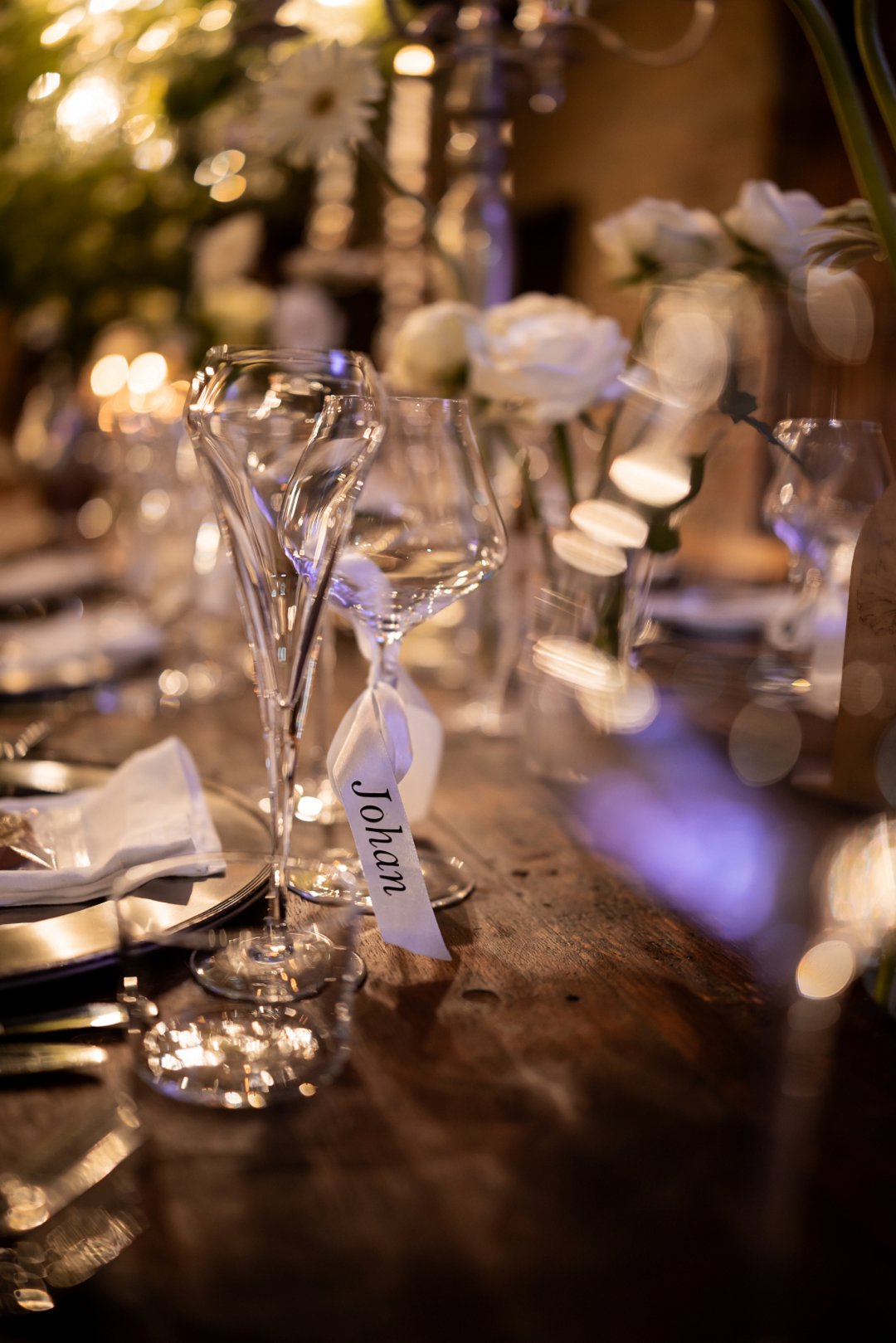 Die trou venue was ’n ware sprokieswêreld met groen kranse wat vanaf donker houtbalke gehang het. Trosse wit blomme het pragtig daarmee saamgesmelt, bo en op die lang houttafels, vir ’n romantiese en effens rustieke gevoel. Groot silwer kandelare met wit kerse het ’n elegante en intieme atmosfeer geskep, perfek balanseer tussen formaliteit en ontspanne warmte.