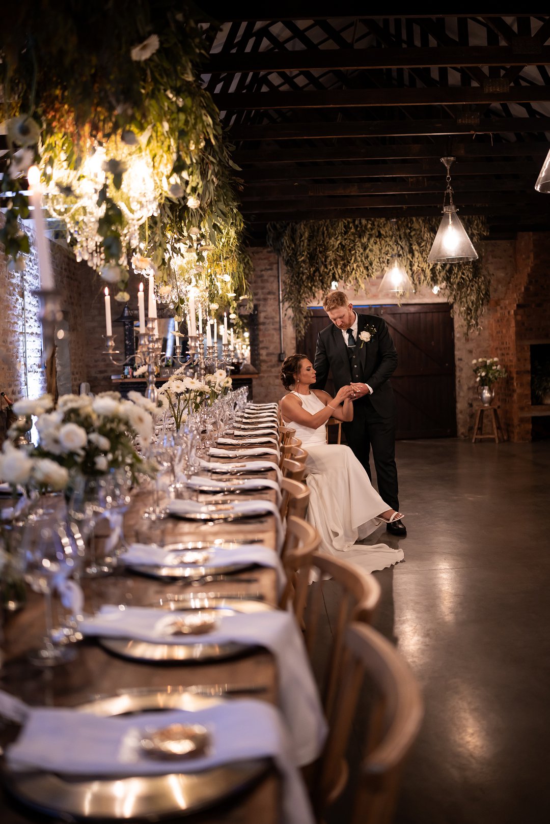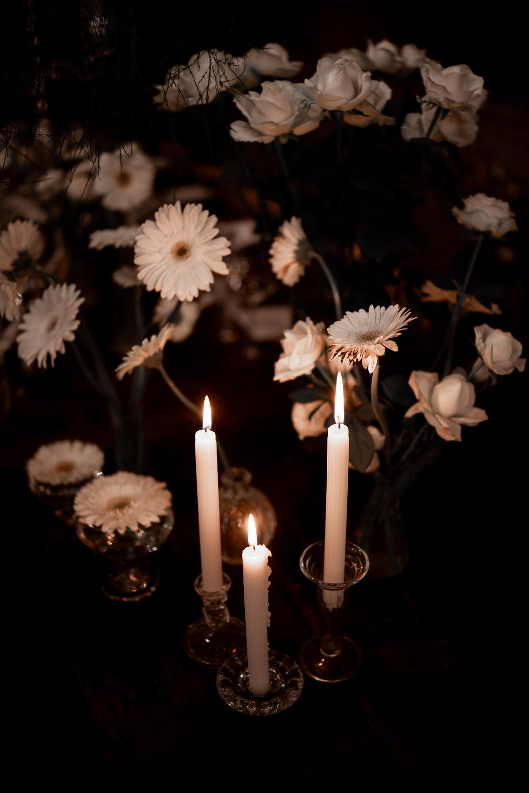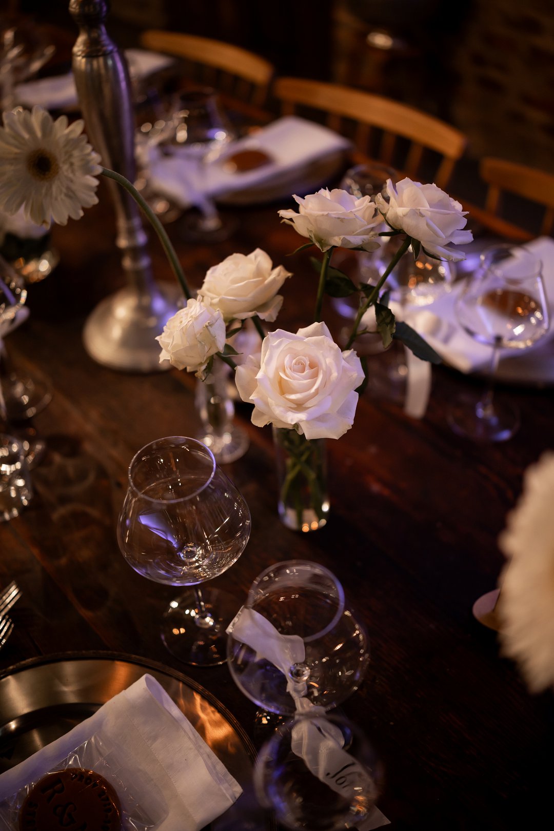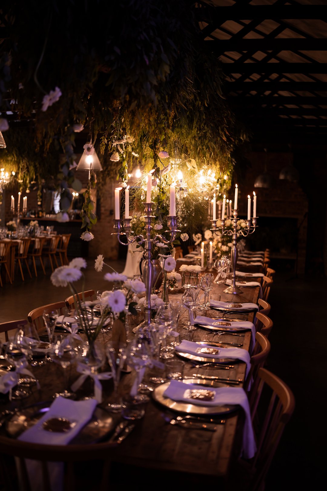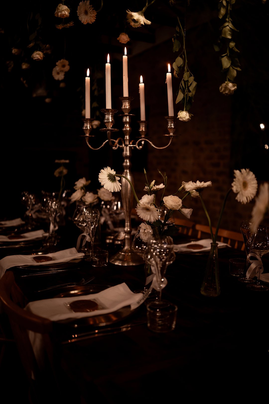 Die trou venue was ’n ware sprokieswêreld met groen kranse wat vanaf donker houtbalke gehang het. Trosse wit blomme het pragtig daarmee saamgesmelt, bo en op die lang houttafels, vir ’n romantiese en effens rustieke gevoel. Groot silwer kandelare met wit kerse het ’n elegante en intieme atmosfeer geskep, perfek balanseer tussen formaliteit en ontspanne warmte.