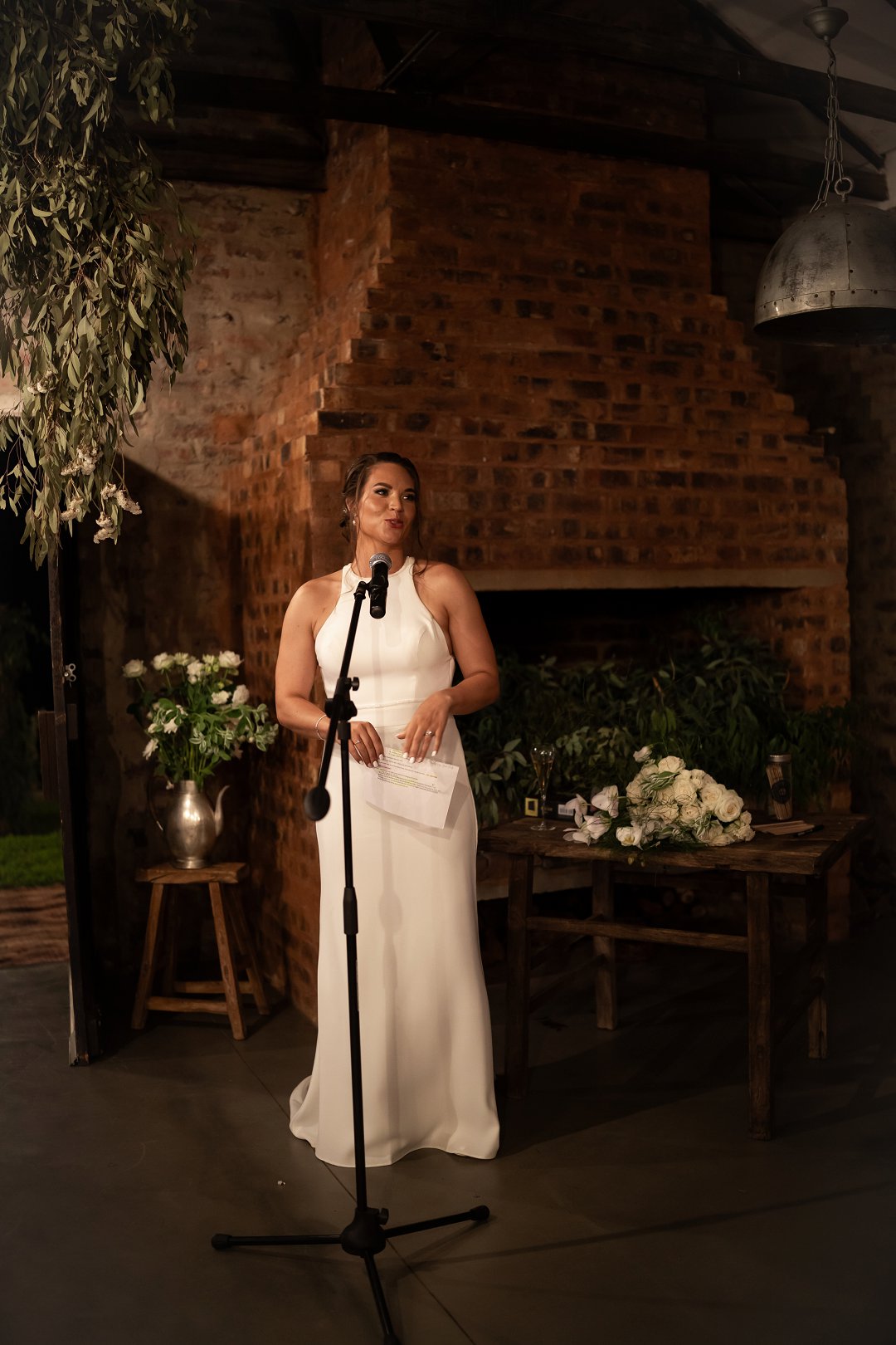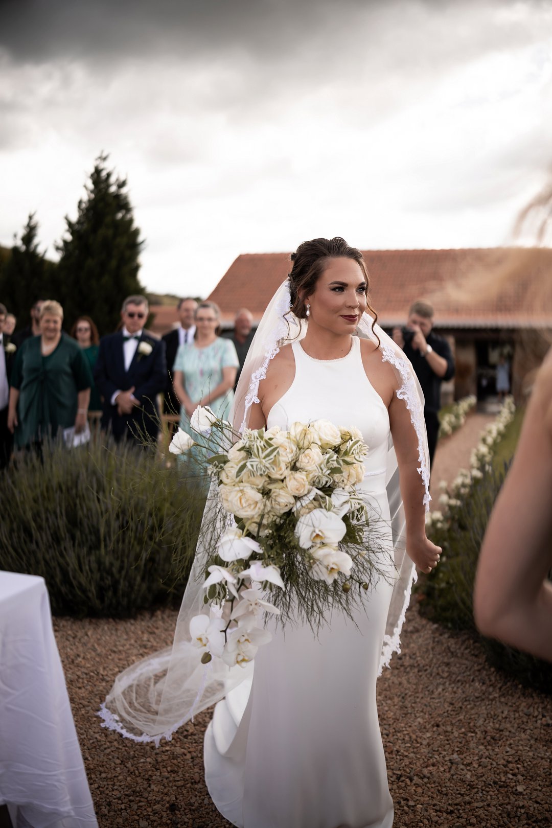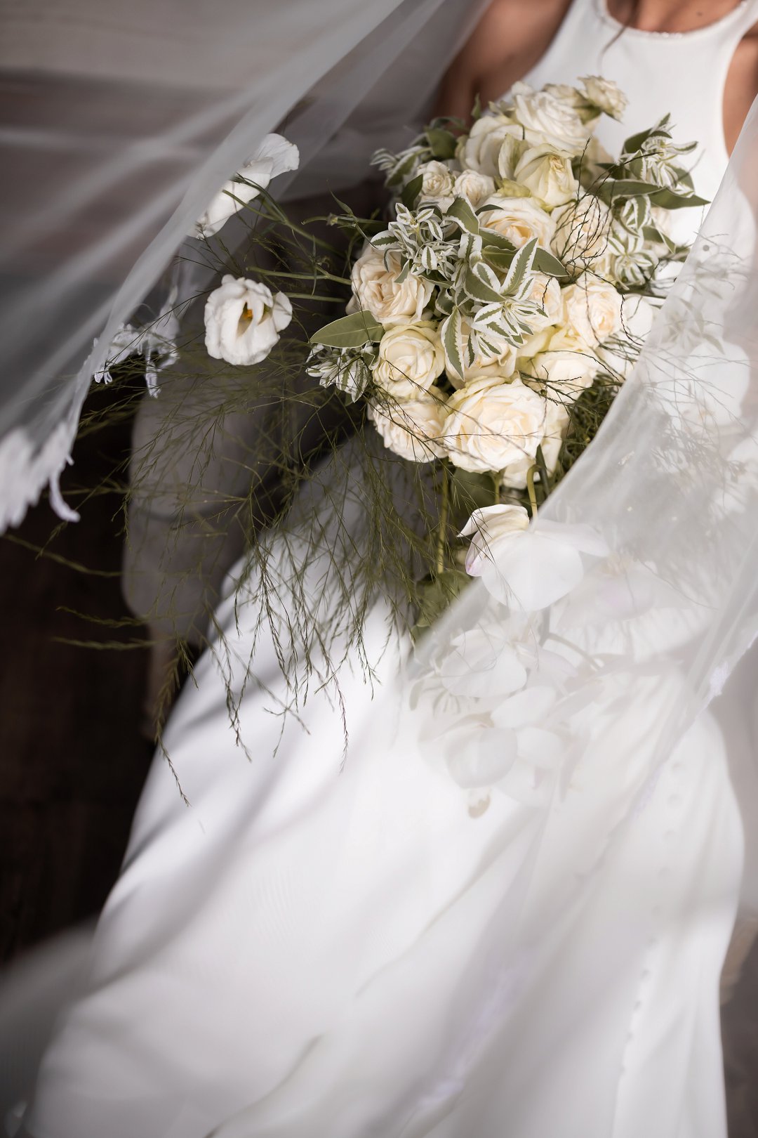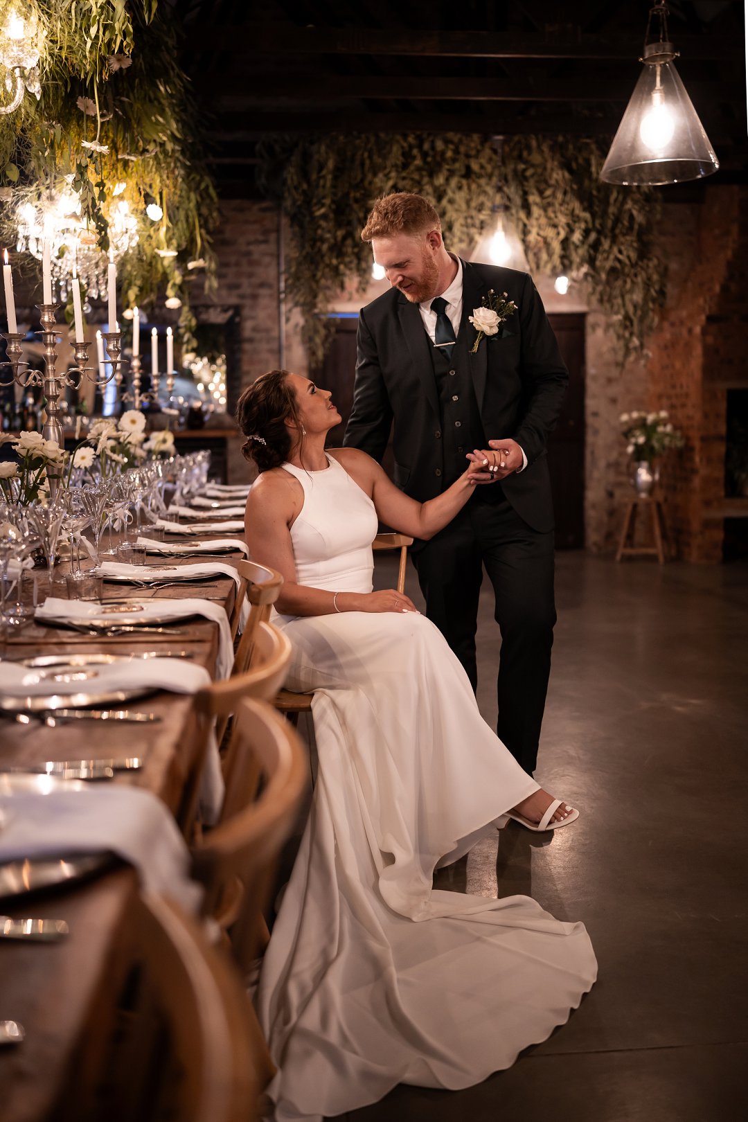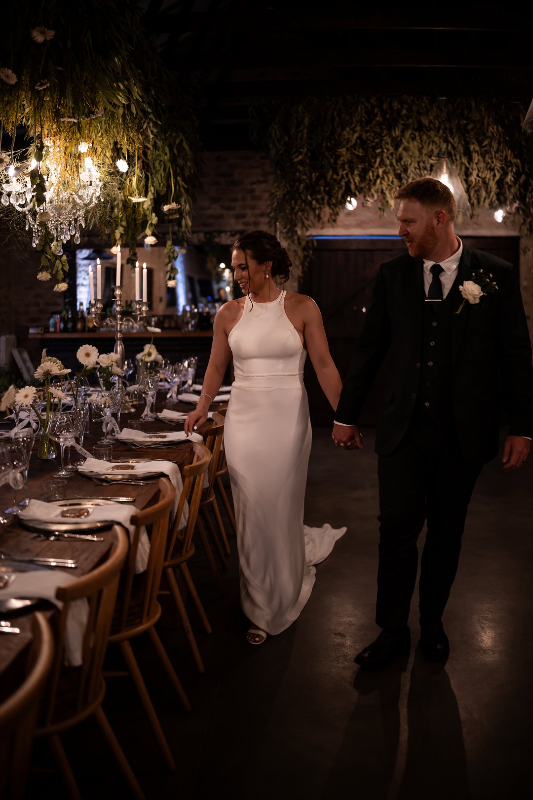 Die trou venue was ’n ware sprokieswêreld met groen kranse wat vanaf donker houtbalke gehang het. Trosse wit blomme het pragtig daarmee saamgesmelt, bo en op die lang houttafels, vir ’n romantiese en effens rustieke gevoel. Groot silwer kandelare met wit kerse het ’n elegante en intieme atmosfeer geskep, perfek balanseer tussen formaliteit en ontspanne warmte.