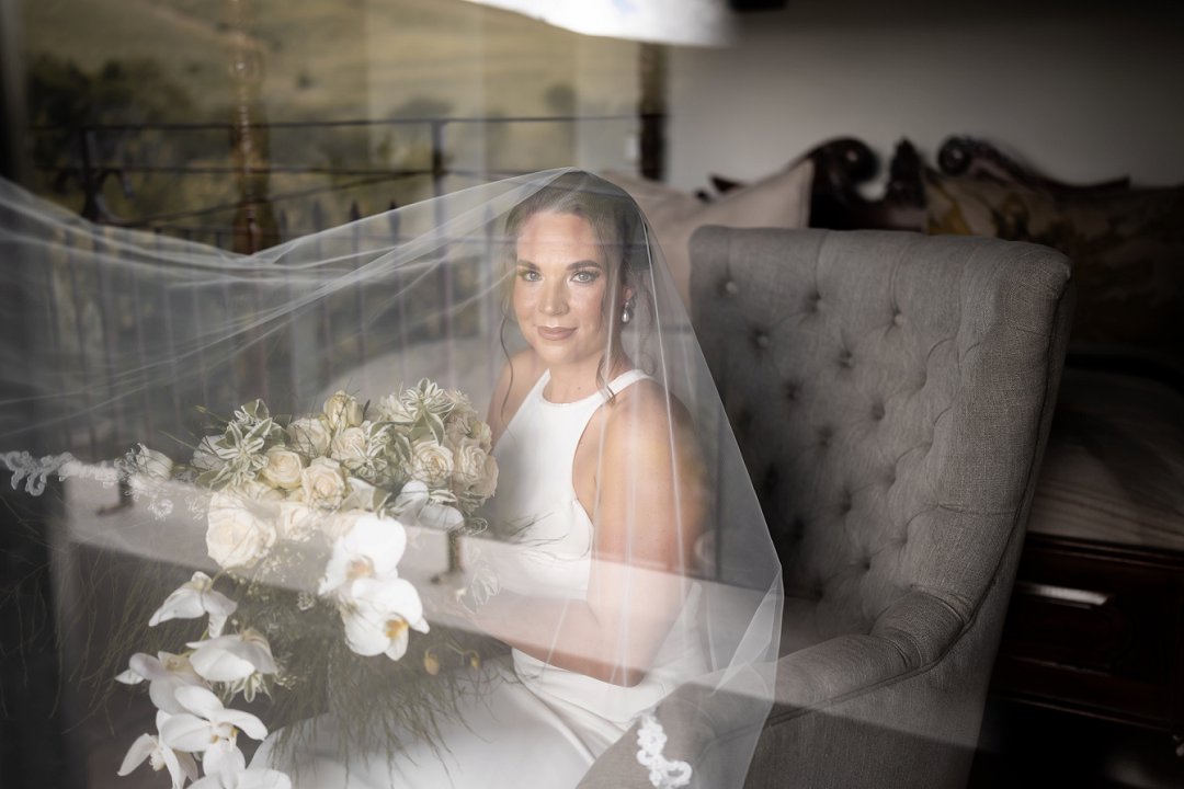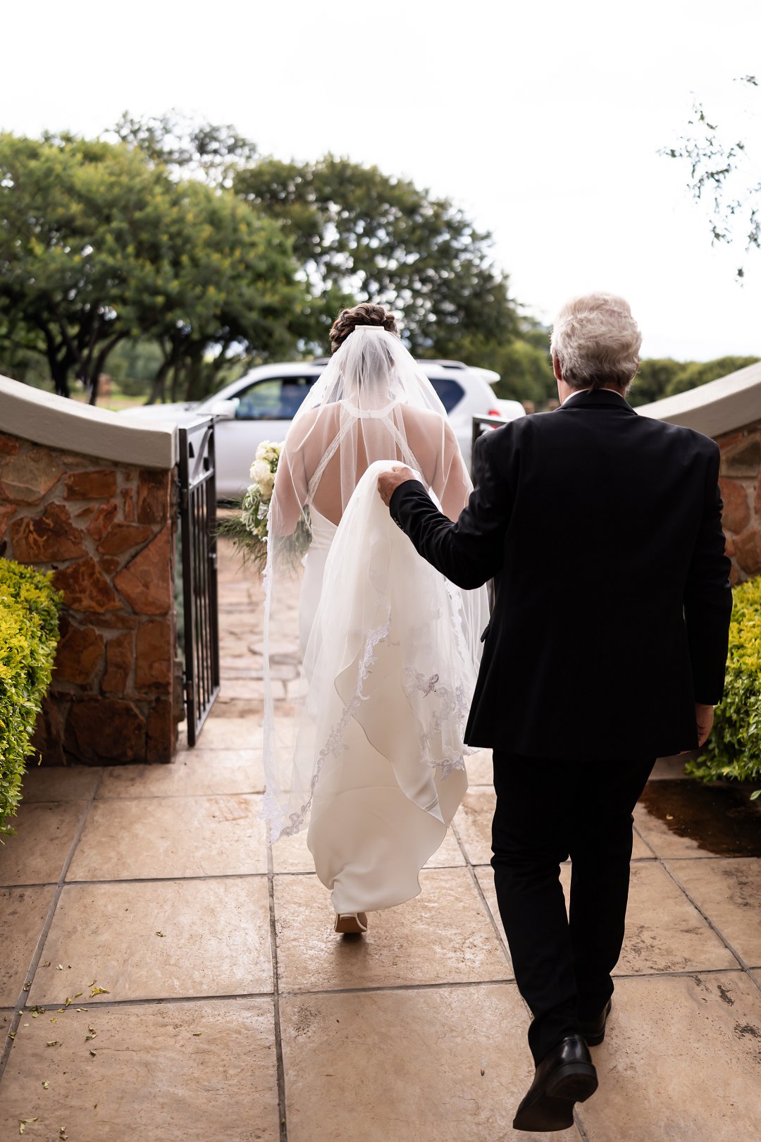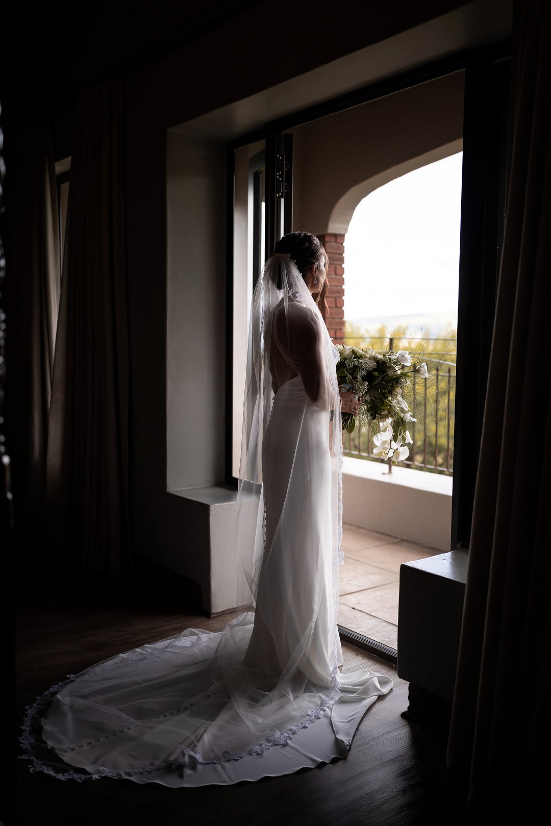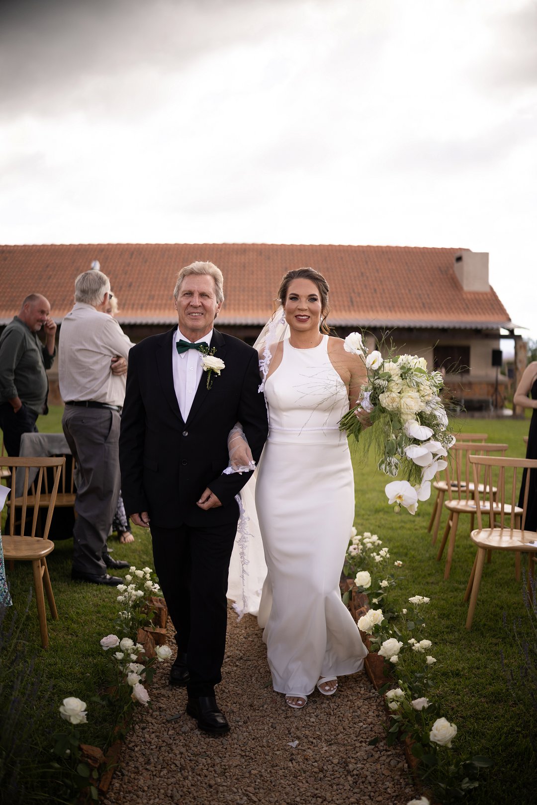 Melissa het beeldskoon gelyk in haar trourok van Timeless Bridal Couture. Die semi-meerminrok met ’n oop rug en fyn bandjies was elegant en vol detail. Ruan het self ook besondere indruk gemaak in sy donker troupak.