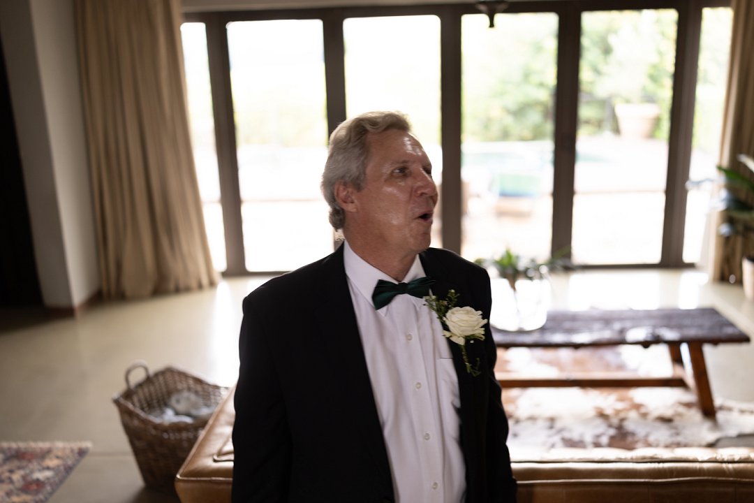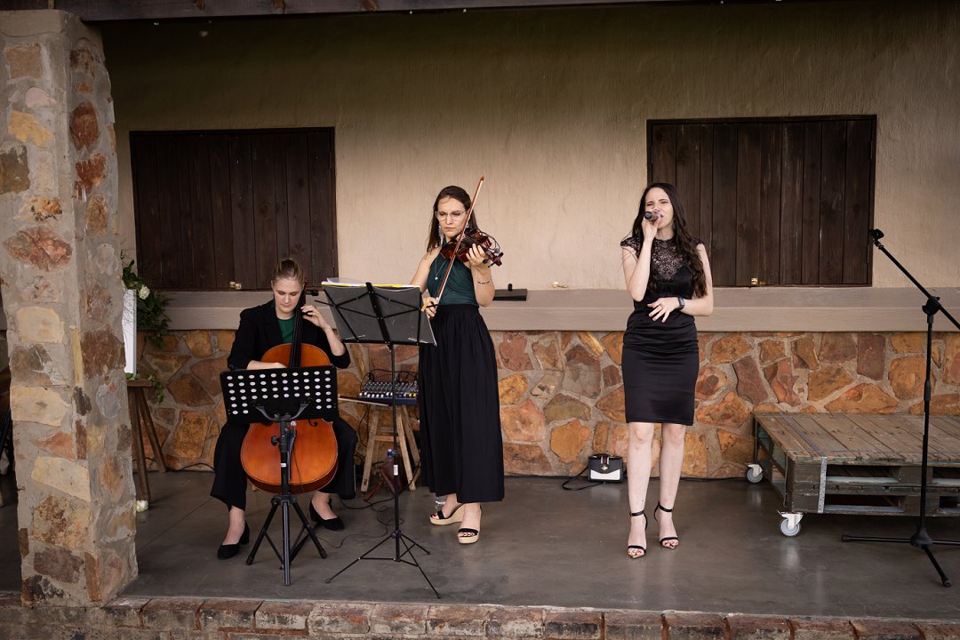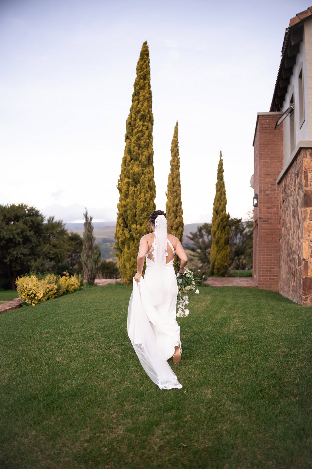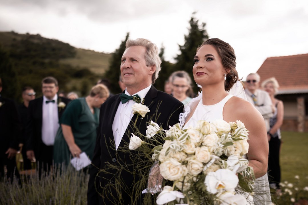 Die trou venue was ‘n stukkie paradys, ‘n plek waar die natuur en liefde saamgevloei het in ‘n betowerende simfonie. Geleë tussen majestueuse berge, omring deur digte groenigheid en die sagte fluistering van die wind, het dit ‘n atmosfeer van vrede en heiligheid geskep. Die smaraggroen kleure van die bruidsgevolg het perfek in die landskap ingevloei. Terwyl die gaste, geklee in aardse kleure van naaswit, grys, houtskool en groen, die natuurlike skoonheid van die omgewing weerspieël het. Die seremonie en onthaal, eenvoudig maar buitengewoon, was ‘n ode aan die suiwerheid van die natuur met wit en groen as die enigste dekor, ‘n simboliese viering van God se skepping en die liefde wat in hierdie idilliese plek gevier is.