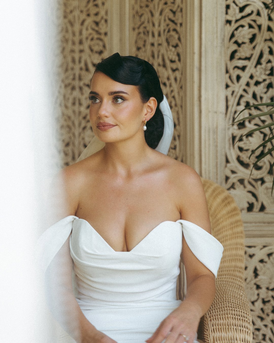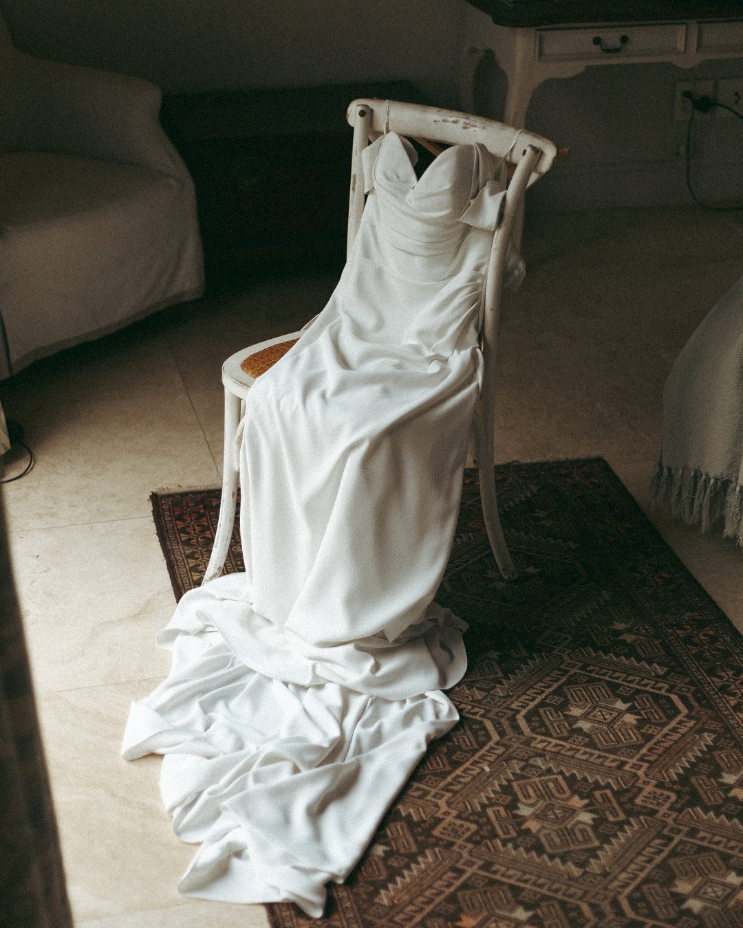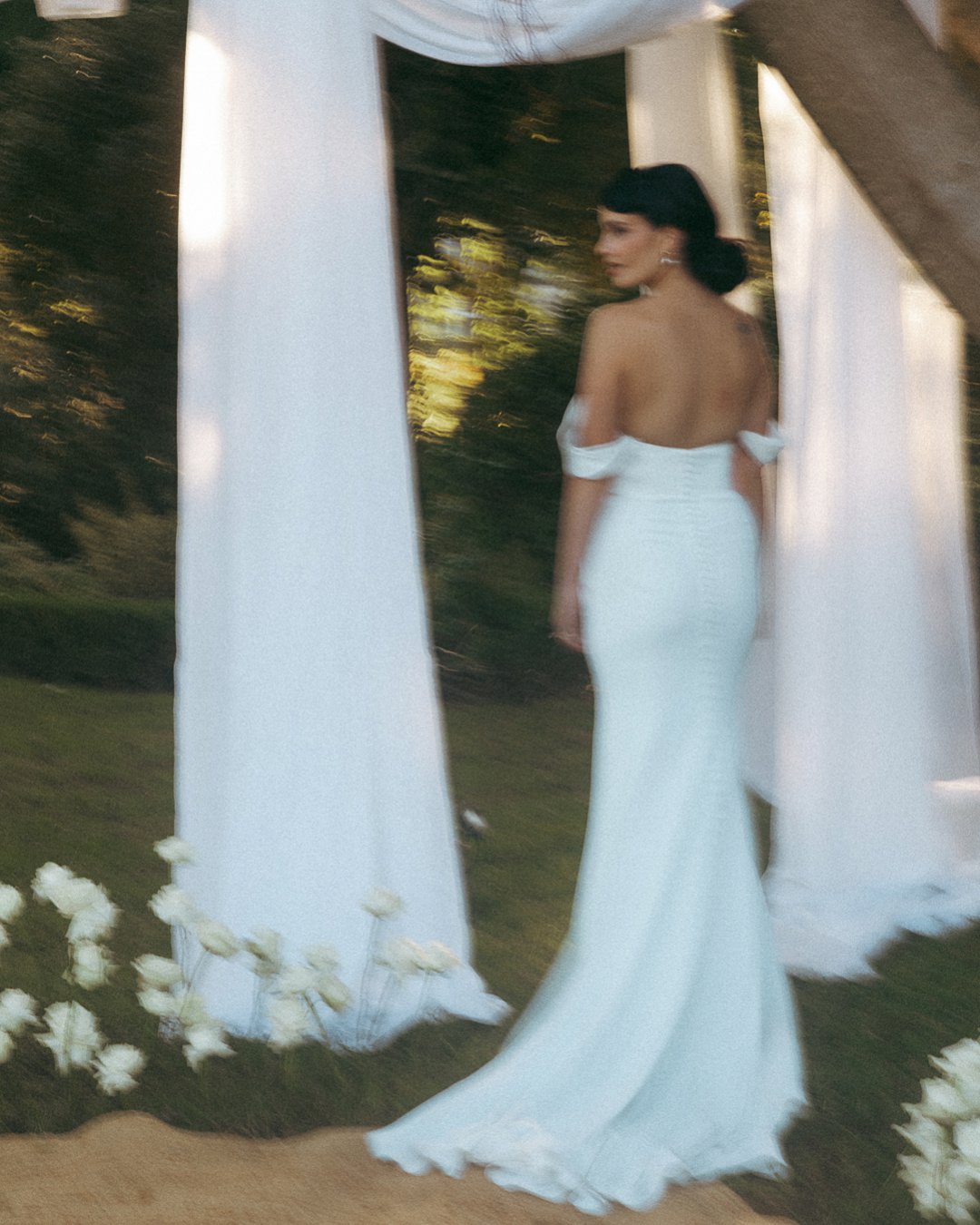 Vervaardig van luukse spierwit rek-georgette, was die Aiden-rok elegant en ongelooflik gemaklik. Dit het ’n slanke pasvorm en uitlopende silhoeët gehad wat my liggaam op al die regte plekke omhels het, met delikate plooiing langs die hartvormige halslyn en ’n ry knopies wat langs die sleep afloop. Die lae rug-uitsny het ’n bietjie drama bygevoeg, en ek was mal oor die afhaalbare skouermoue wat die rok twee verskillende voorkomste in een gegee het. Dit was modern, romanties en tydloos! Alles waarna ek nie geweet het ek soek nie, maar presies wat ek wou hê.