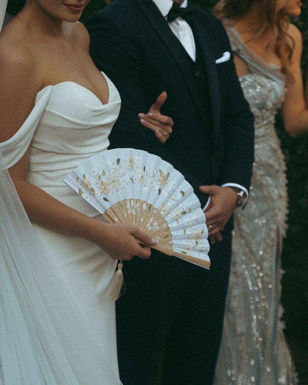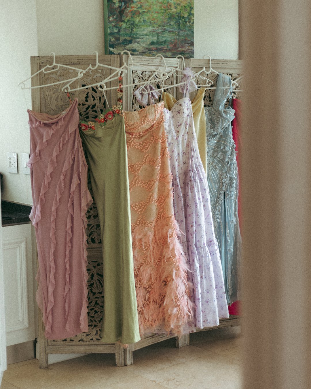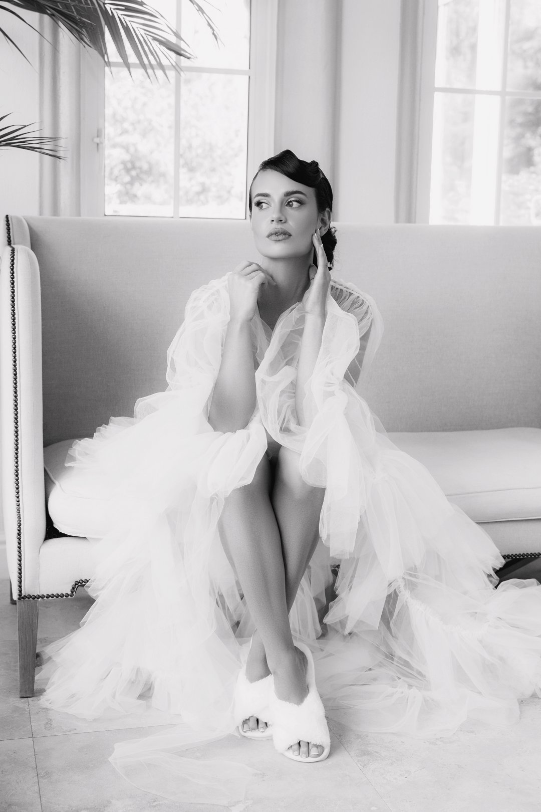 Vervaardig van luukse spierwit rek-georgette, was die Aiden-rok elegant en ongelooflik gemaklik. Dit het ’n slanke pasvorm en uitlopende silhoeët gehad wat my liggaam op al die regte plekke omhels het, met delikate plooiing langs die hartvormige halslyn en ’n ry knopies wat langs die sleep afloop. Die lae rug-uitsny het ’n bietjie drama bygevoeg, en ek was mal oor die afhaalbare skouermoue wat die rok twee verskillende voorkomste in een gegee het. Dit was modern, romanties en tydloos! Alles waarna ek nie geweet het ek soek nie, maar presies wat ek wou hê.