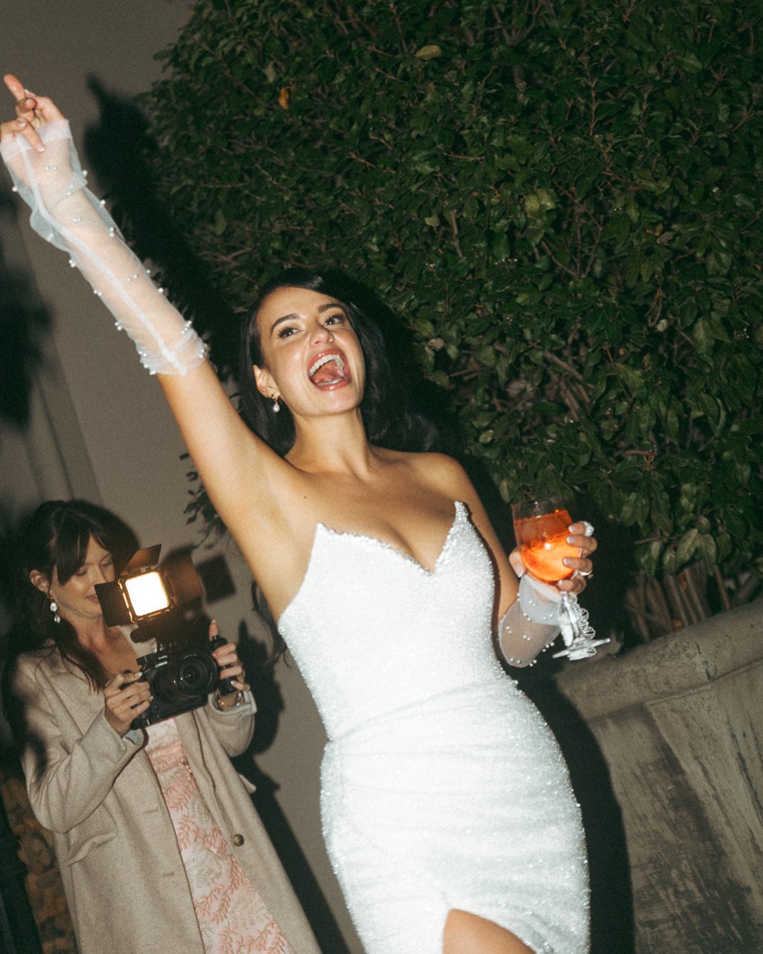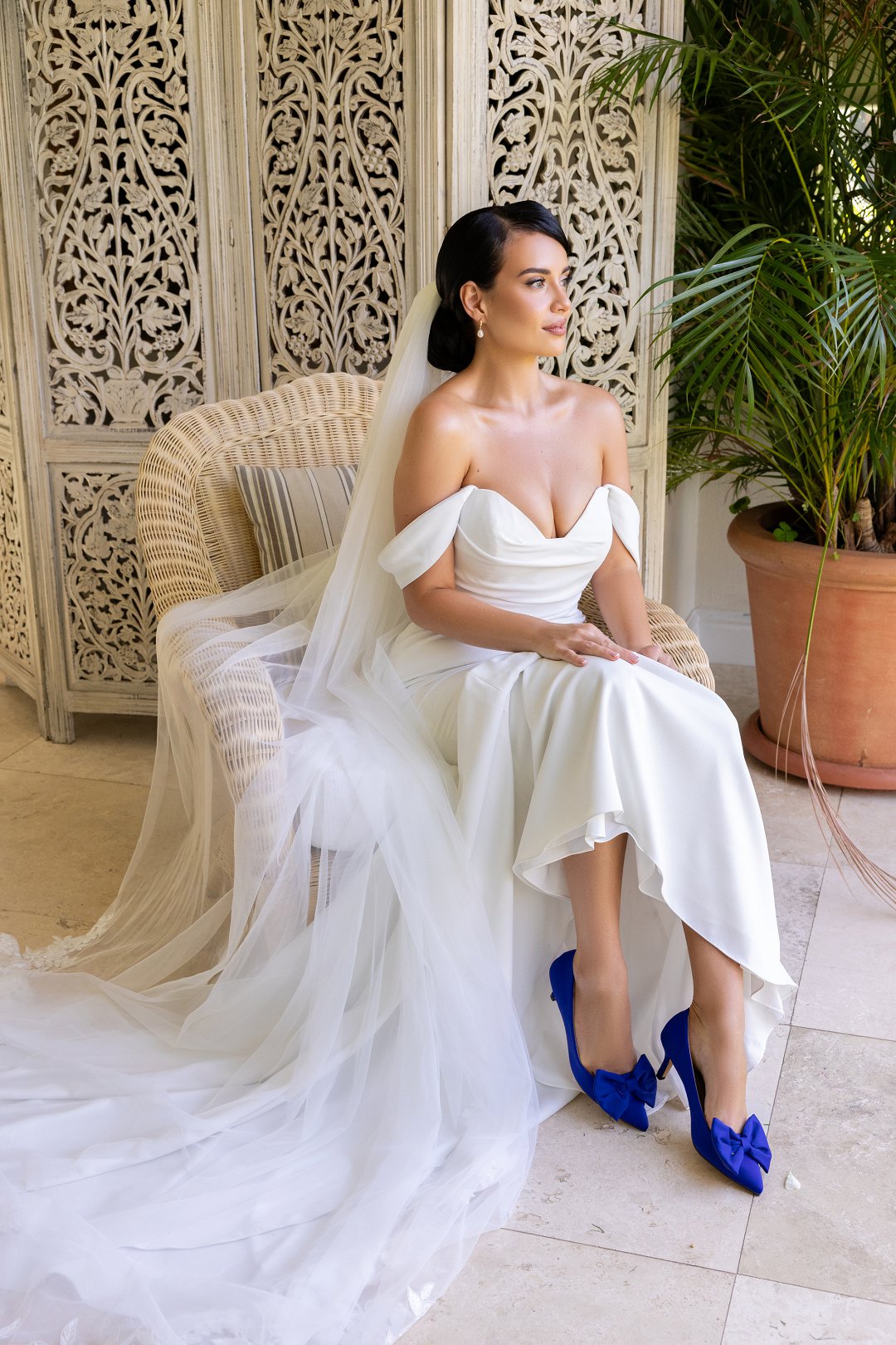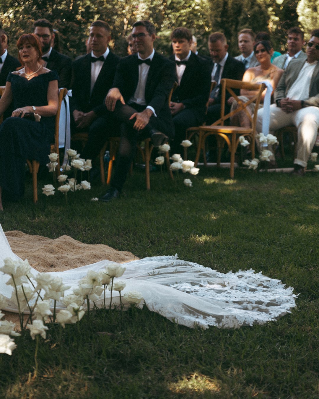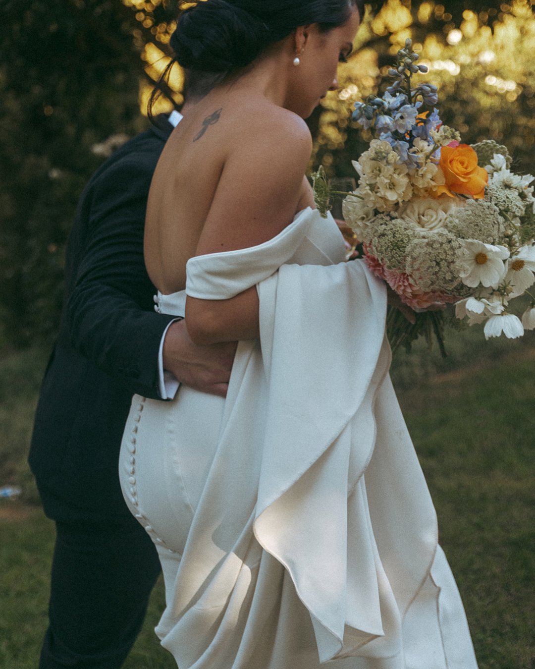Natuurlik het alles nie seepglad verloop nie. Alexandra moes 17 trourokke aanpas voordat sy dié perfekte een gevind het. Die rok, gemaak van ’n luukse rekbare materiaal, was nie net elegant nie, maar ook ongelooflik gemaklik, vertel sy. Afhaalbare moue,’n gewilde neiging deesdae, het vir haar twee verskillende voorkomste moontlik gemaak.