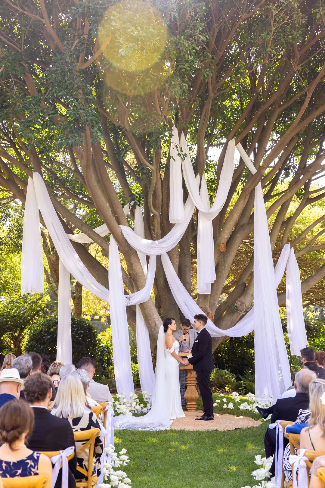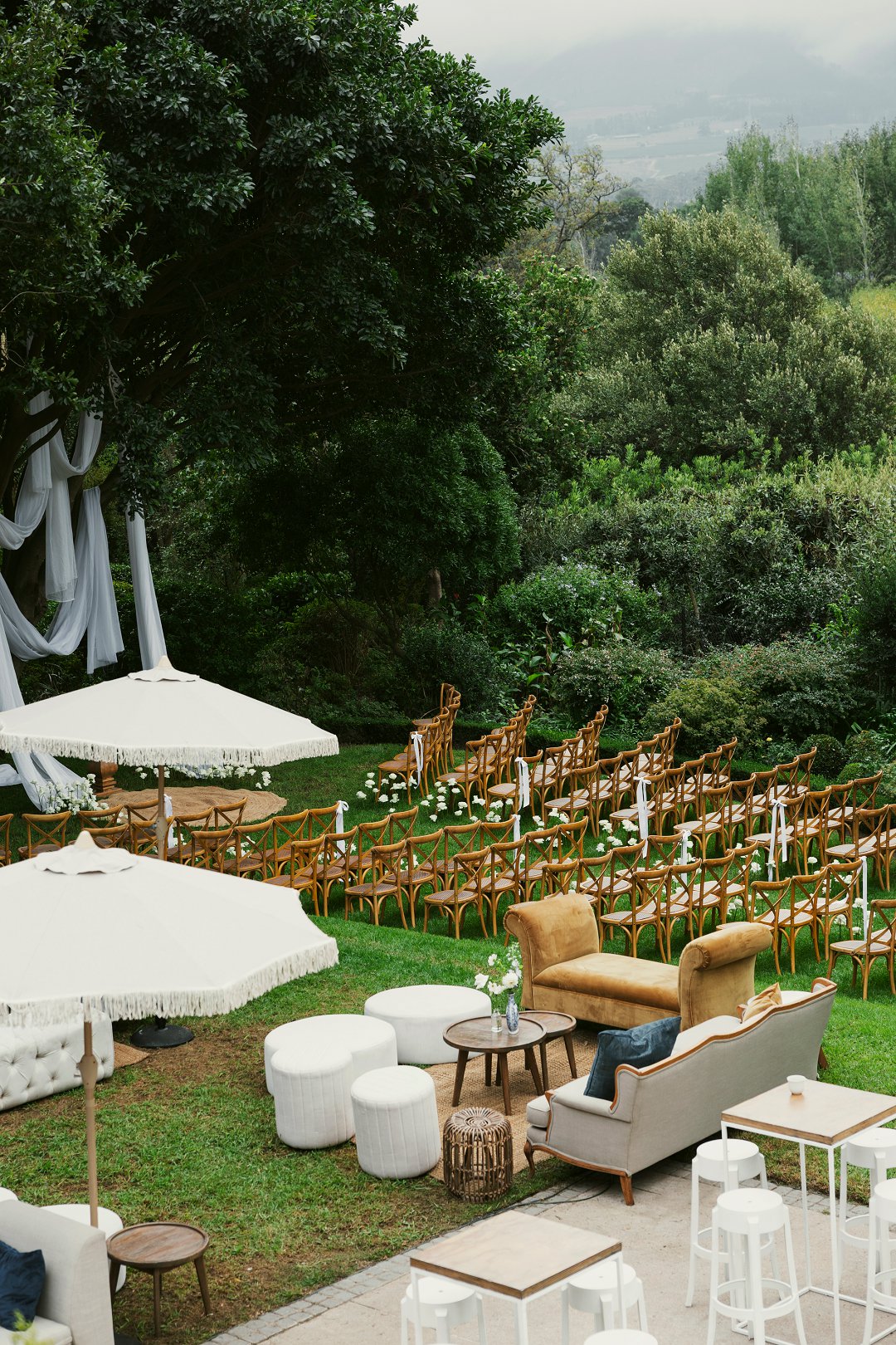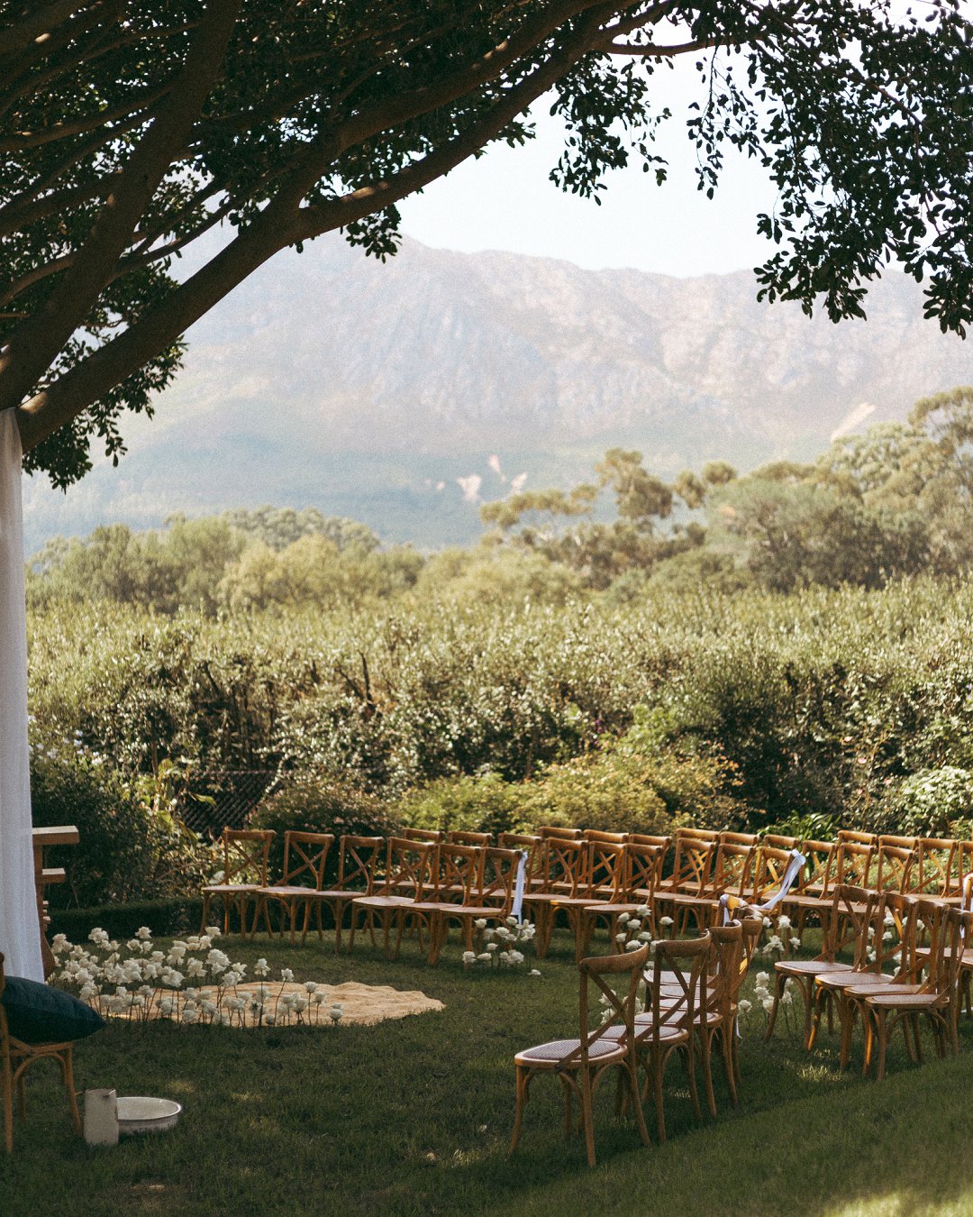 Van die begin af het ons geweet ons wil ’n buitelug troue hê. Ons droom was om onder ’n groot boom te trou, omring deur die natuur, met iets heiligs en gegrond in die hart daarvan. Ons het ’n paar plekke besigtig, maar toe ons Sandstone House in Franschhoek sien, het ons net geweet. Soos jy instap, is daar hierdie ongelooflike boom buite wat ons harte onmiddellik gesteel het, en die venue self het ’n statige herehuis-styl met ’n Toskaanse plattelandse gevoel uitgestraal.