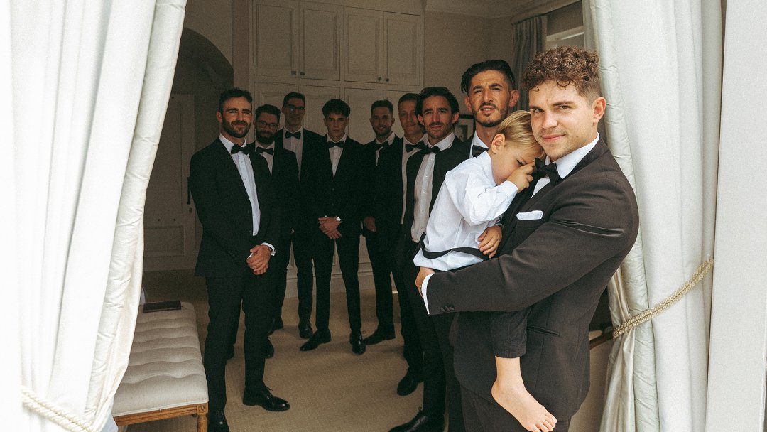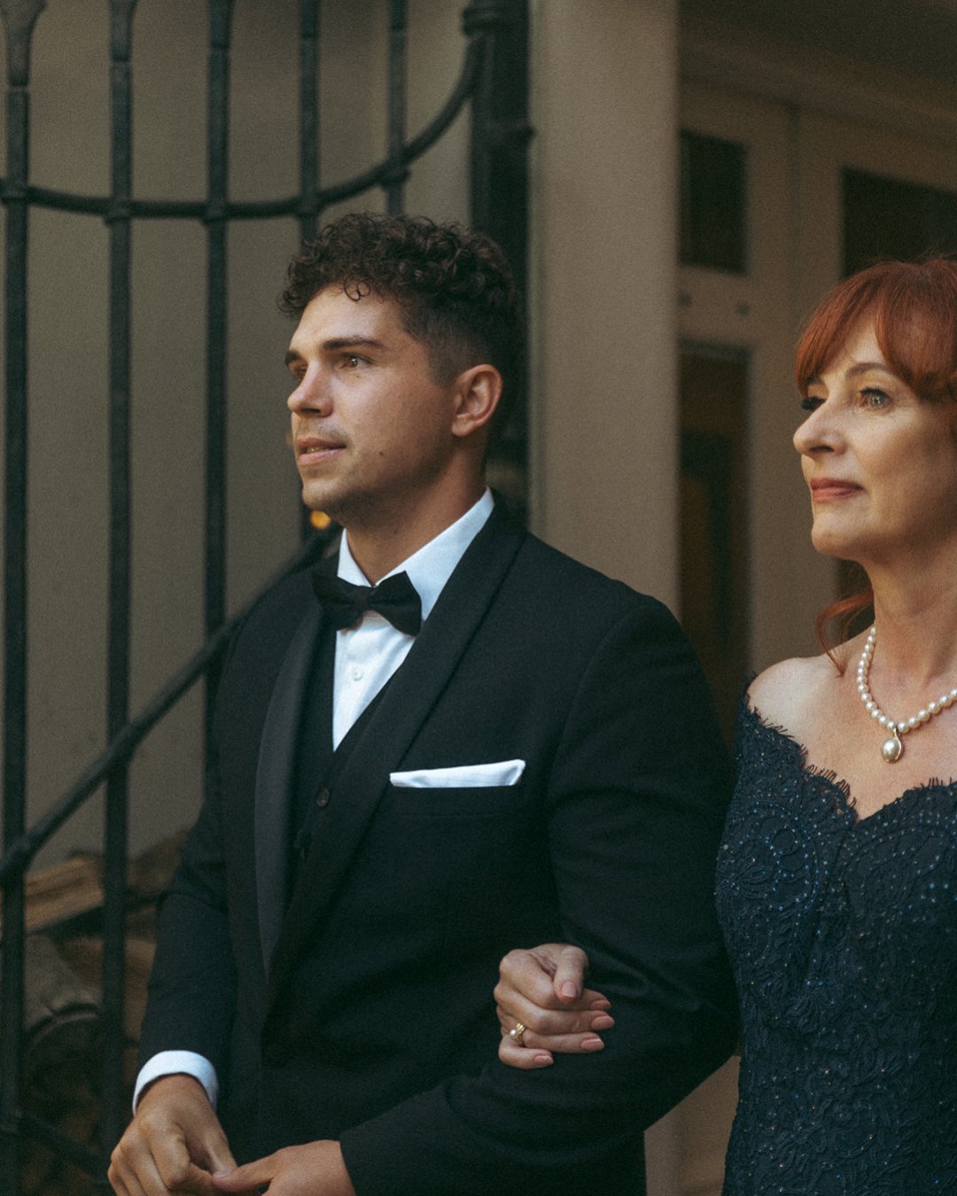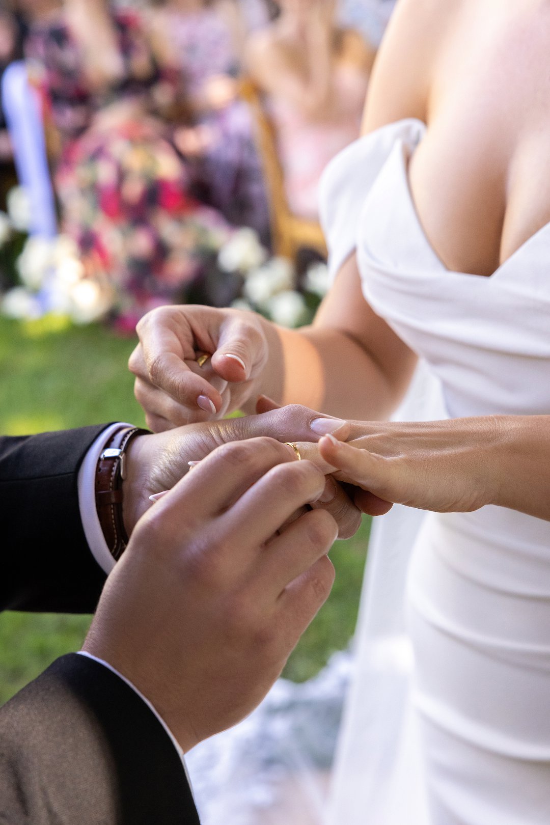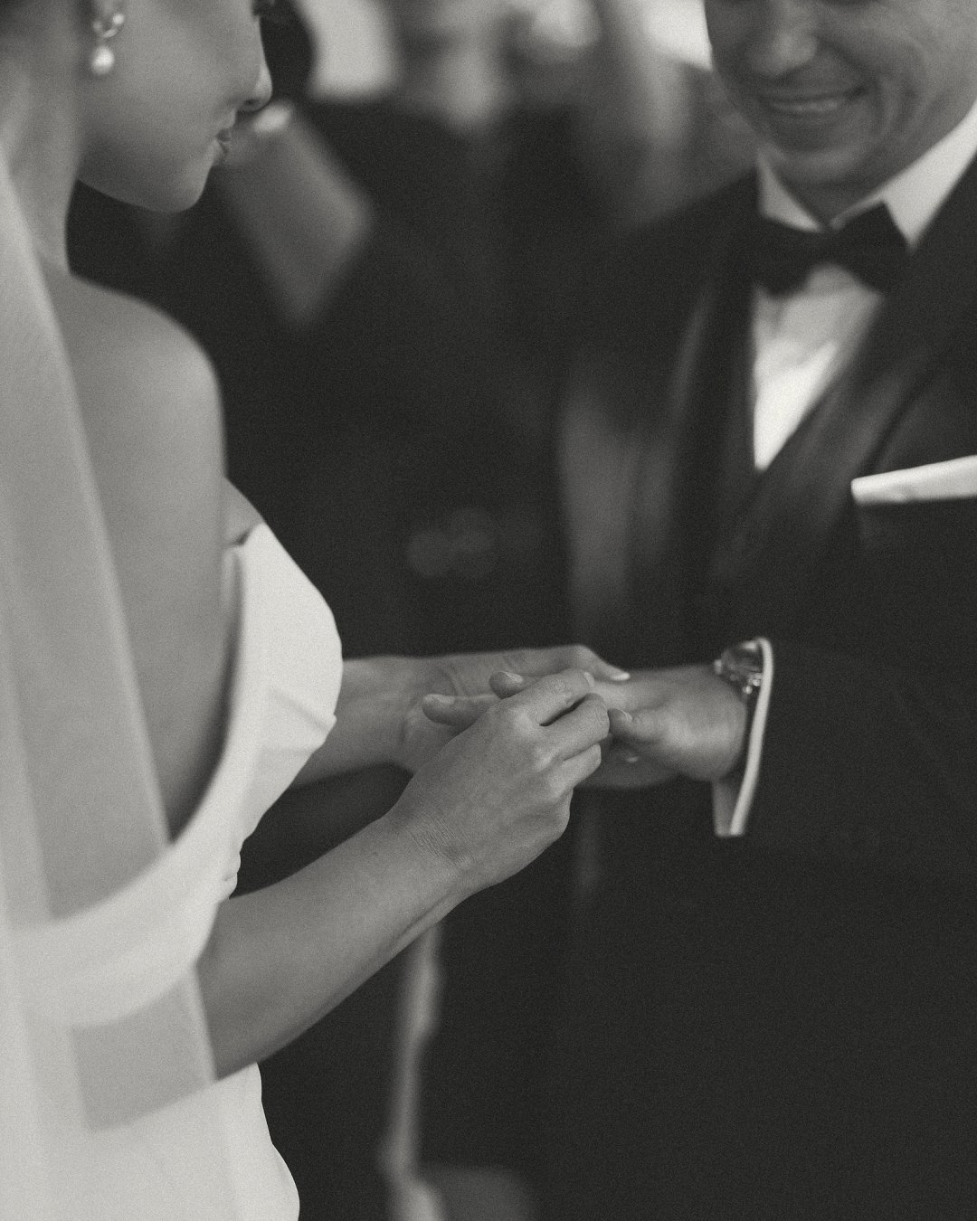 Vir my trouring het ek ’n eenvoudige, gladde goue ring gekies om die verloofring te laat skitter, terwyl dit op die mees subtiele en pragtige manier daarmee saamgaan. Gustaf het ook ’n klassieke goue ring gekies, maar ek het ’n verrassing bygevoeg. Aan die binnekant het ek die woorde “Forever bound, my heart to yours” laat graveer as ’n persoonlike knik na ons liefde en sy gunsteling, Lord of the Rings. Dit is ons stil, klein belofte weggesteek in iets wat hy elke dag sal dra.
