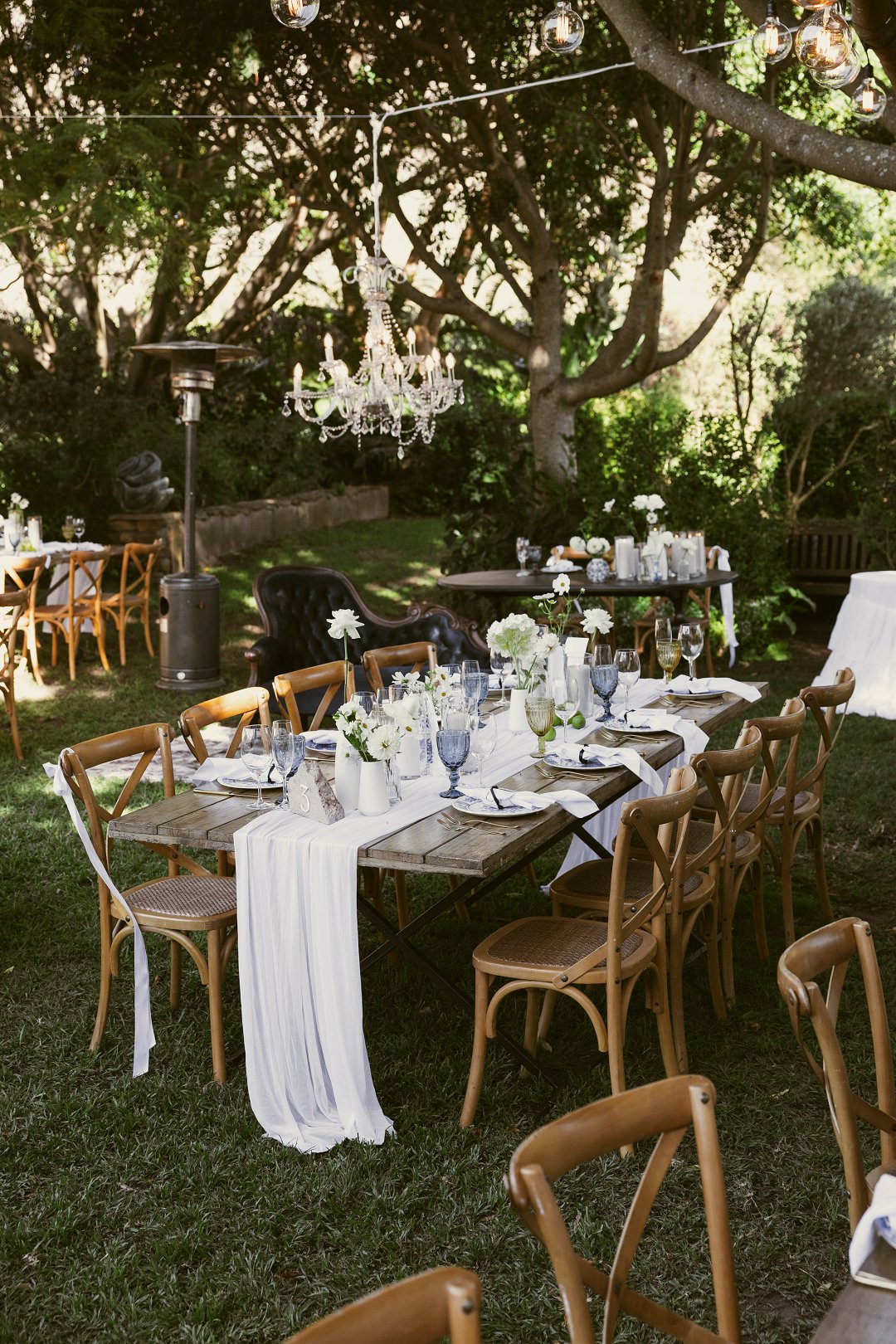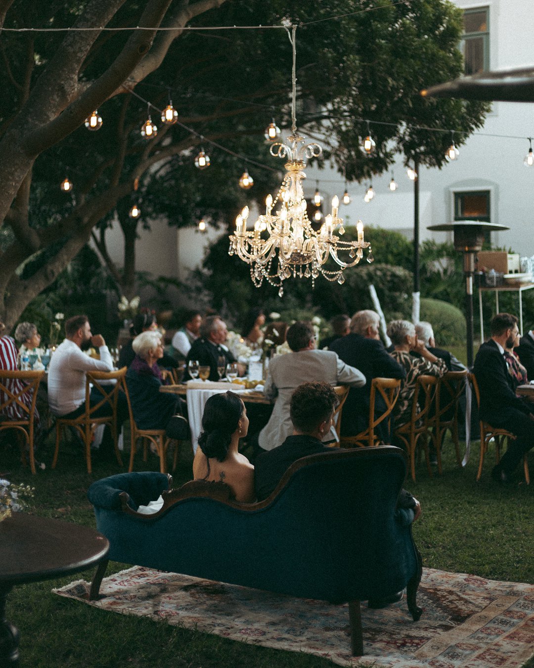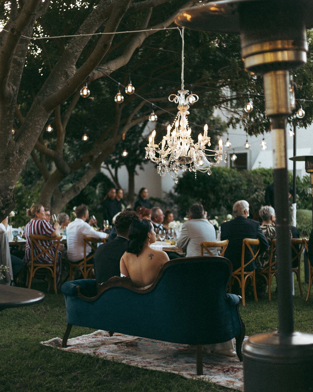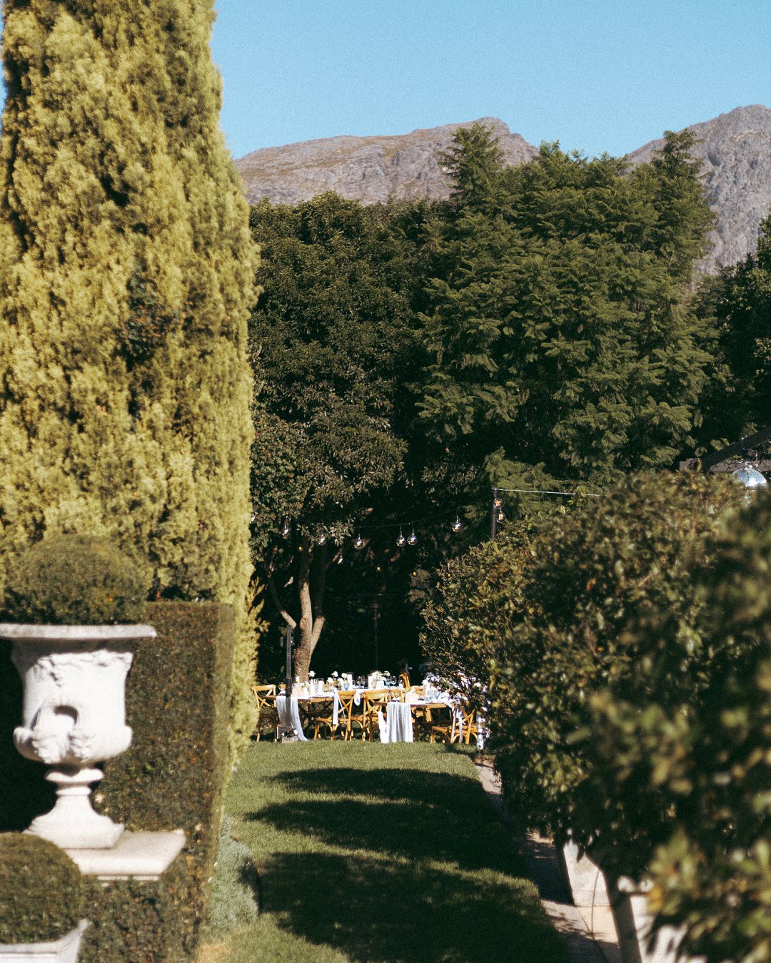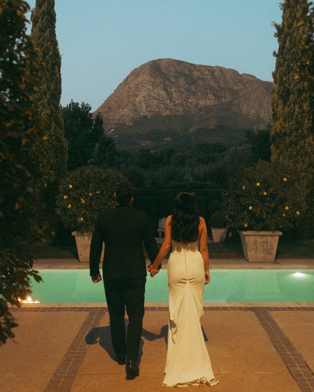 Die seremonie het onder daardie pragtige boom plaasgevind, en van daar af het gaste verby die swembad na die buitelug-onthaal beweeg. Dit was vir my regtig belangrik om onder die sterre te eet. Ek wou daardie magie van ’n warm aand, skitterende liggies, goeie kos en al ons geliefdes op een plek saam hê. Dit was presies waarvan ek gedroom het romanties, betekenisvol en onvergeetlik.
