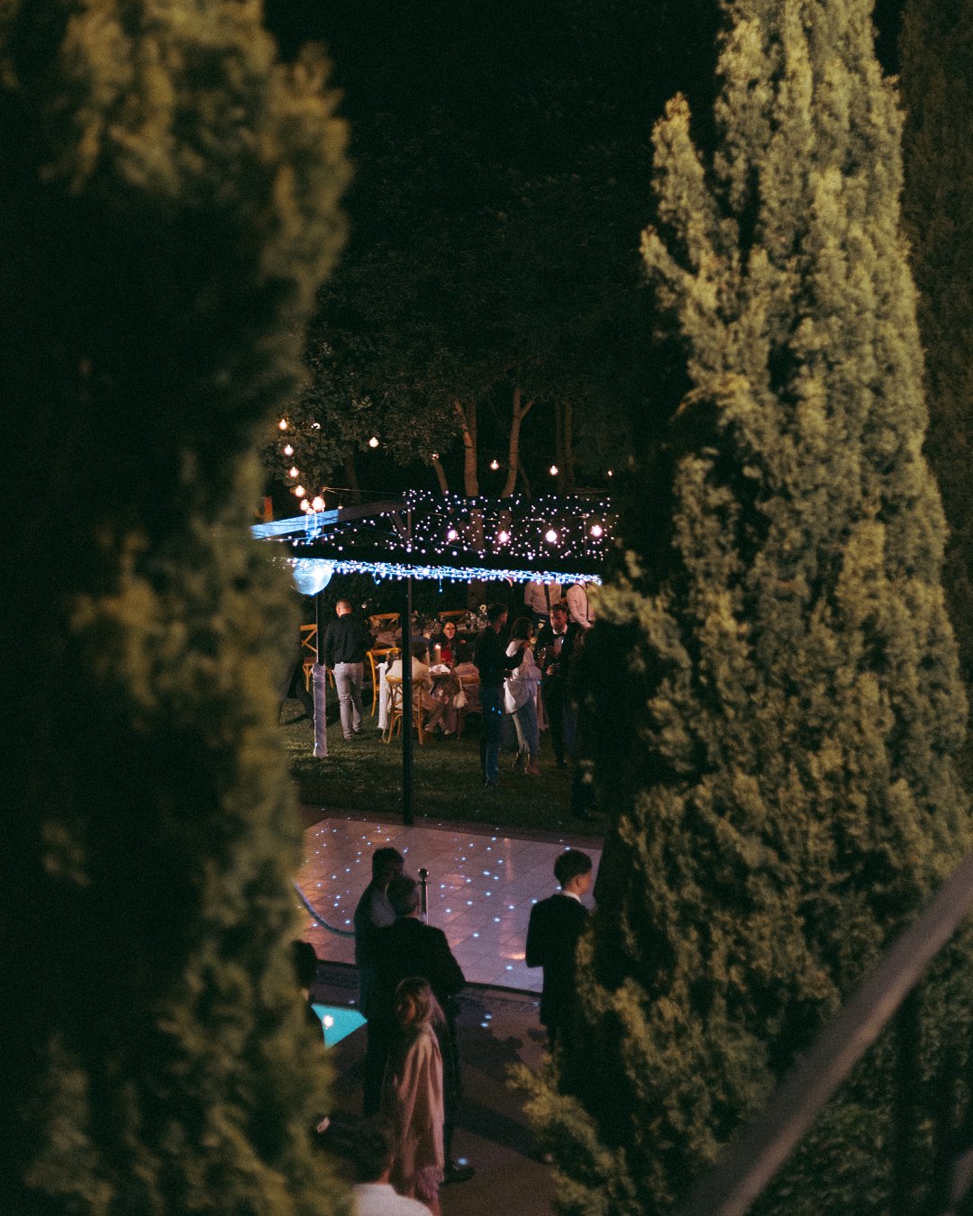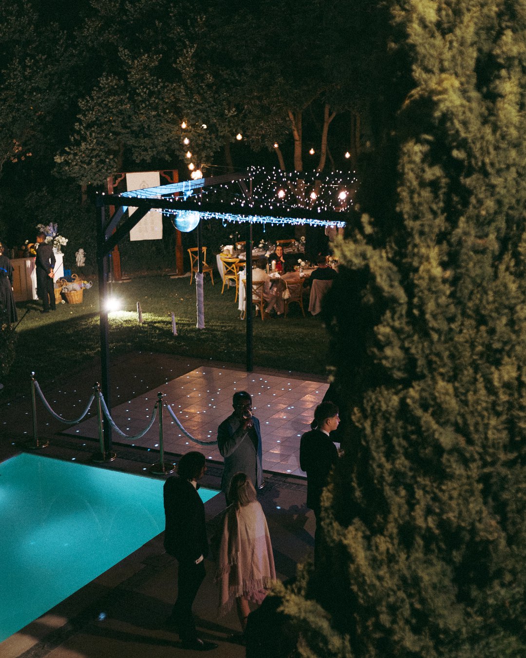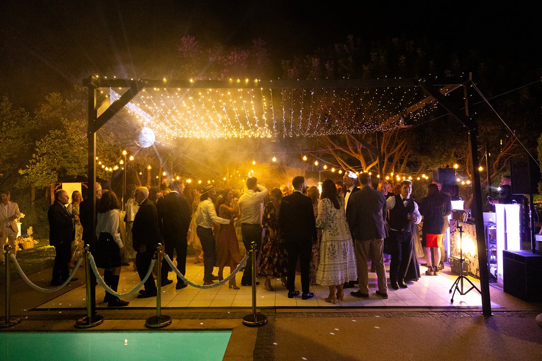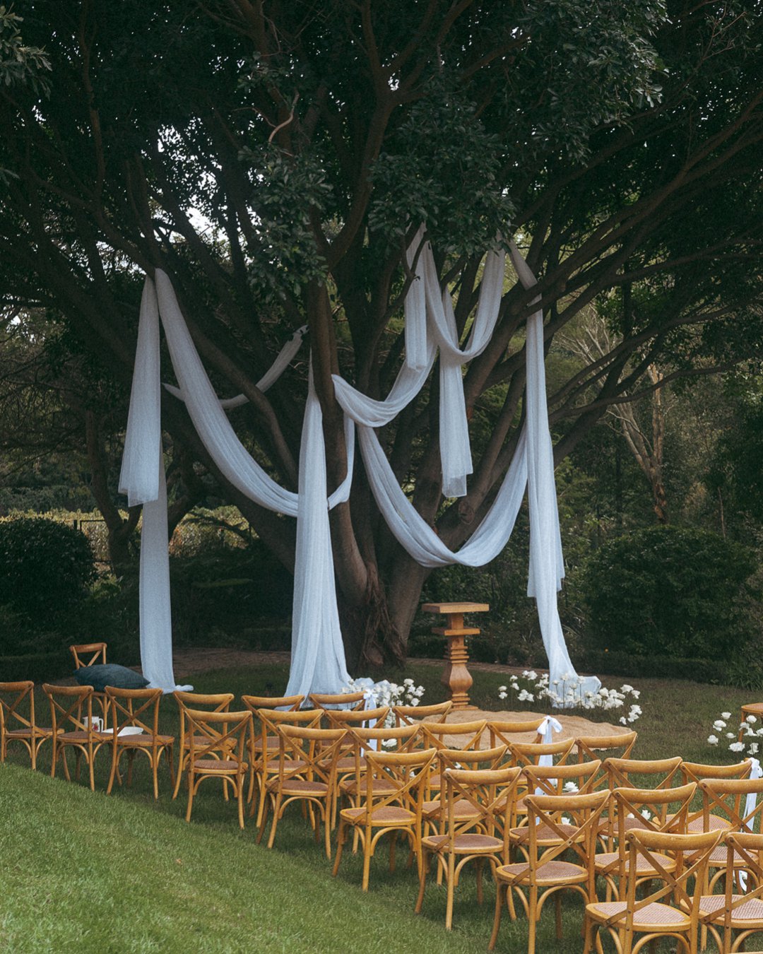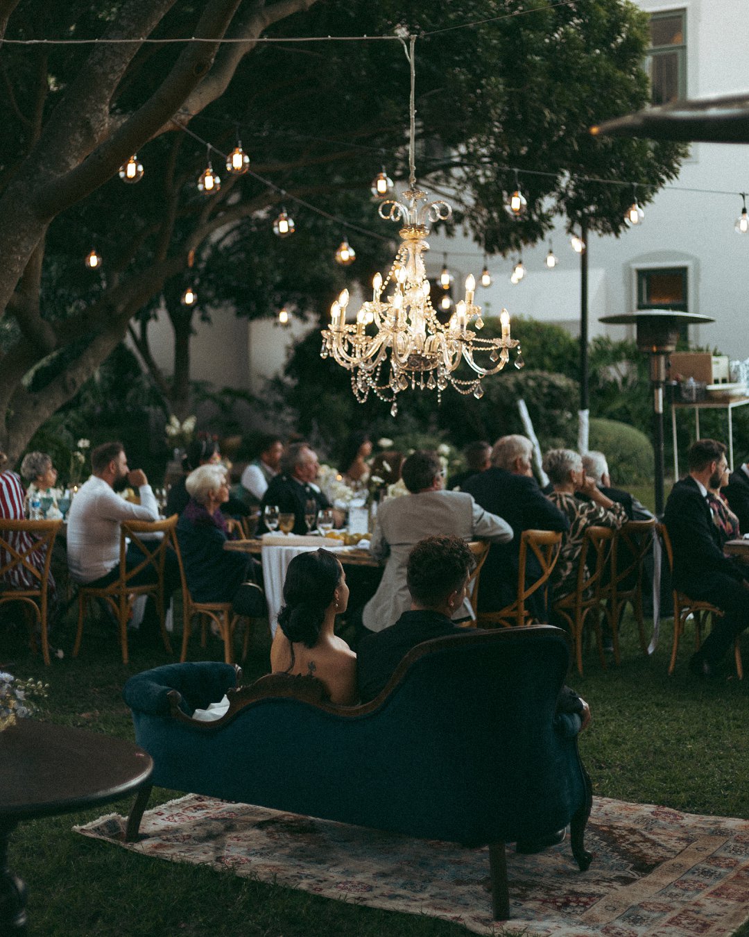 Die seremonie het onder daardie pragtige boom plaasgevind, en van daar af het gaste verby die swembad na die buitelug-onthaal beweeg. Dit was vir my regtig belangrik om onder die sterre te eet. Ek wou daardie magie van ’n warm aand, skitterende liggies, goeie kos en al ons geliefdes op een plek saam hê. Dit was presies waarvan ek gedroom het romanties, betekenisvol en onvergeetlik.