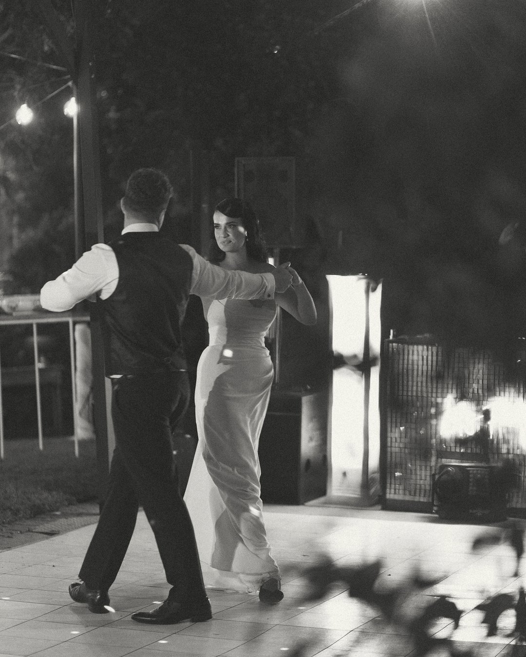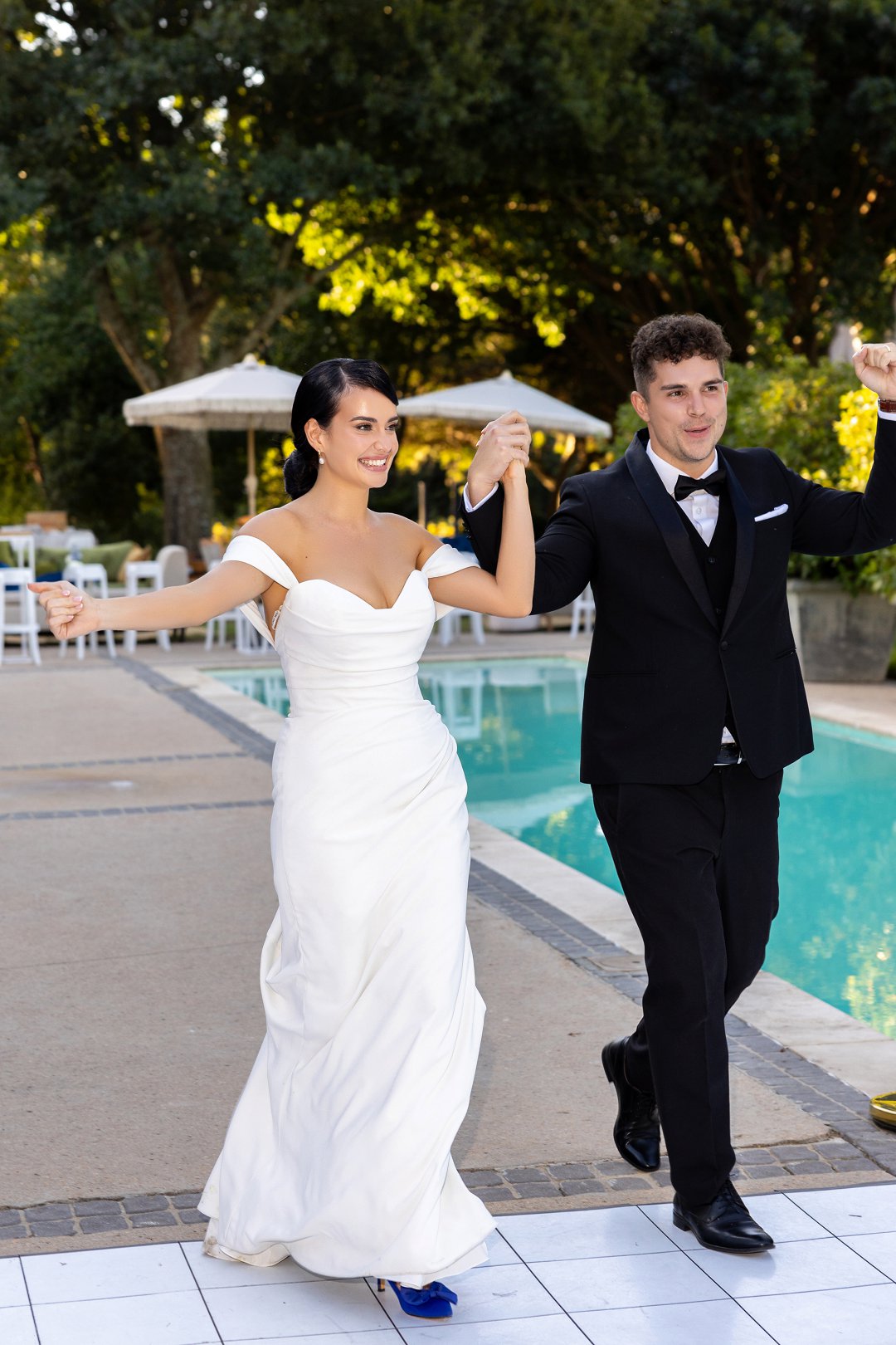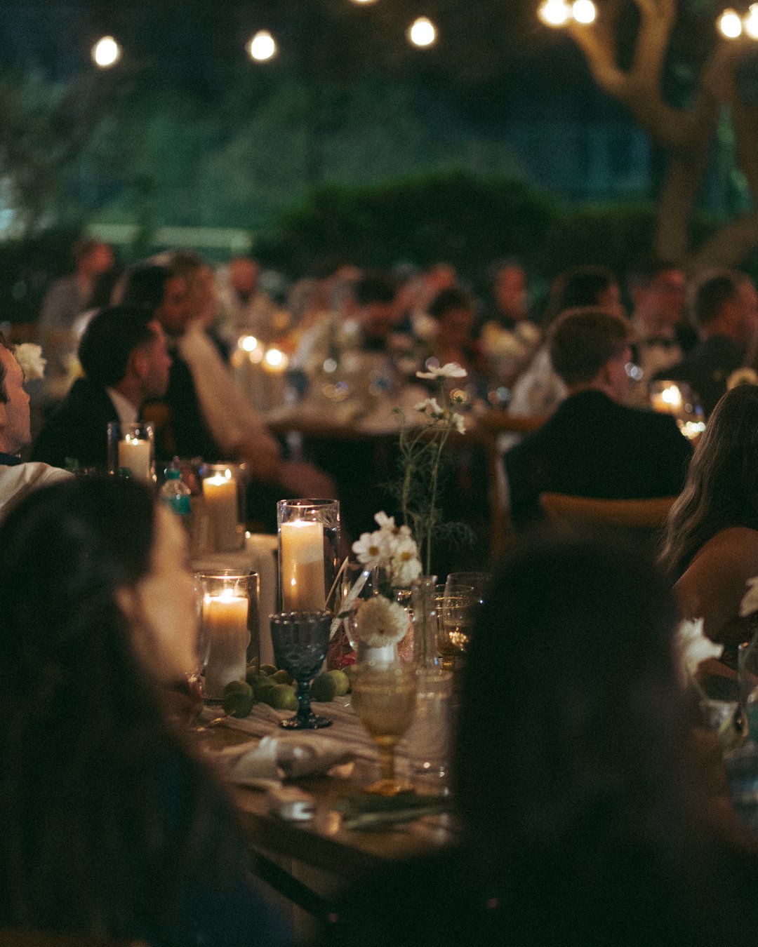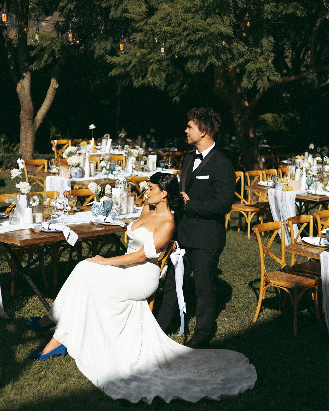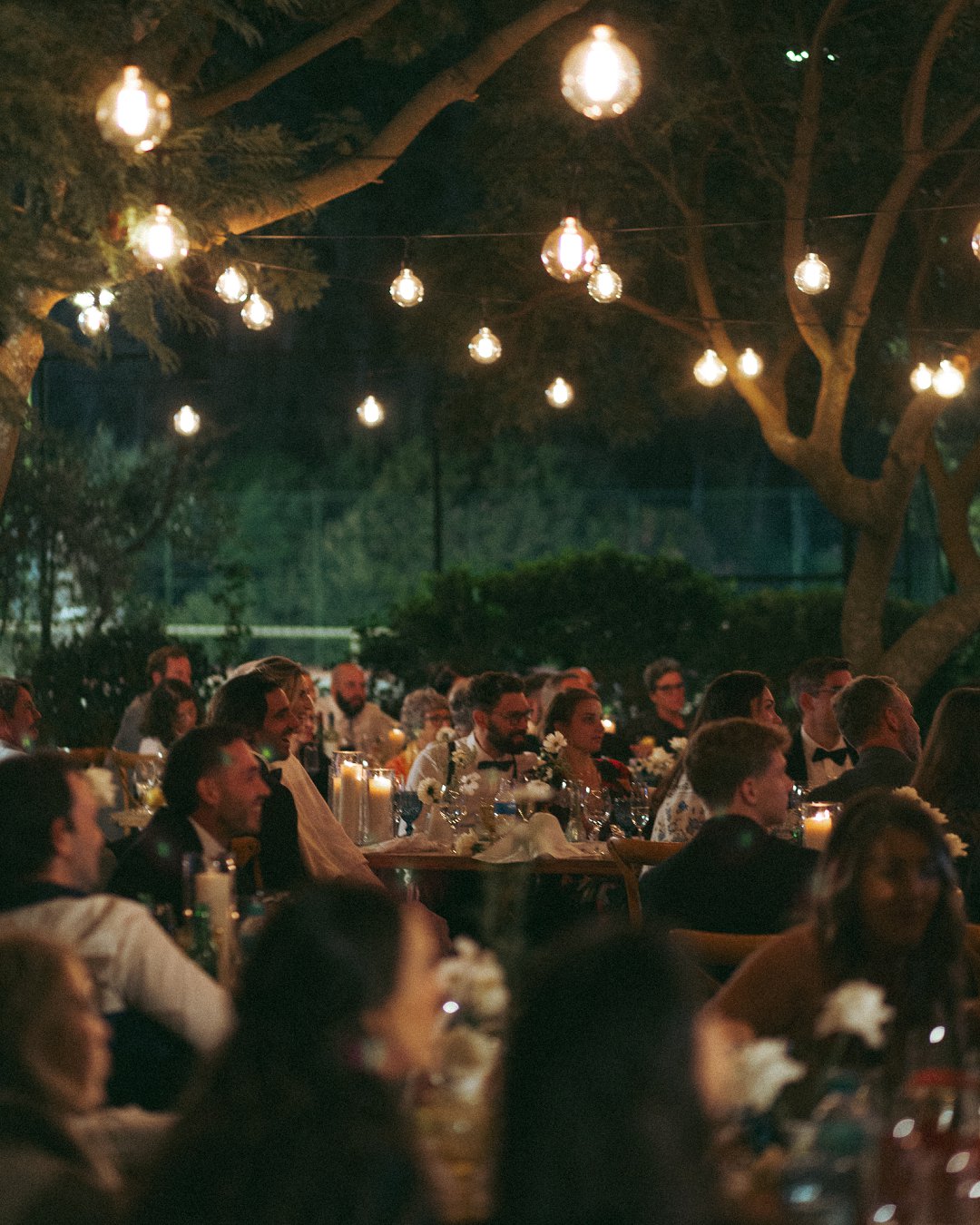 Die seremonie het onder daardie pragtige boom plaasgevind, en van daar af het gaste verby die swembad na die buitelug-onthaal beweeg. Dit was vir my regtig belangrik om onder die sterre te eet. Ek wou daardie magie van ’n warm aand, skitterende liggies, goeie kos en al ons geliefdes op een plek saam hê. Dit was presies waarvan ek gedroom het romanties, betekenisvol en onvergeetlik.