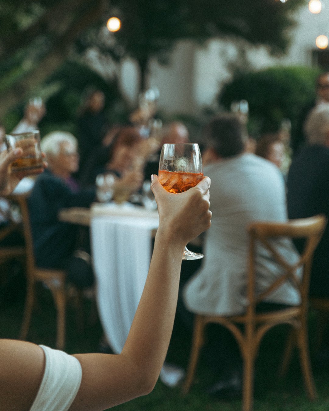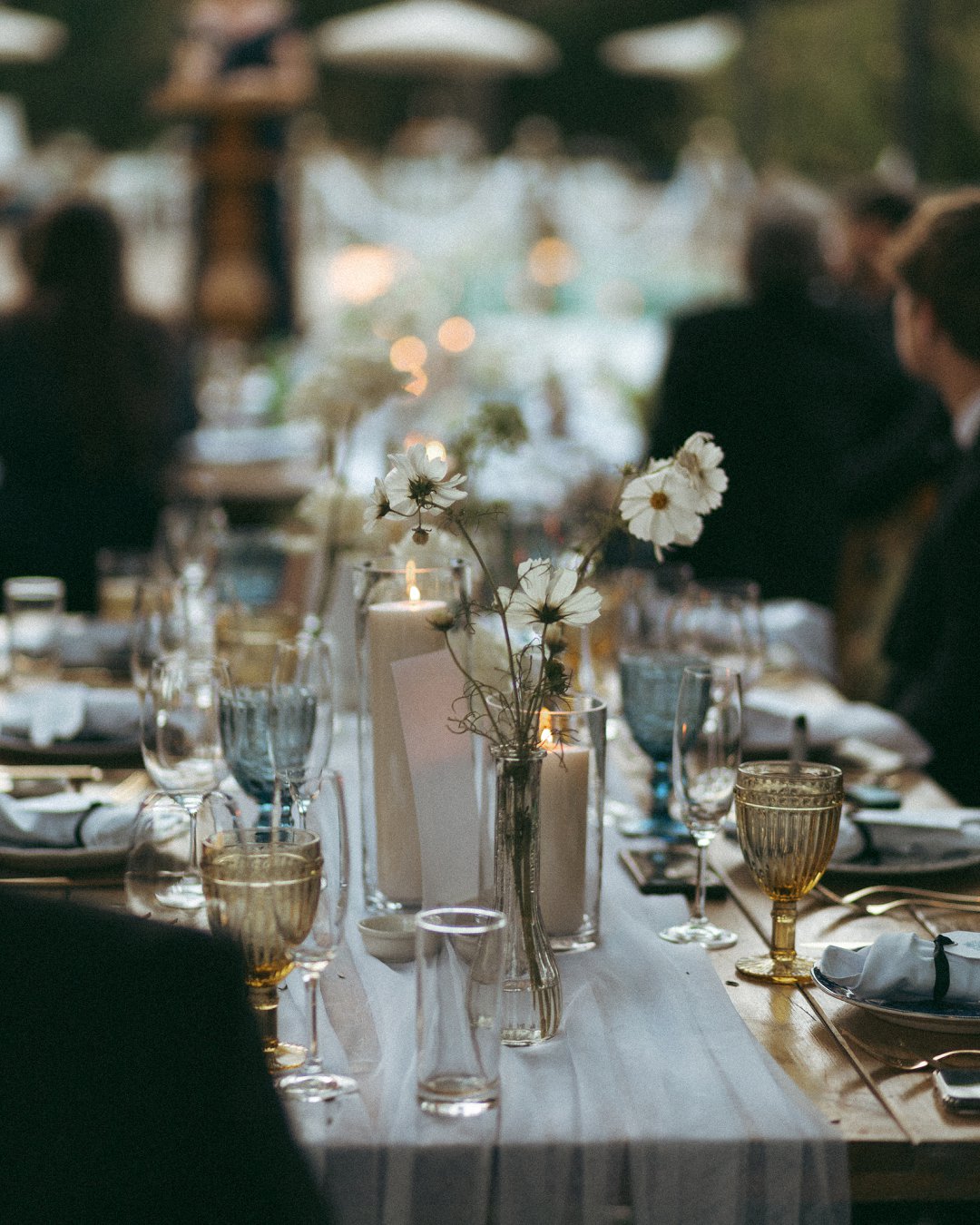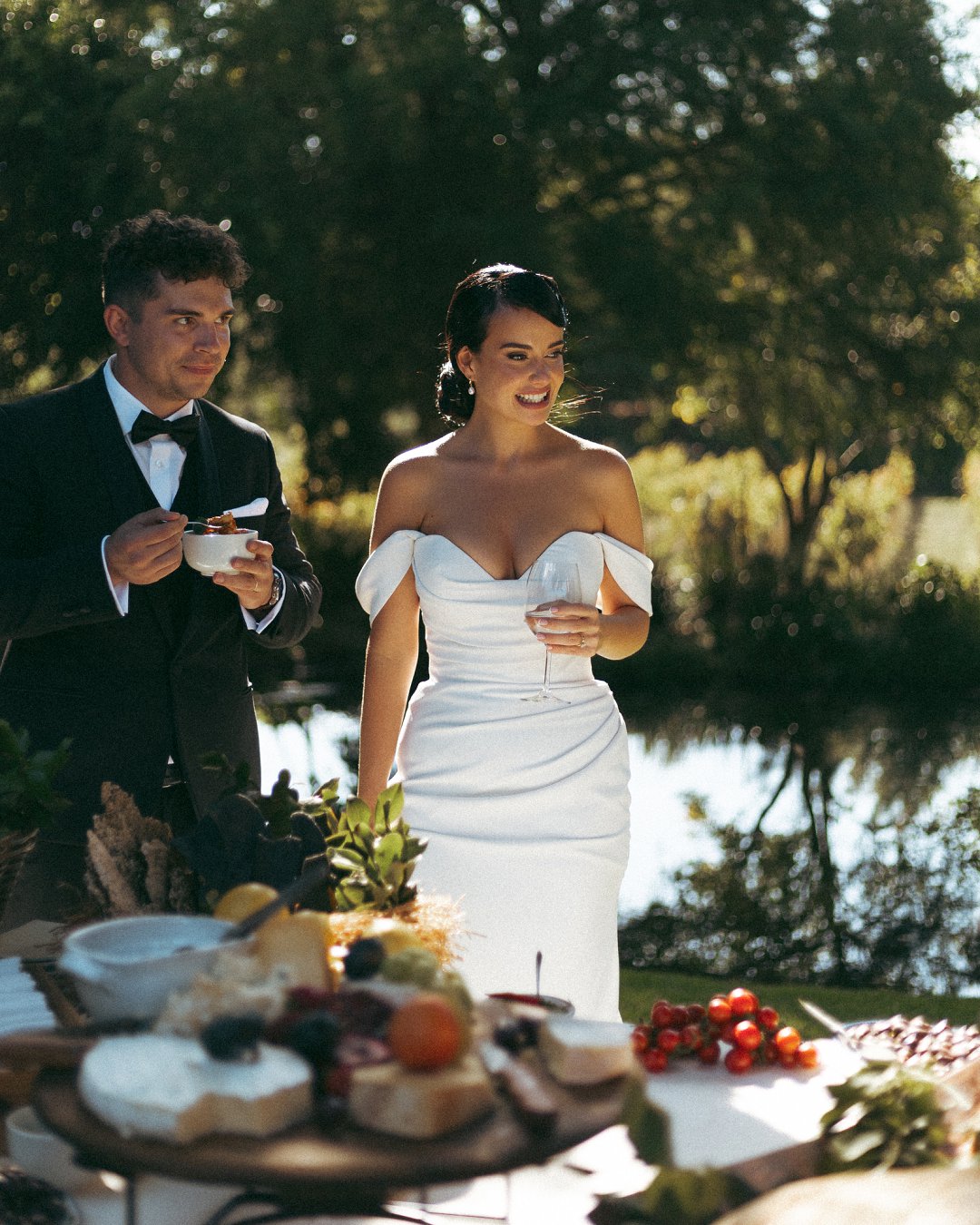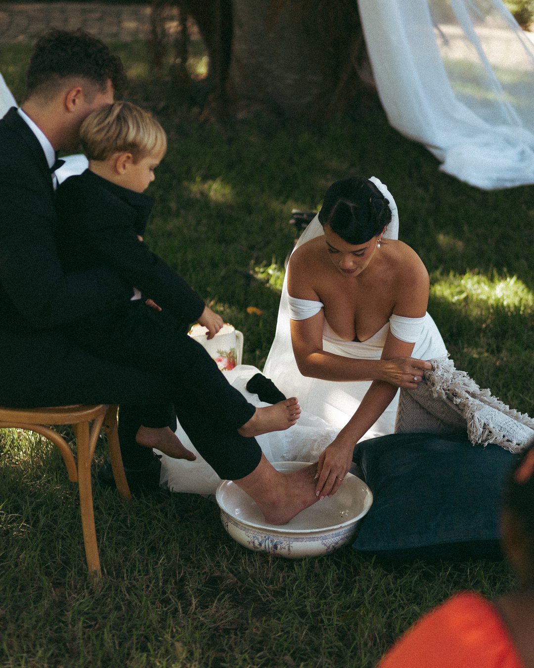 Die seremonie het onder daardie pragtige boom plaasgevind, en van daar af het gaste verby die swembad na die buitelug-onthaal beweeg. Dit was vir my regtig belangrik om onder die sterre te eet. Ek wou daardie magie van ’n warm aand, skitterende liggies, goeie kos en al ons geliefdes op een plek saam hê. Dit was presies waarvan ek gedroom het romanties, betekenisvol en onvergeetlik.