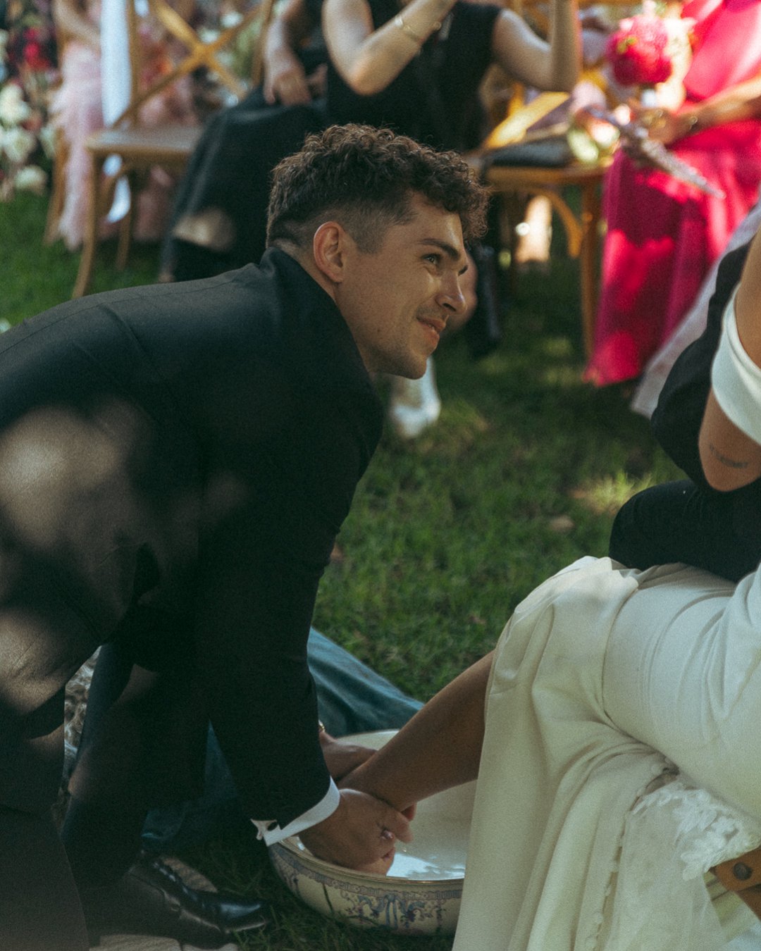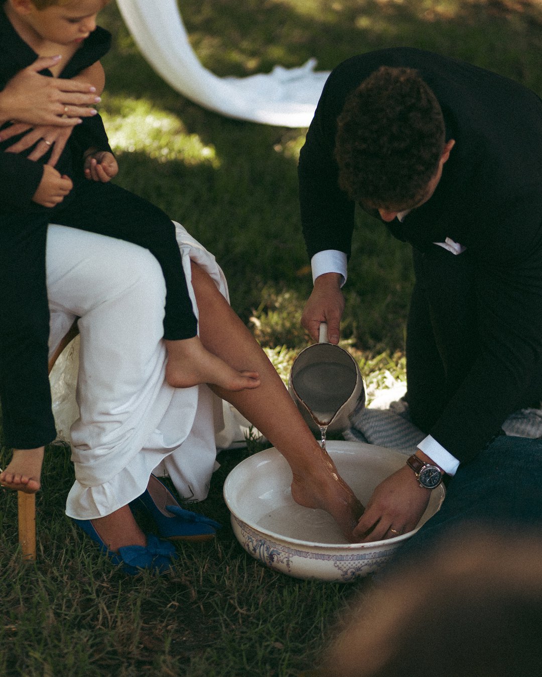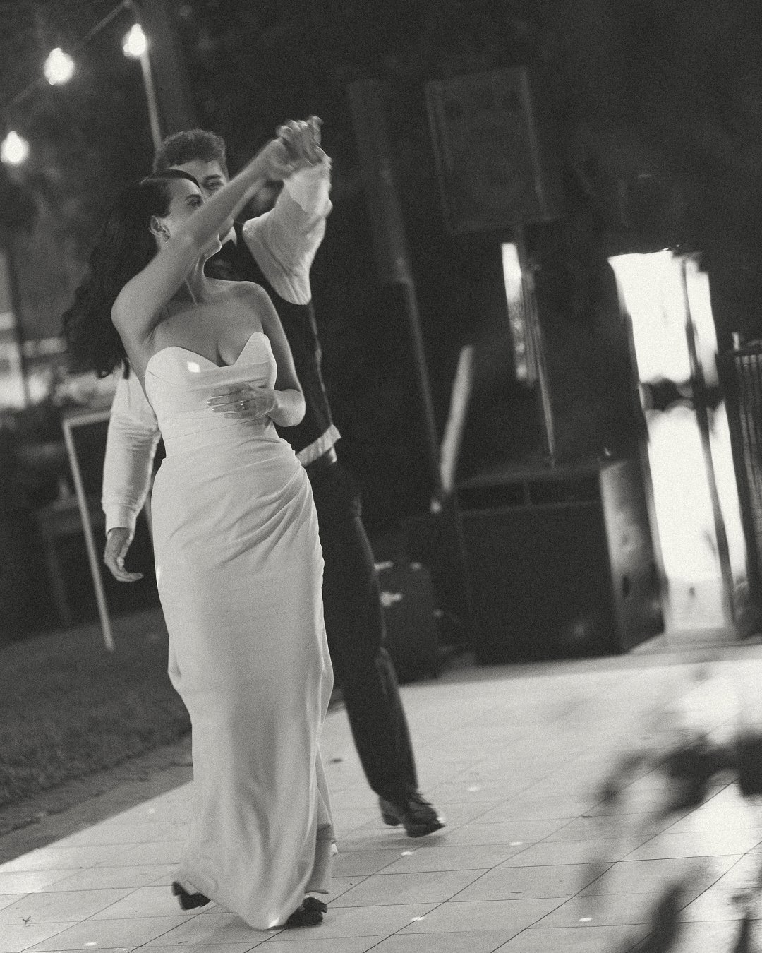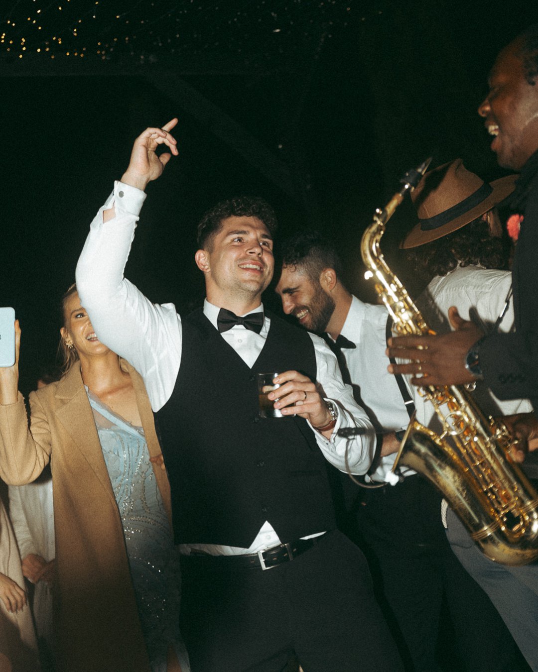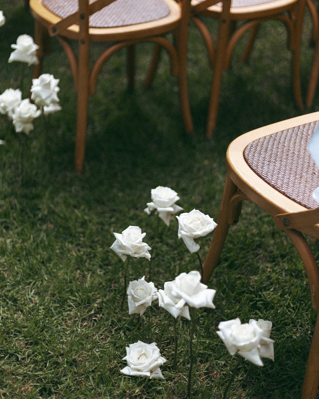 Die seremonie het onder daardie pragtige boom plaasgevind, en van daar af het gaste verby die swembad na die buitelug-onthaal beweeg. Dit was vir my regtig belangrik om onder die sterre te eet. Ek wou daardie magie van ’n warm aand, skitterende liggies, goeie kos en al ons geliefdes op een plek saam hê. Dit was presies waarvan ek gedroom het romanties, betekenisvol en onvergeetlik.
