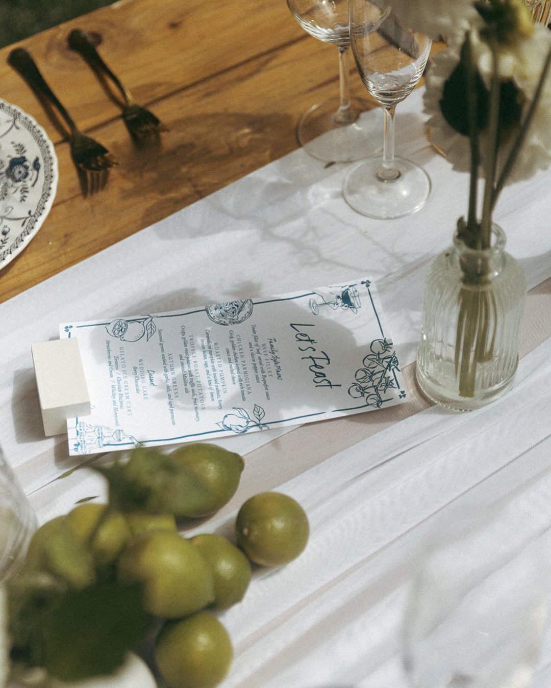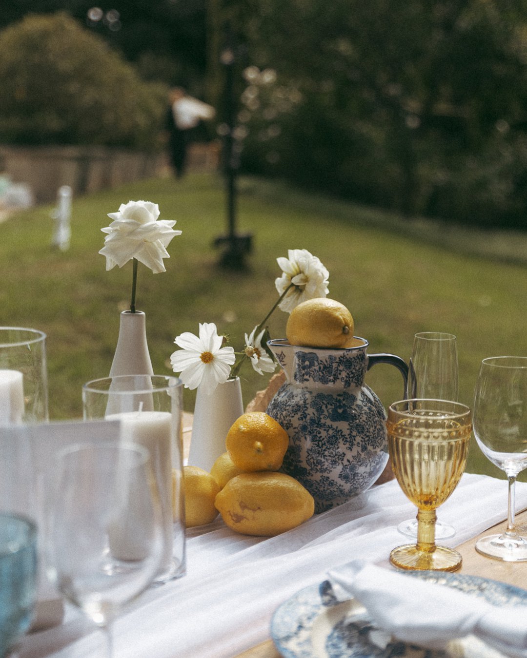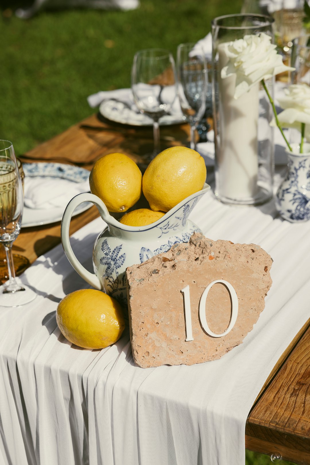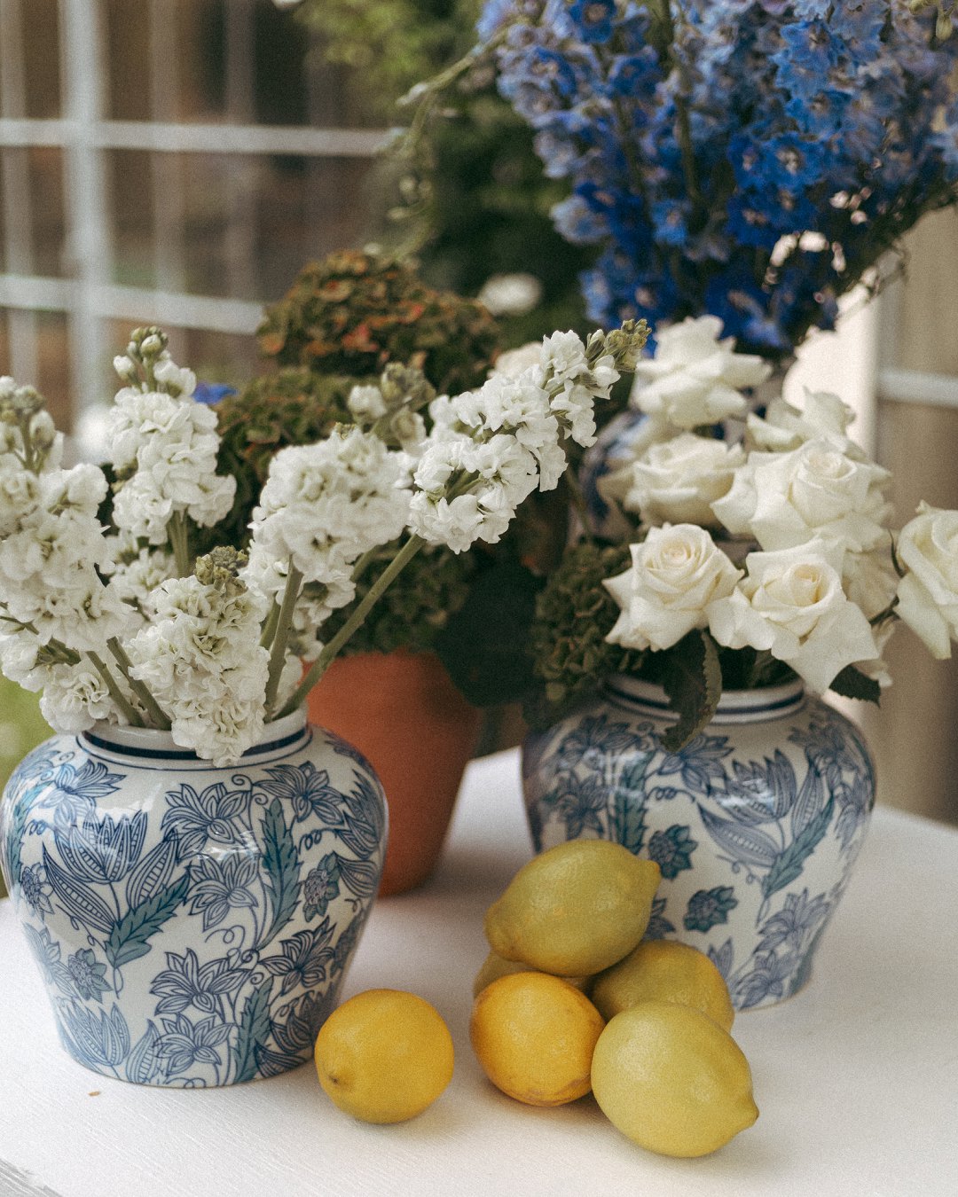 Ek het gekies vir ’n Toskaans-geïnspireerde kleurpalet van Delftsblou aksente, spatsels geel van suurlemoene, aanrakinge van groen, en sagte wit blomme om alles tydloos en vars te hou. Die atmosfeer waarna ons gestreef het was La Dolce Vita elegant, maar ontspanne, vol vreugde en intensie.