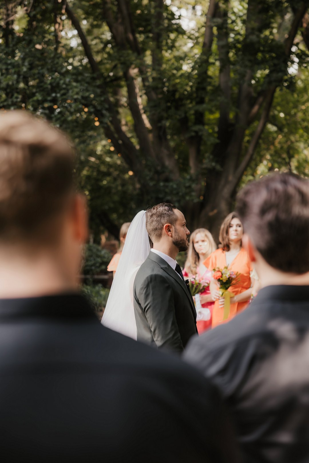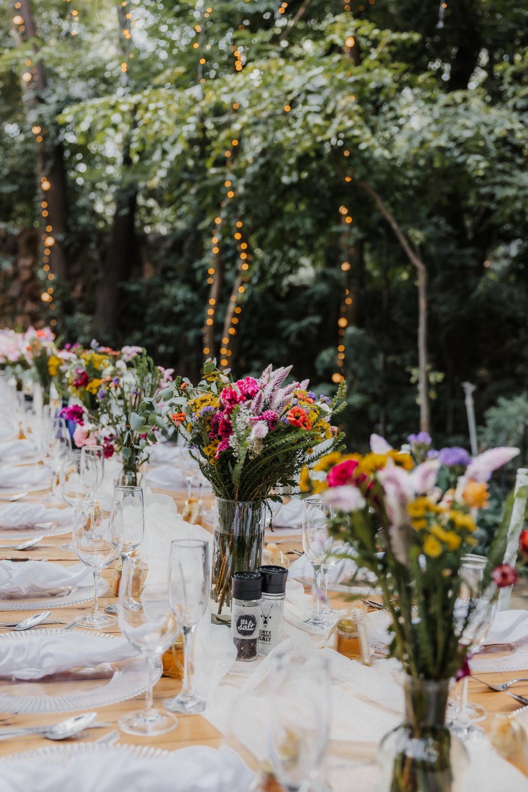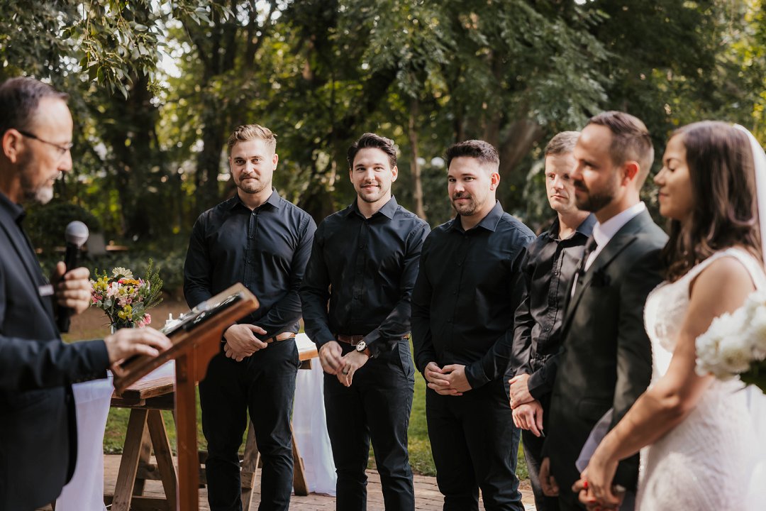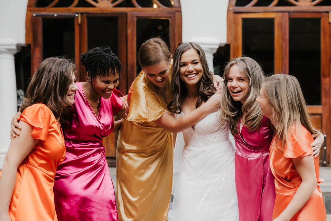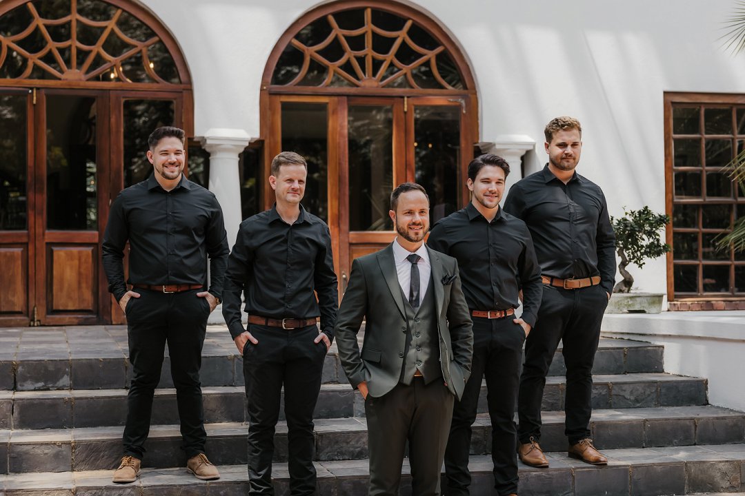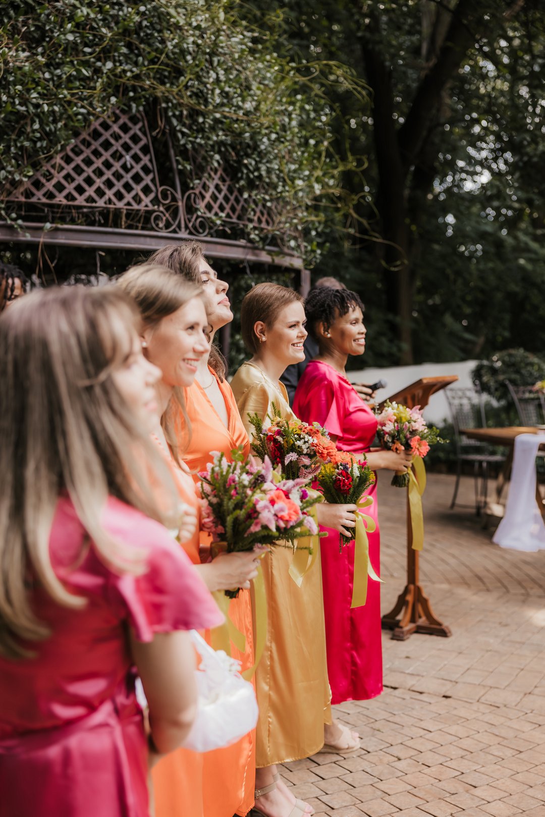 Die seremonie en feesviering was gevul met kleurvolle besonderhede. Alisha se strooimeisies het helder rokke gedra wat ʼn vrolike kontras geskep het teenoor die natuurlike tuin, met handruikers wat perfek by die uitrustings gepas het. Sy self het asemrowend gelyk in haar trou rok met ʼn groot wit handruiker wat klassieke elegansie uitgestraal het. Frans en sy strooijonkers se tydlose swart pakke het ʼn kragtige balans gebring teenoor die kleurvolle gevolg.