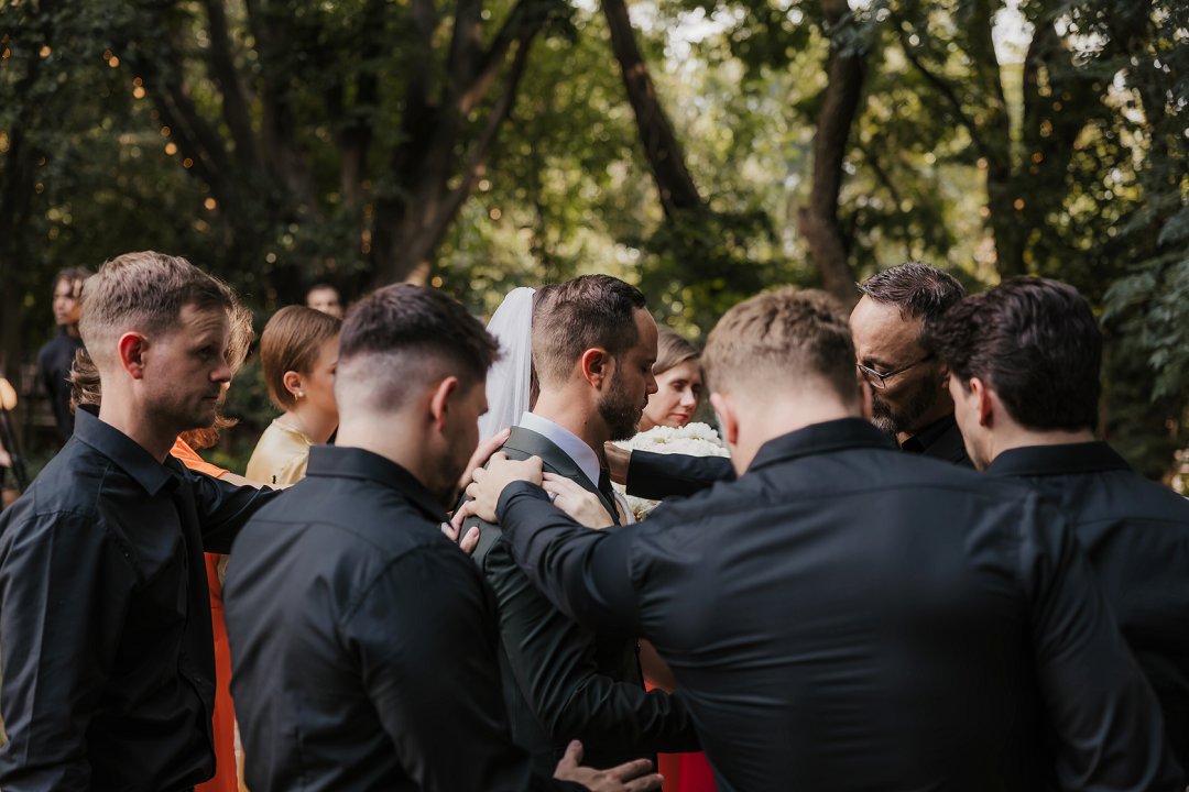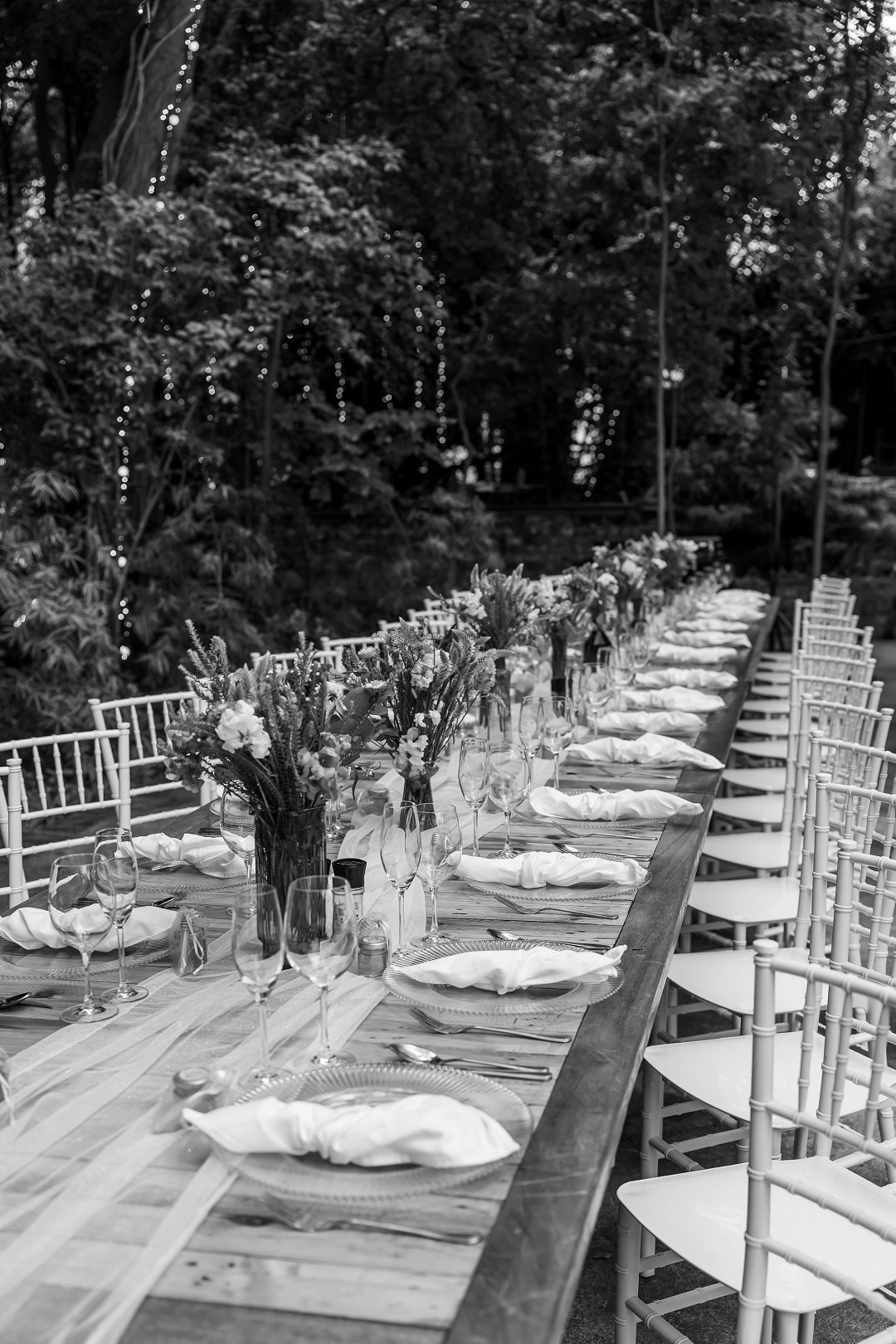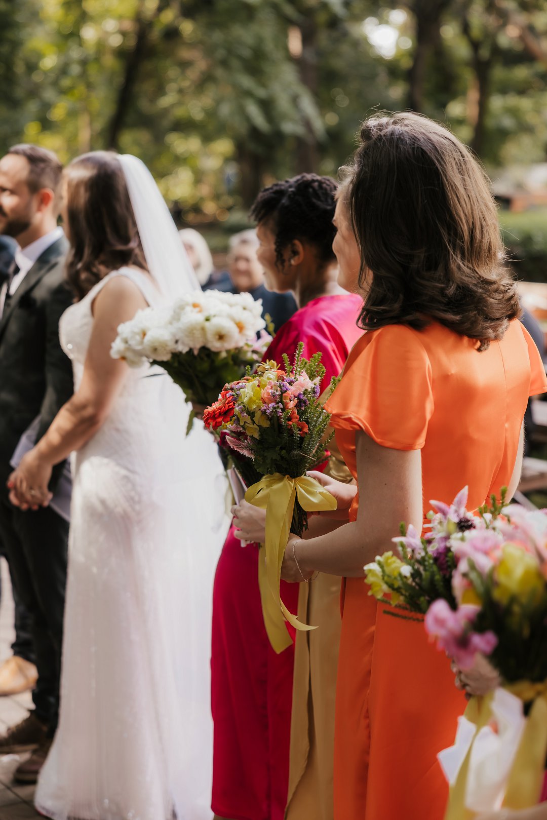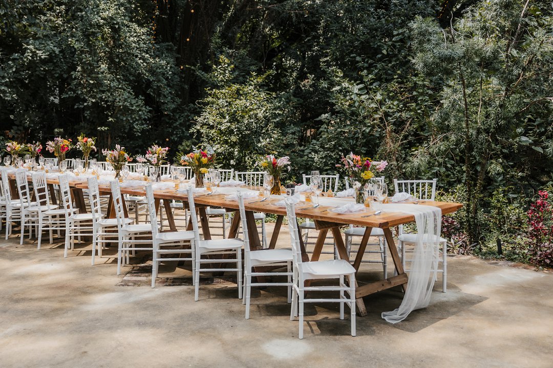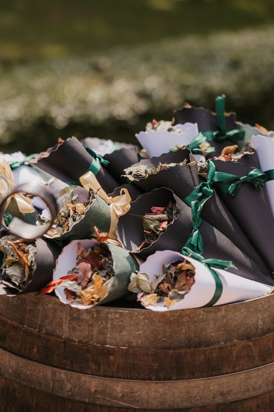 Die seremonie en feesviering was gevul met kleurvolle besonderhede. Alisha se strooimeisies het helder rokke gedra wat ʼn vrolike kontras geskep het teenoor die natuurlike tuin, met handruikers wat perfek by die uitrustings gepas het. Sy self het asemrowend gelyk in haar trou rok met ʼn groot wit handruiker wat klassieke elegansie uitgestraal het. Frans en sy strooijonkers se tydlose swart pakke het ʼn kragtige balans gebring teenoor die kleurvolle gevolg.