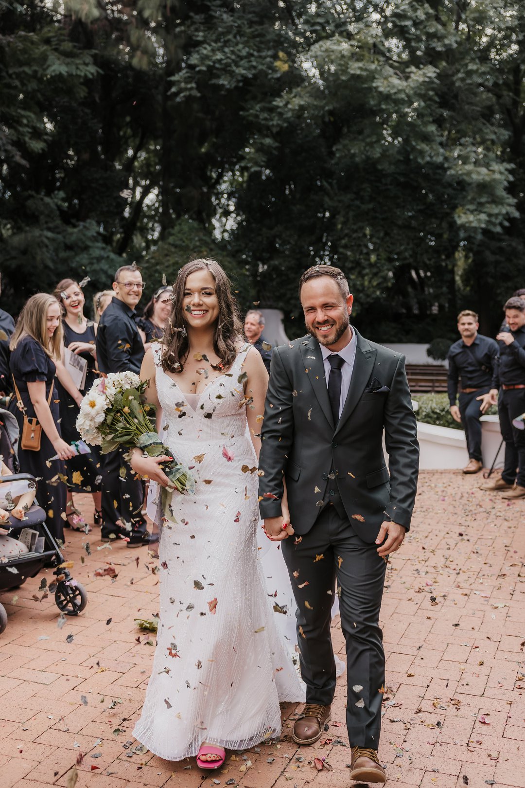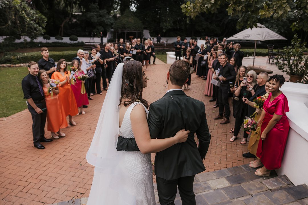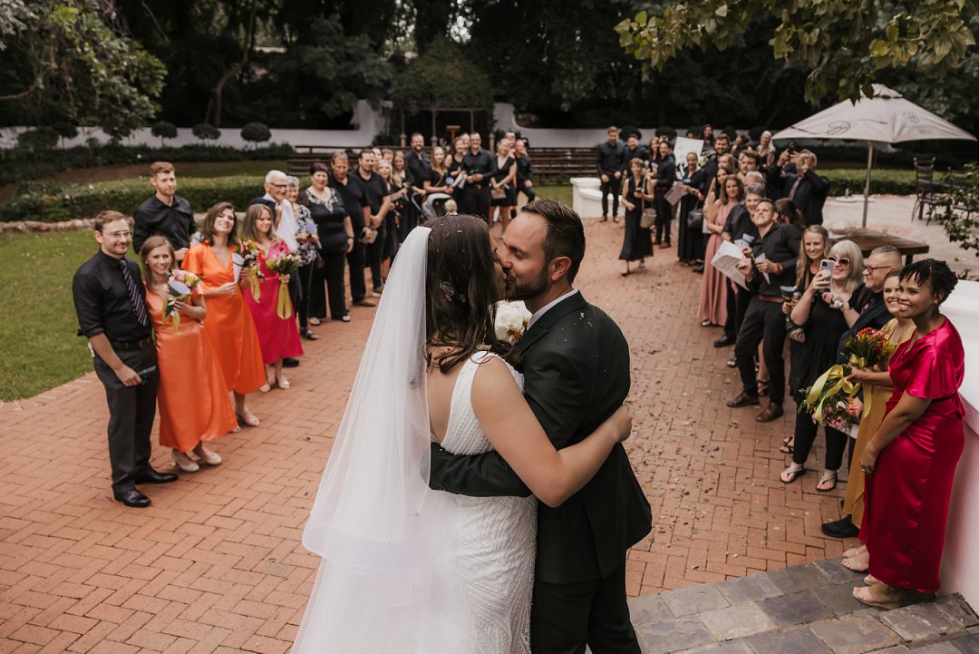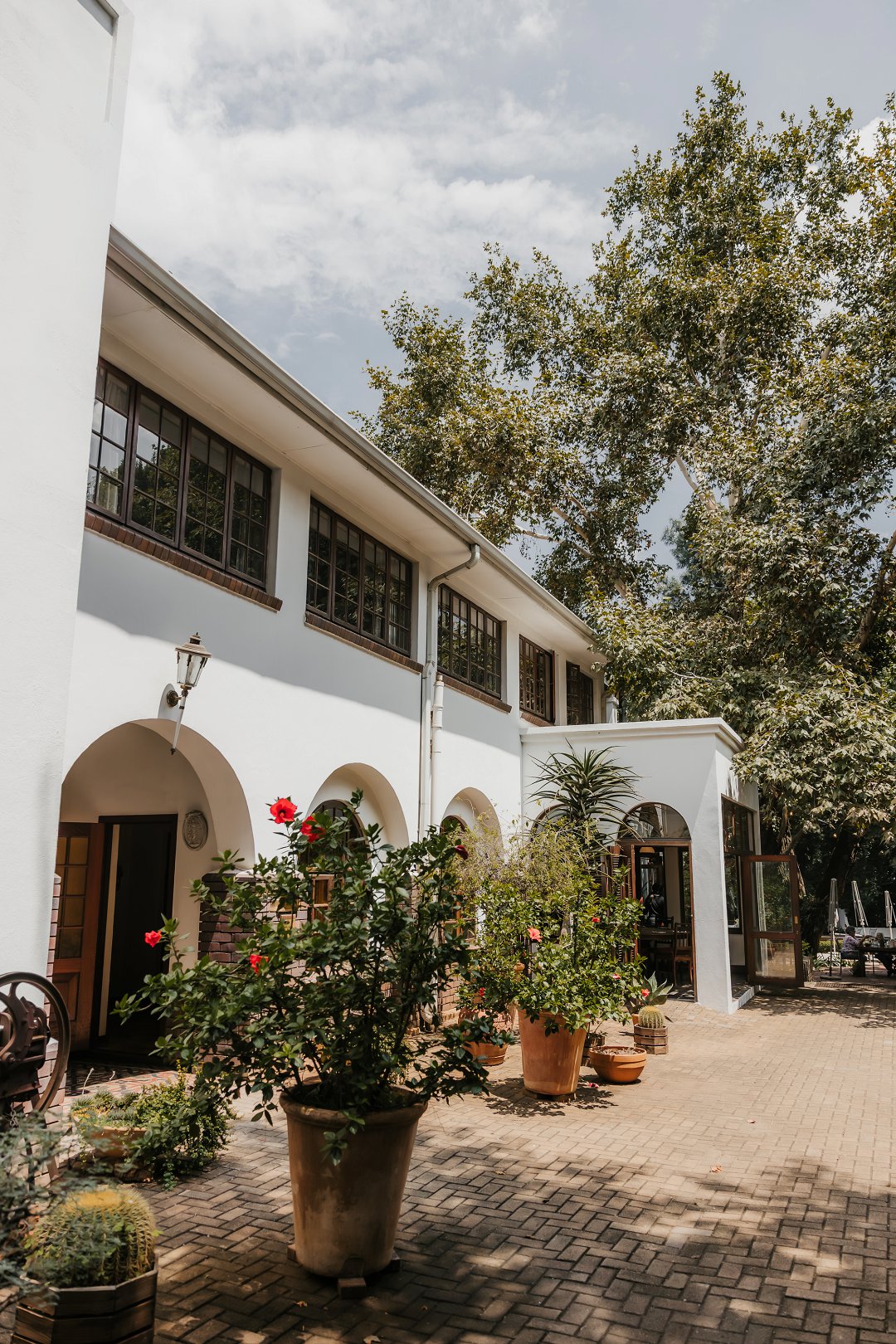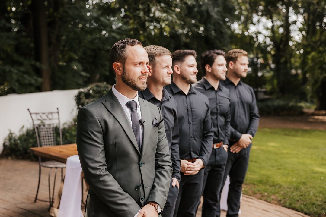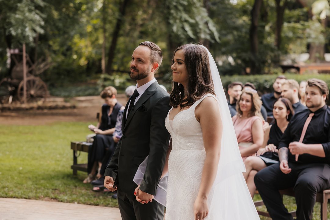 Die huweliksbeloftes is gemaak in die venue se welige tuin, waar groen grasperke en blomryke plantegroei ʼn rustige atmosfeer geskep het. Intiem én feestelik, het geliefdes die paartjie omring in ʼn gees van liefde en samehorigheid. Ná die seremonie is hul fotosessie vasgevang in die sagte sonsaklig, wat die foto’s ʼn romantiese en tydlose gevoel gegee het.