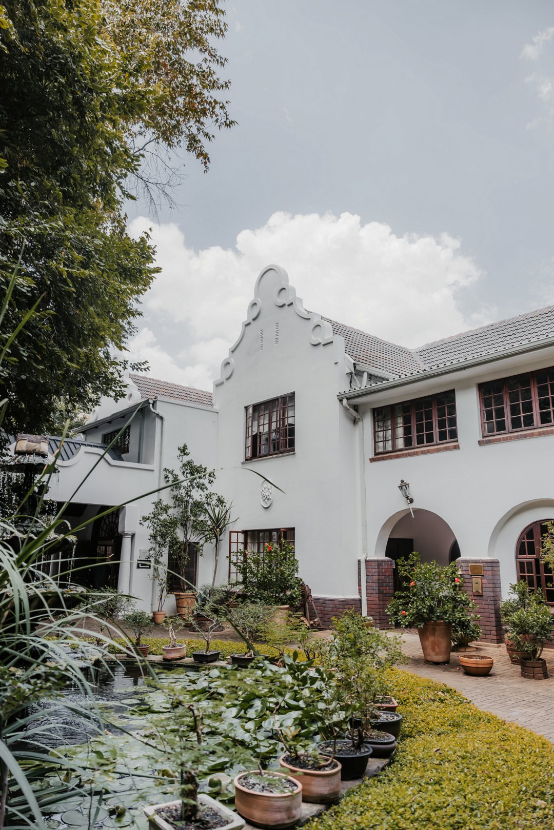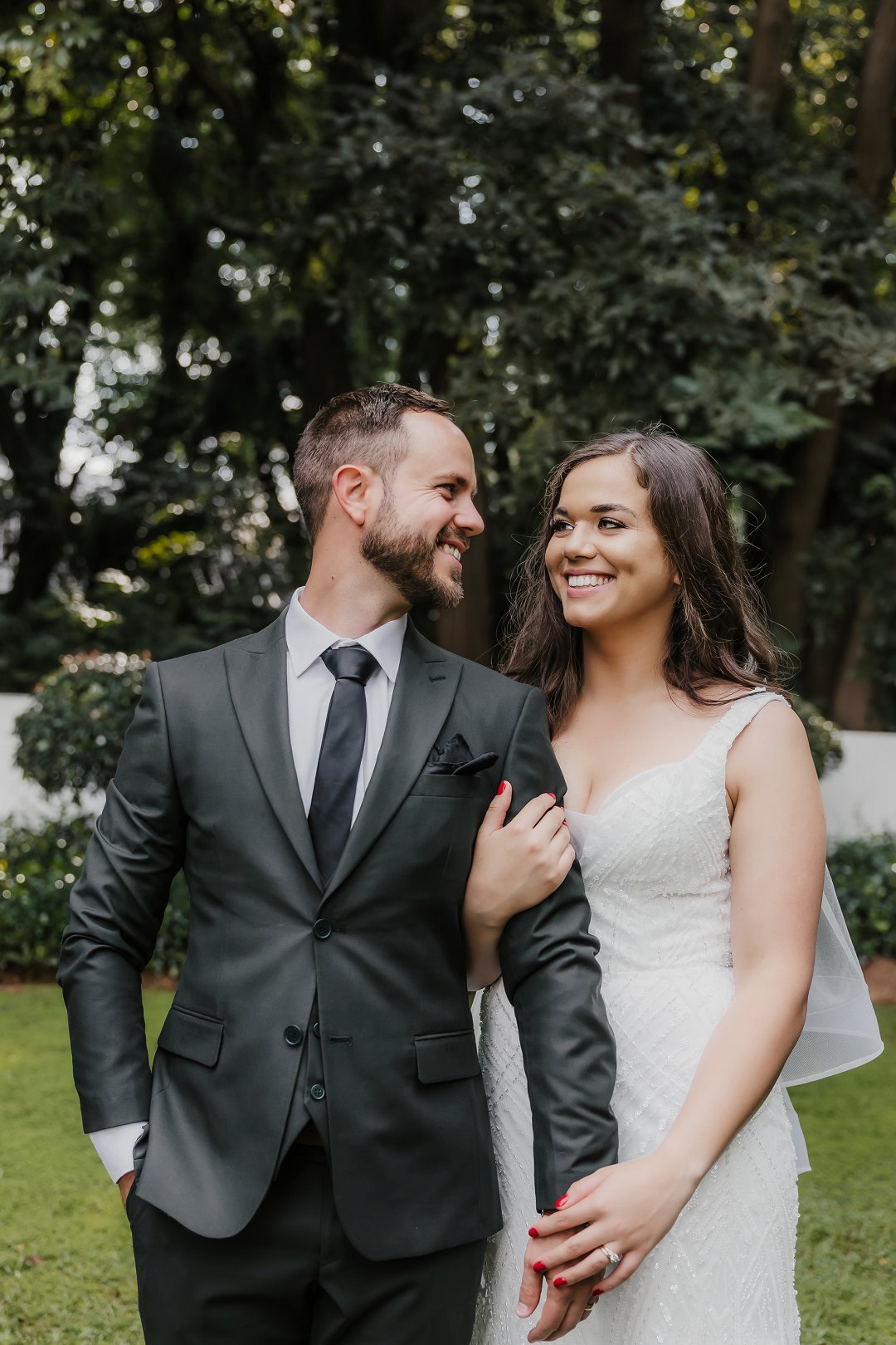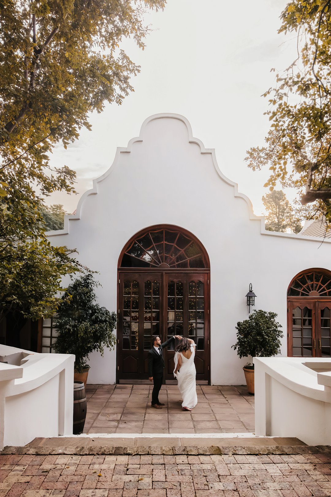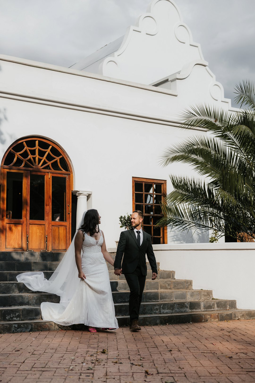 Die huweliksbeloftes is gemaak in die venue se welige tuin, waar groen grasperke en blomryke plantegroei ʼn rustige atmosfeer geskep het. Intiem én feestelik, het geliefdes die paartjie omring in ʼn gees van liefde en samehorigheid. Ná die seremonie is hul fotosessie vasgevang in die sagte sonsaklig, wat die foto’s ʼn romantiese en tydlose gevoel gegee het.