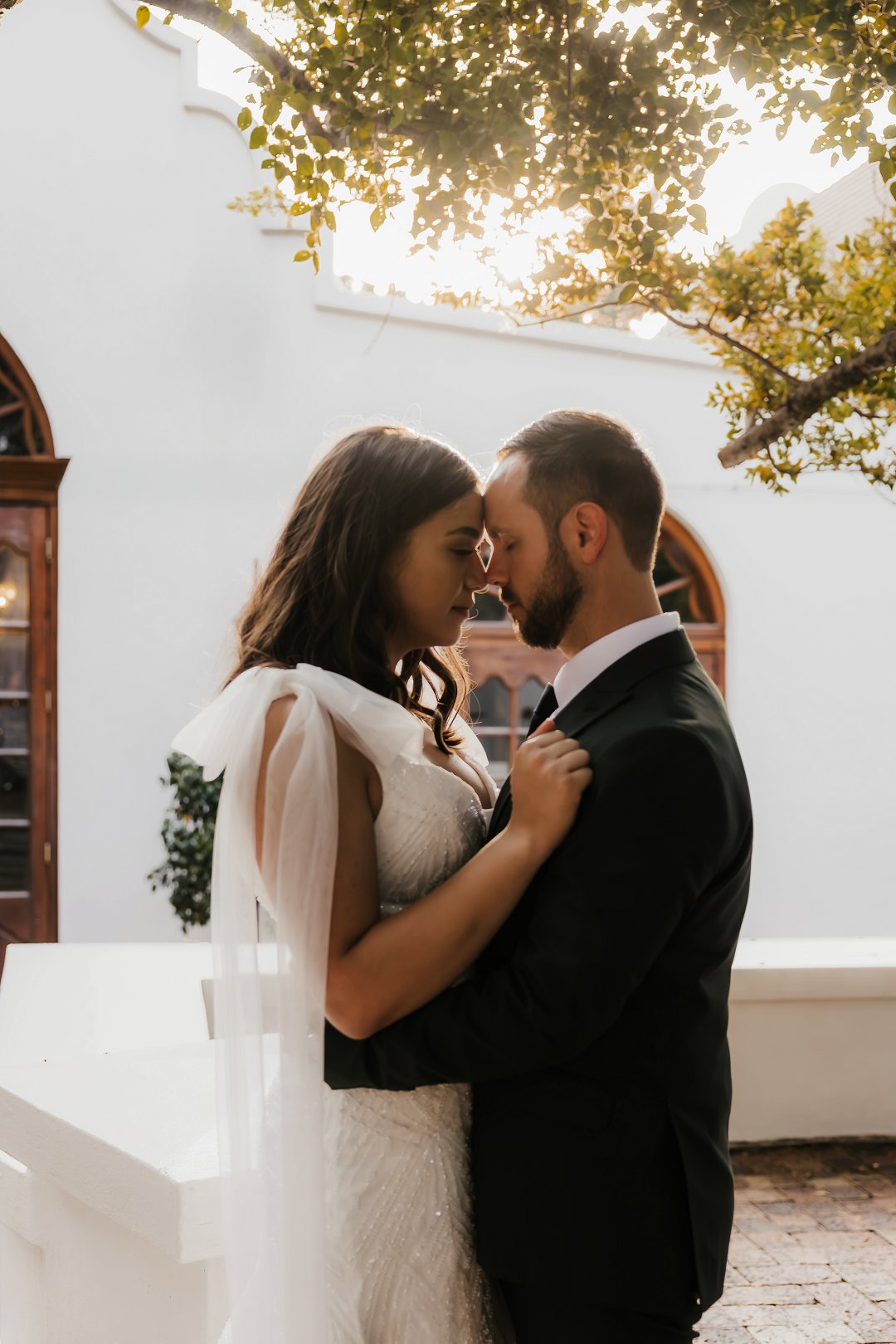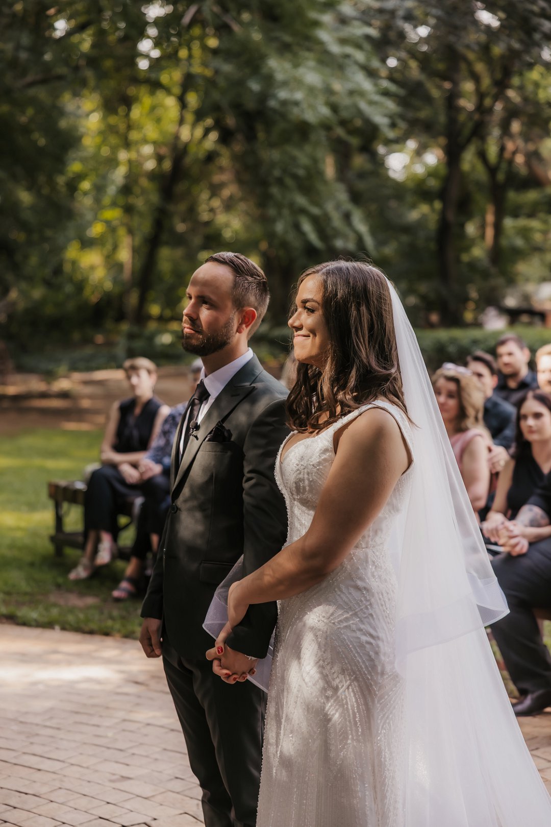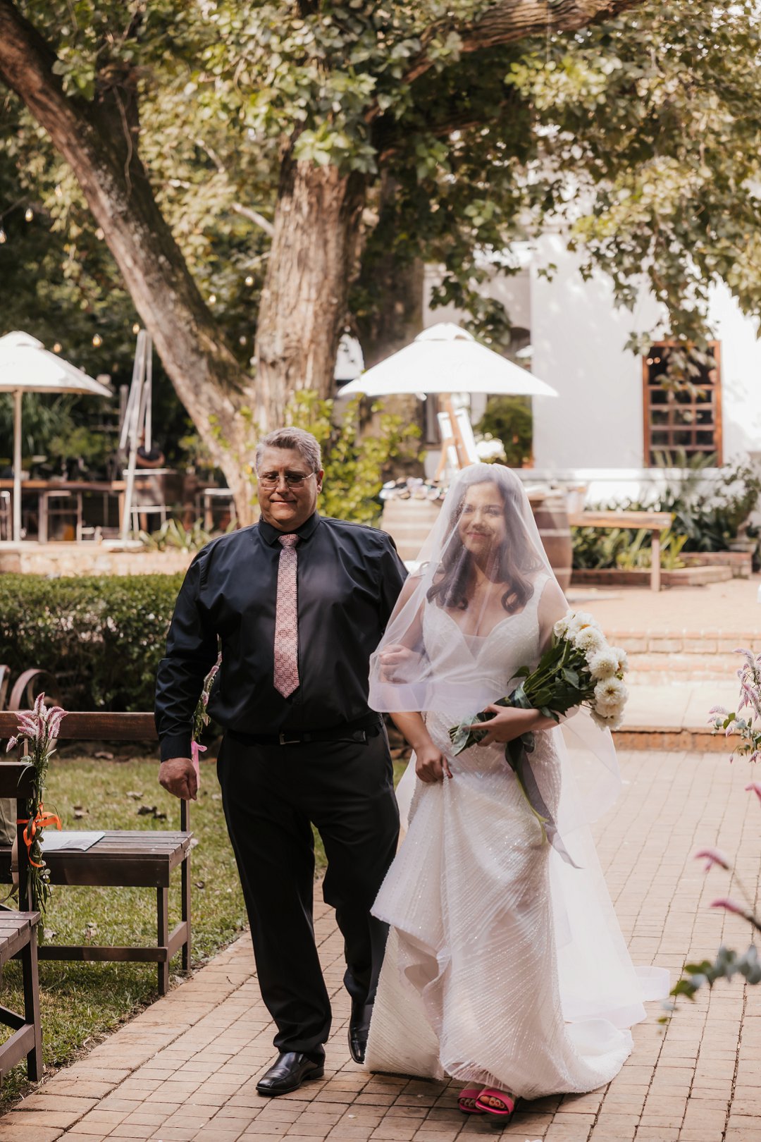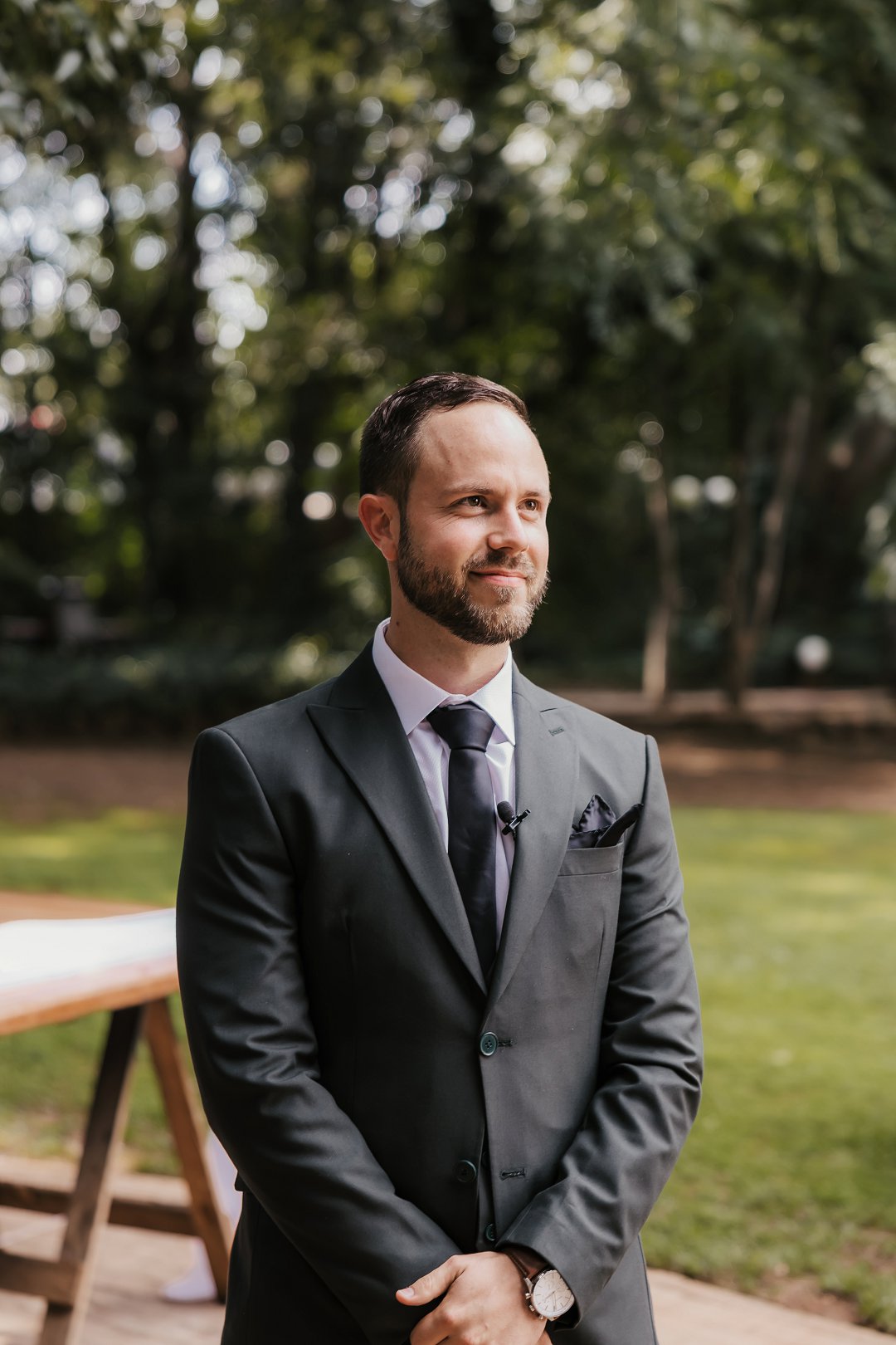 Die huweliksbeloftes is gemaak in die venue se welige tuin, waar groen grasperke en blomryke plantegroei ʼn rustige atmosfeer geskep het. Intiem én feestelik, het geliefdes die paartjie omring in ʼn gees van liefde en samehorigheid. Ná die seremonie is hul fotosessie vasgevang in die sagte sonsaklig, wat die foto’s ʼn romantiese en tydlose gevoel gegee het.