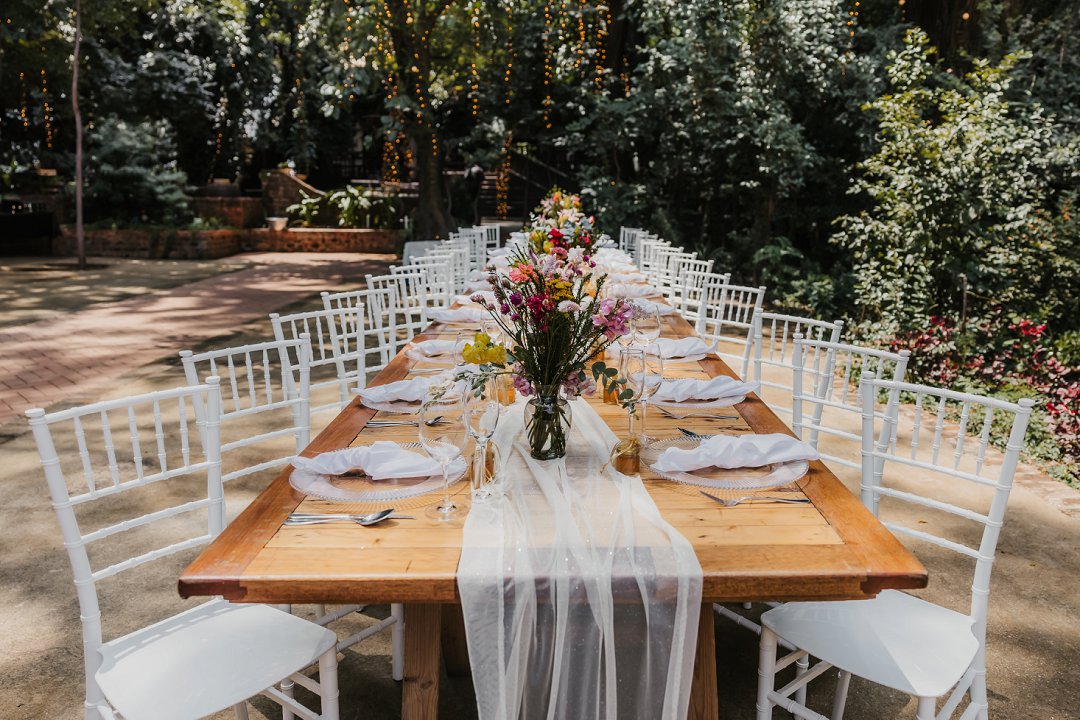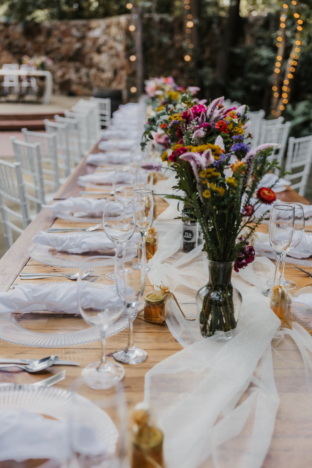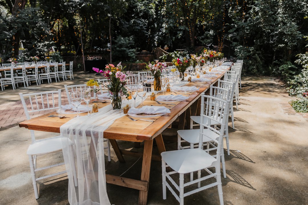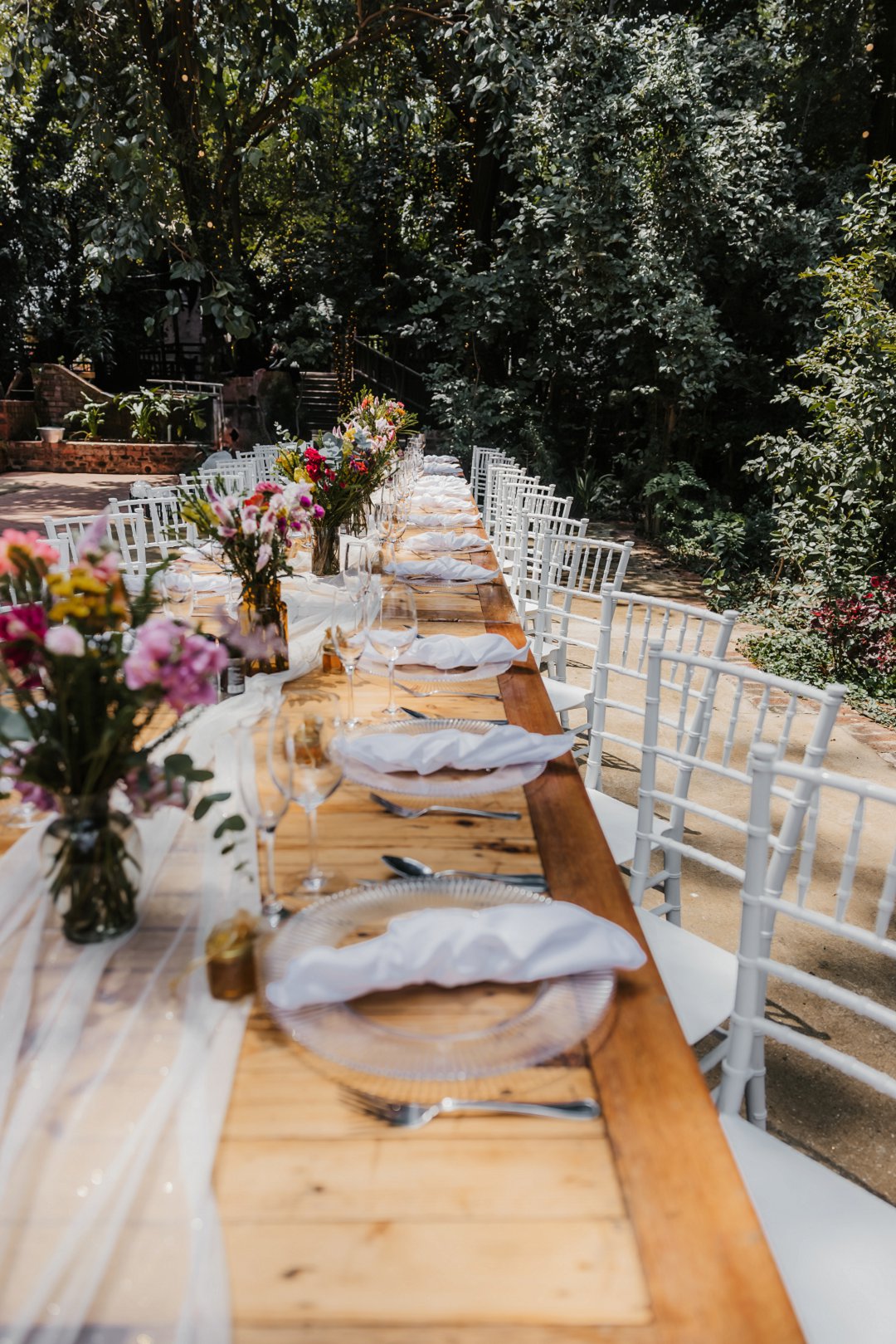 Die onthaal was net so elegant. Lang houttafels met wit tafellopers en glas onderborde het ʼn stylvolle basis gevorm. Kleurvolle blom ontwerpe en wit Tiffany-stoele die vrolike, verfynde tema voortgesit het.