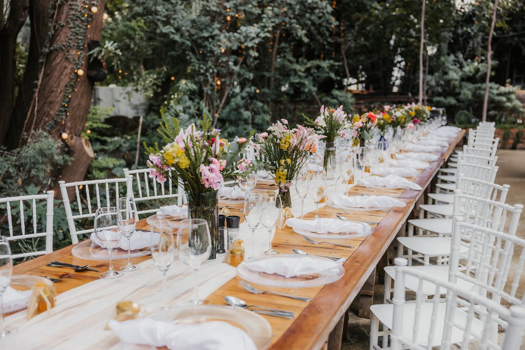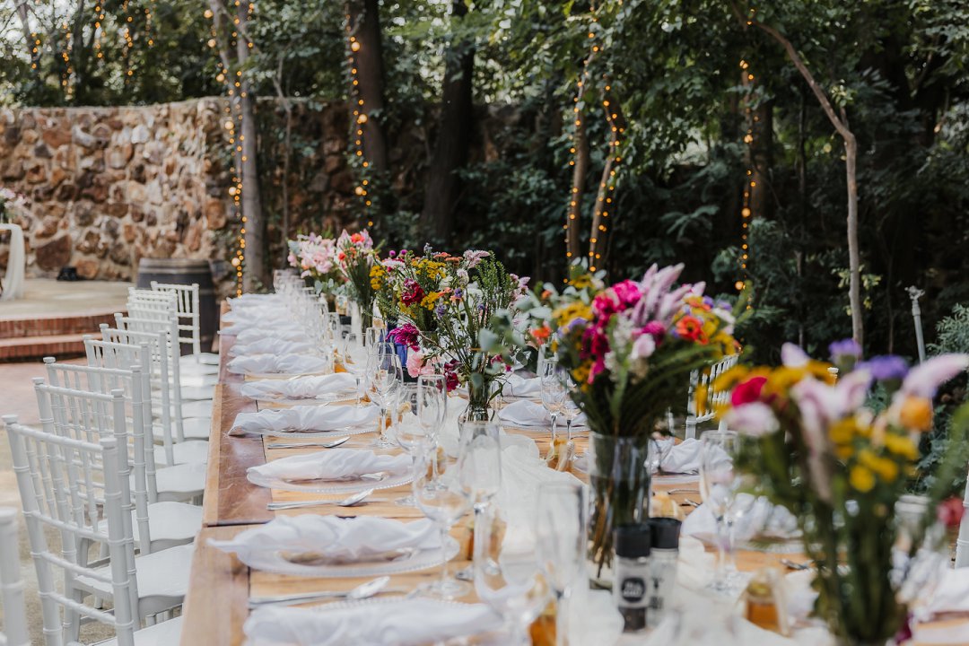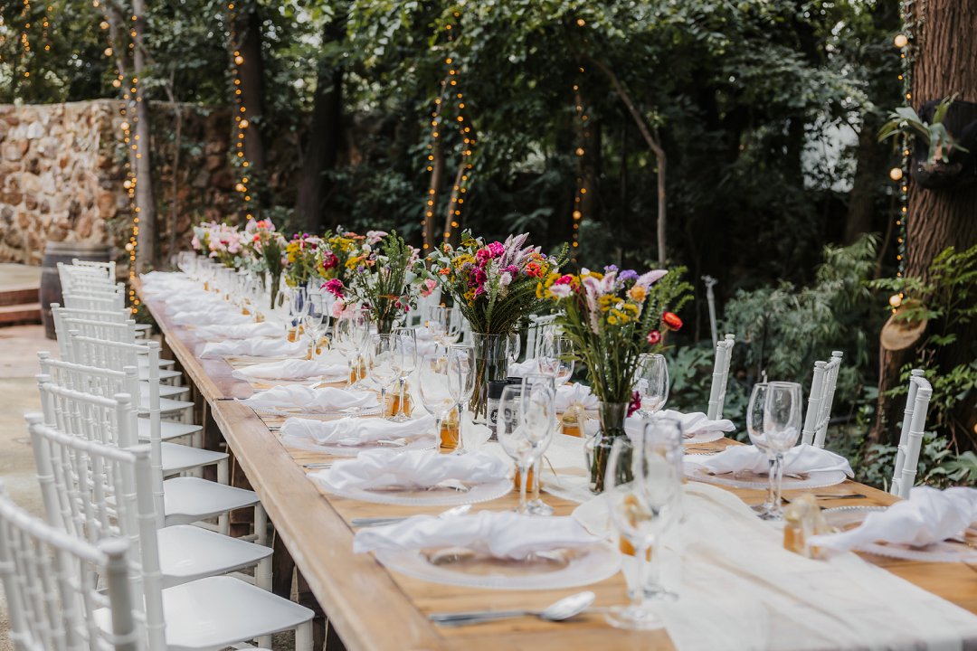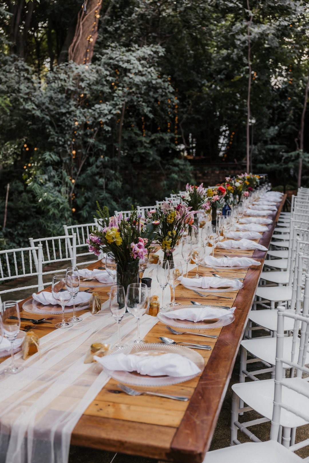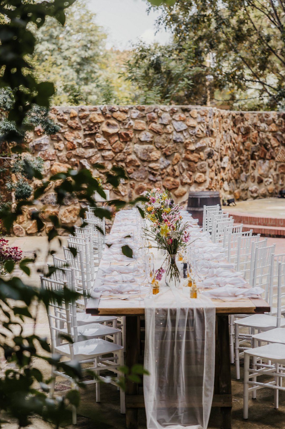 Die onthaal was net so elegant. Lang houttafels met wit tafellopers en glas onderborde het ʼn stylvolle basis gevorm. Kleurvolle blom ontwerpe en wit Tiffany-stoele die vrolike, verfynde tema voortgesit het.