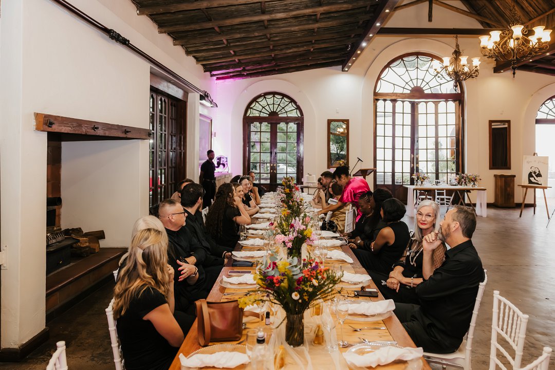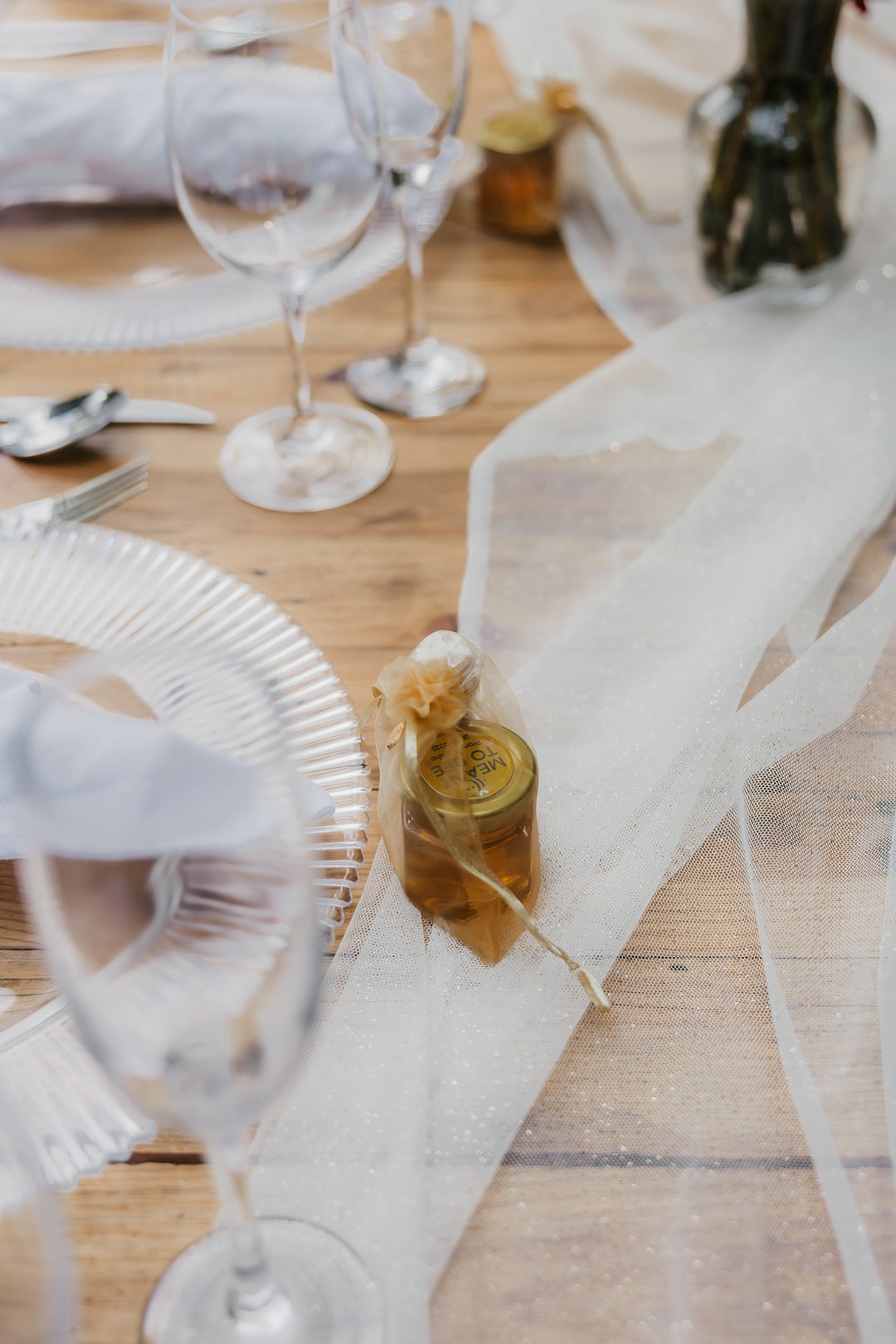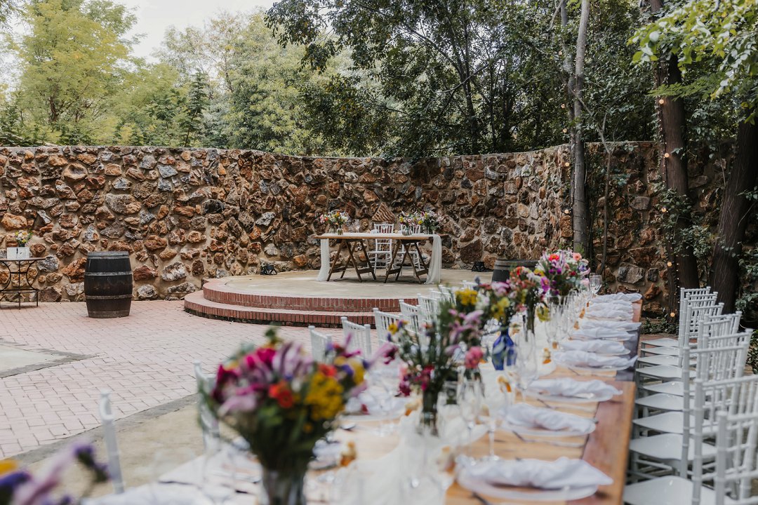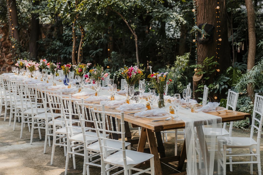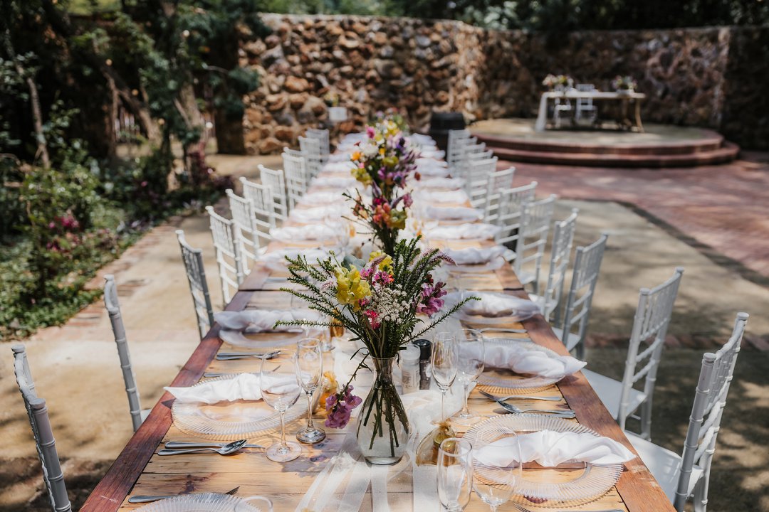 Die onthaal was net so elegant. Lang houttafels met wit tafellopers en glas onderborde het ʼn stylvolle basis gevorm. Kleurvolle blom ontwerpe en wit Tiffany-stoele die vrolike, verfynde tema voortgesit het.