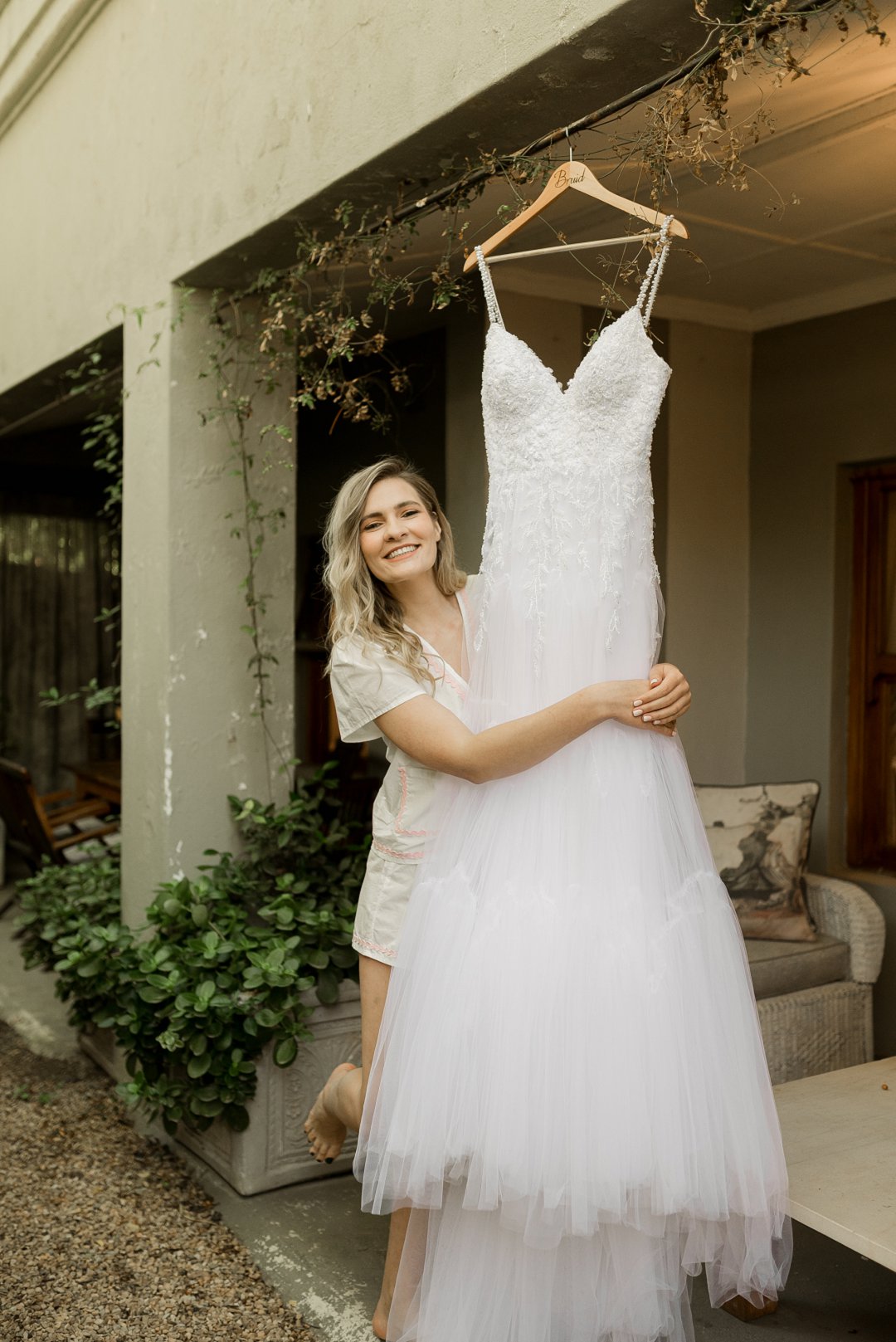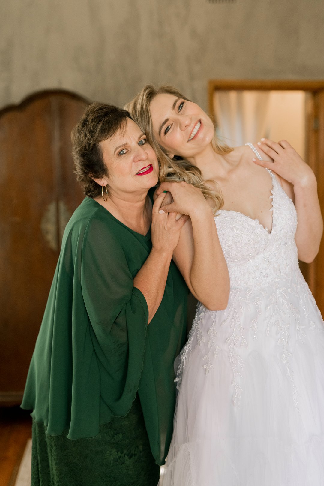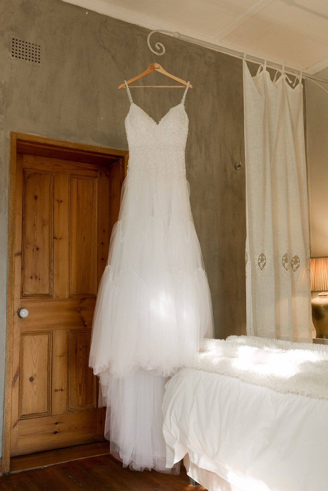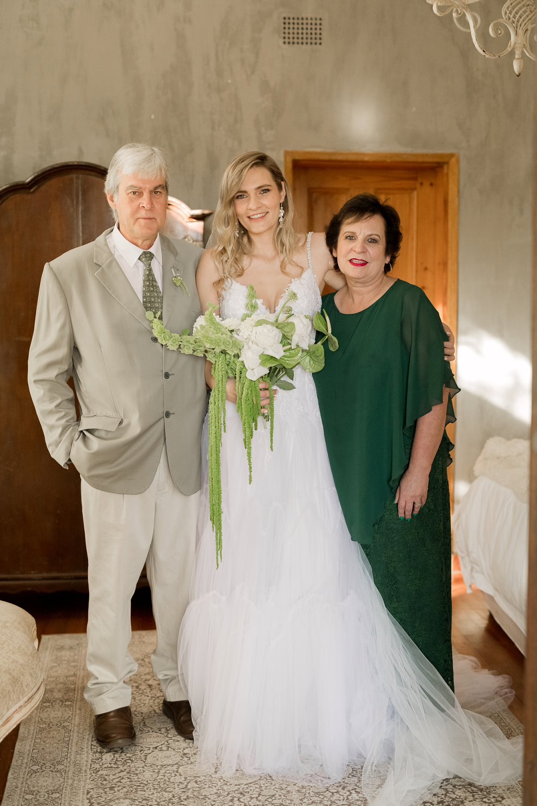 Die bruid het stralend gelyk in ’n rok wat spesiaal vir haar deur ’n vriendin gemaak is. Haar rok was ’n ligte, romantiese A-lyn silhoeët klassiek en vleiend. Die torso en skouerbandjies is versier met pêrels en fyn kralewerk wat blom- en blaarmotiewe subtiel laat skitter het. Die bruidegom het perfek by sy bruid én die gevoel van die troue gepas in ’n liggroen pak, vars wit hemp sonder das, en bruin leerskoene.