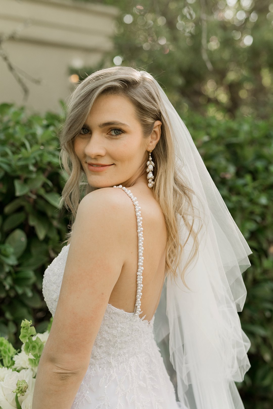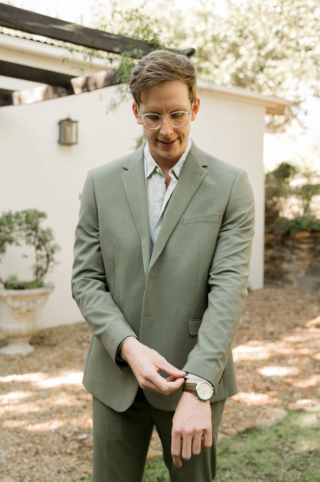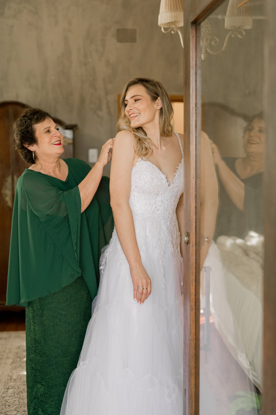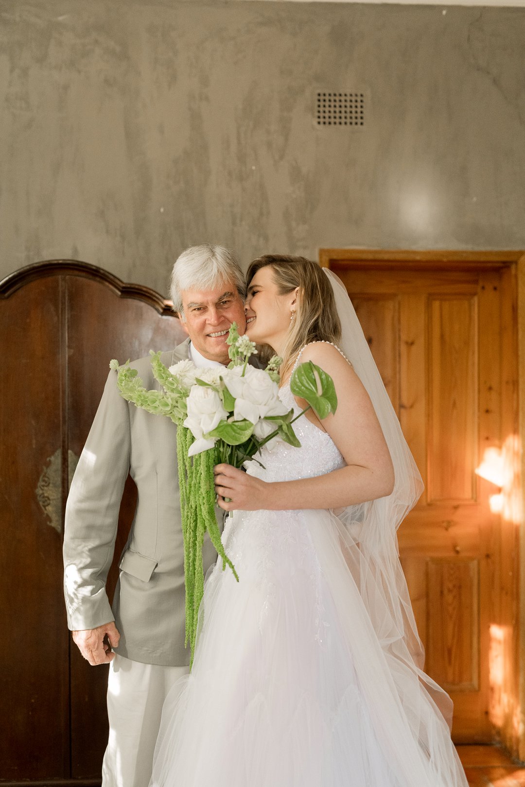 Die bruid het stralend gelyk in ’n rok wat spesiaal vir haar deur ’n vriendin gemaak is. Haar rok was ’n ligte, romantiese A-lyn silhoeët klassiek en vleiend. Die torso en skouerbandjies is versier met pêrels en fyn kralewerk wat blom- en blaarmotiewe subtiel laat skitter het. Die bruidegom het perfek by sy bruid én die gevoel van die troue gepas in ’n liggroen pak, vars wit hemp sonder das, en bruin leerskoene.