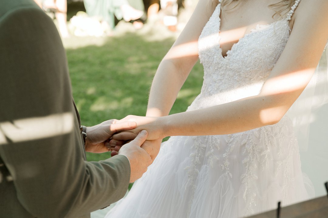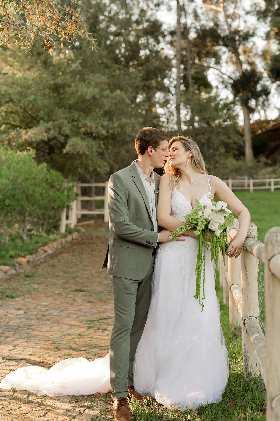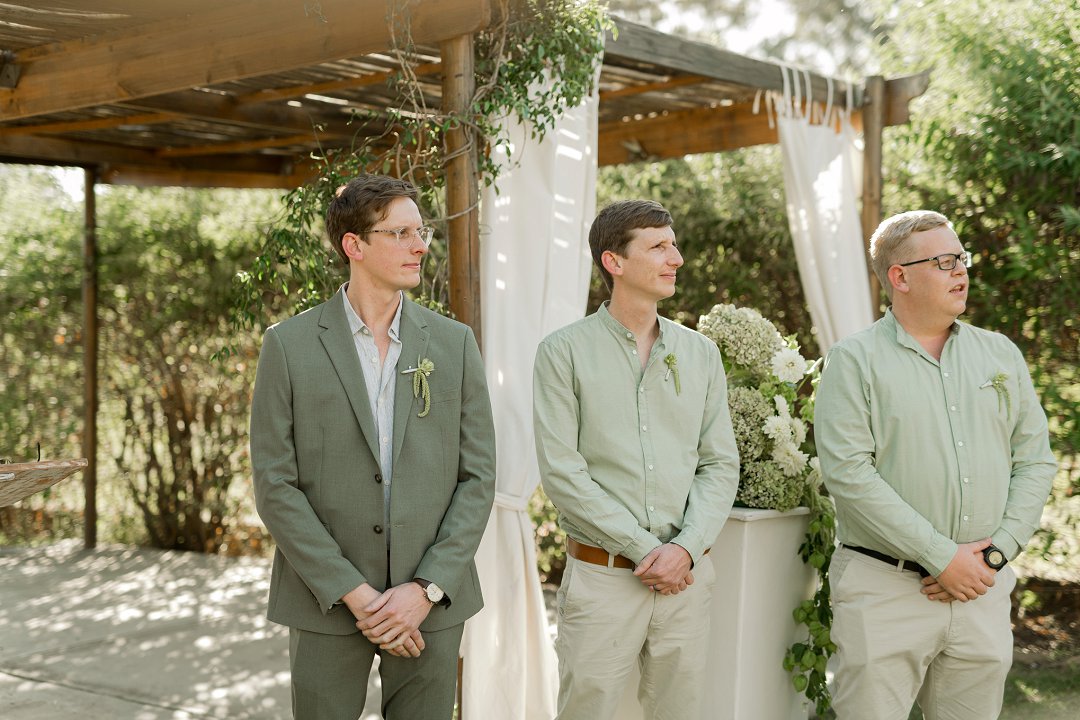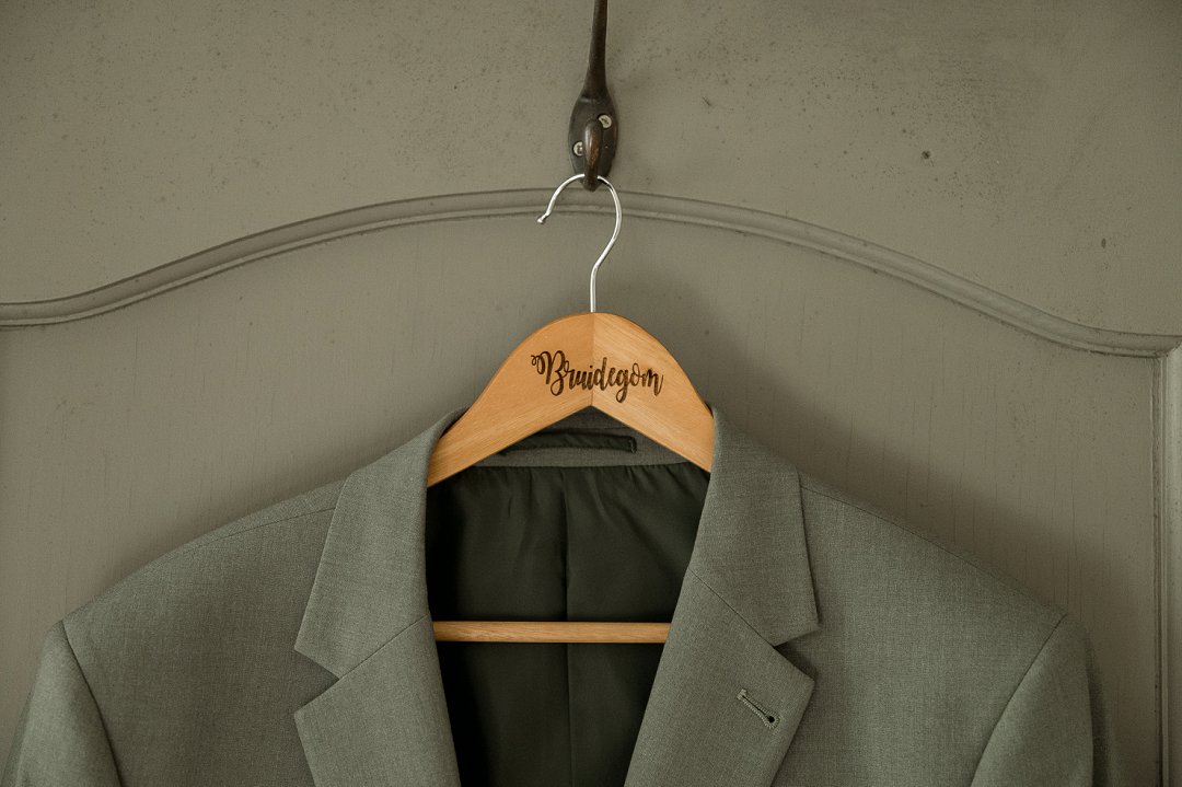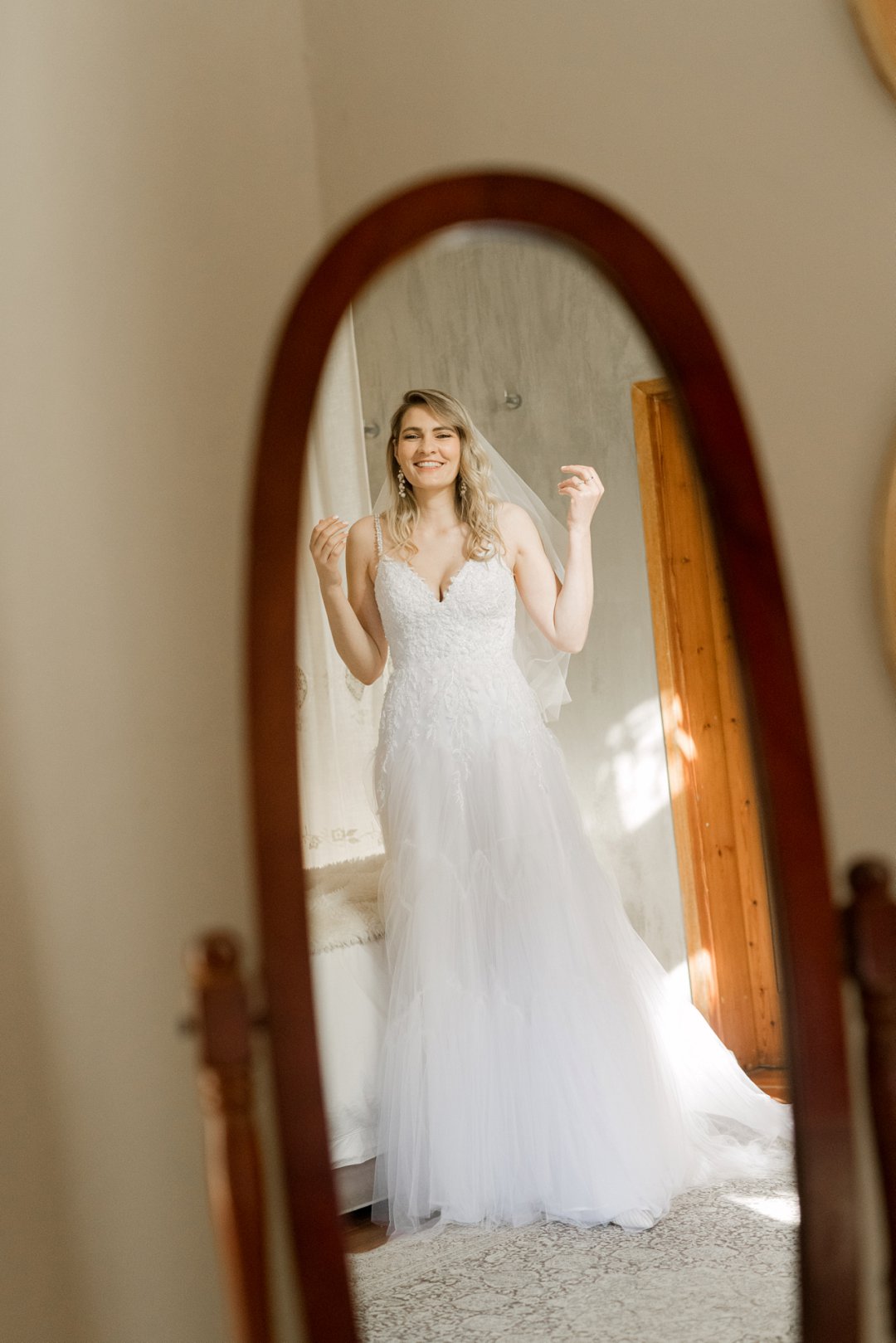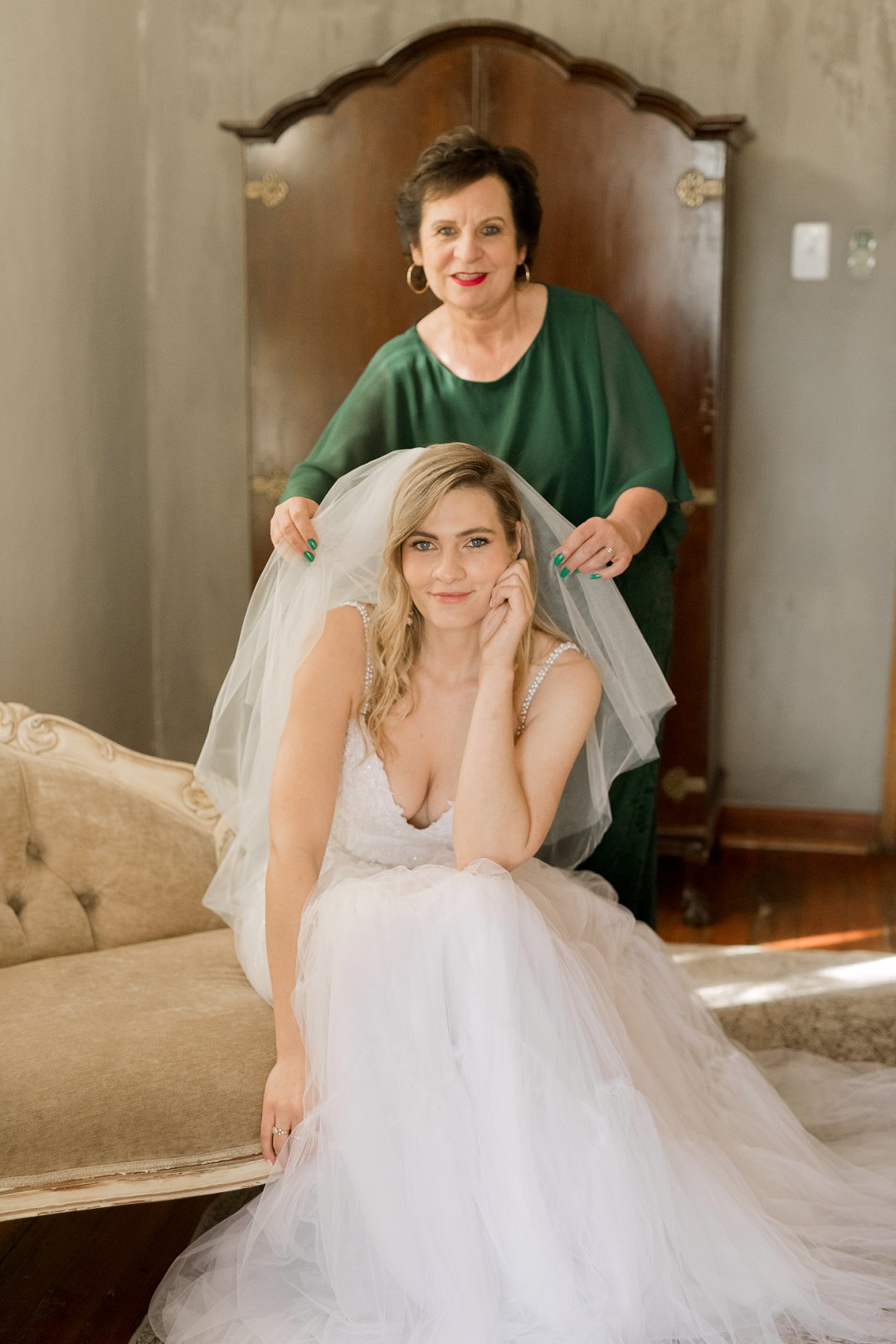 Die bruid het stralend gelyk in ’n rok wat spesiaal vir haar deur ’n vriendin gemaak is. Haar rok was ’n ligte, romantiese A-lyn silhoeët klassiek en vleiend. Die torso en skouerbandjies is versier met pêrels en fyn kralewerk wat blom- en blaarmotiewe subtiel laat skitter het. Die bruidegom het perfek by sy bruid én die gevoel van die troue gepas in ’n liggroen pak, vars wit hemp sonder das, en bruin leerskoene.