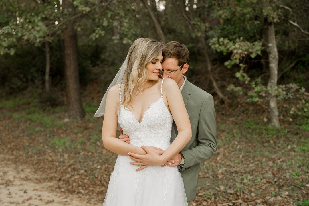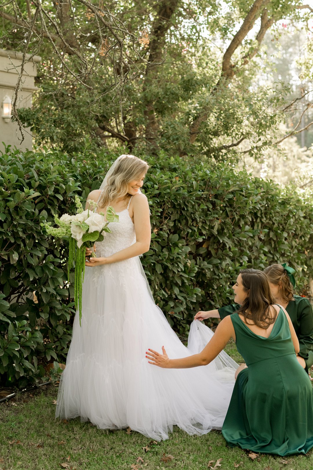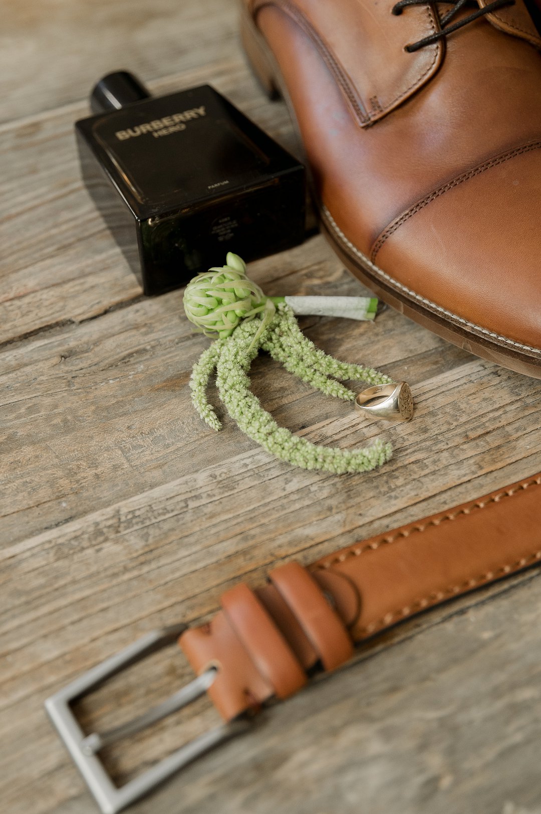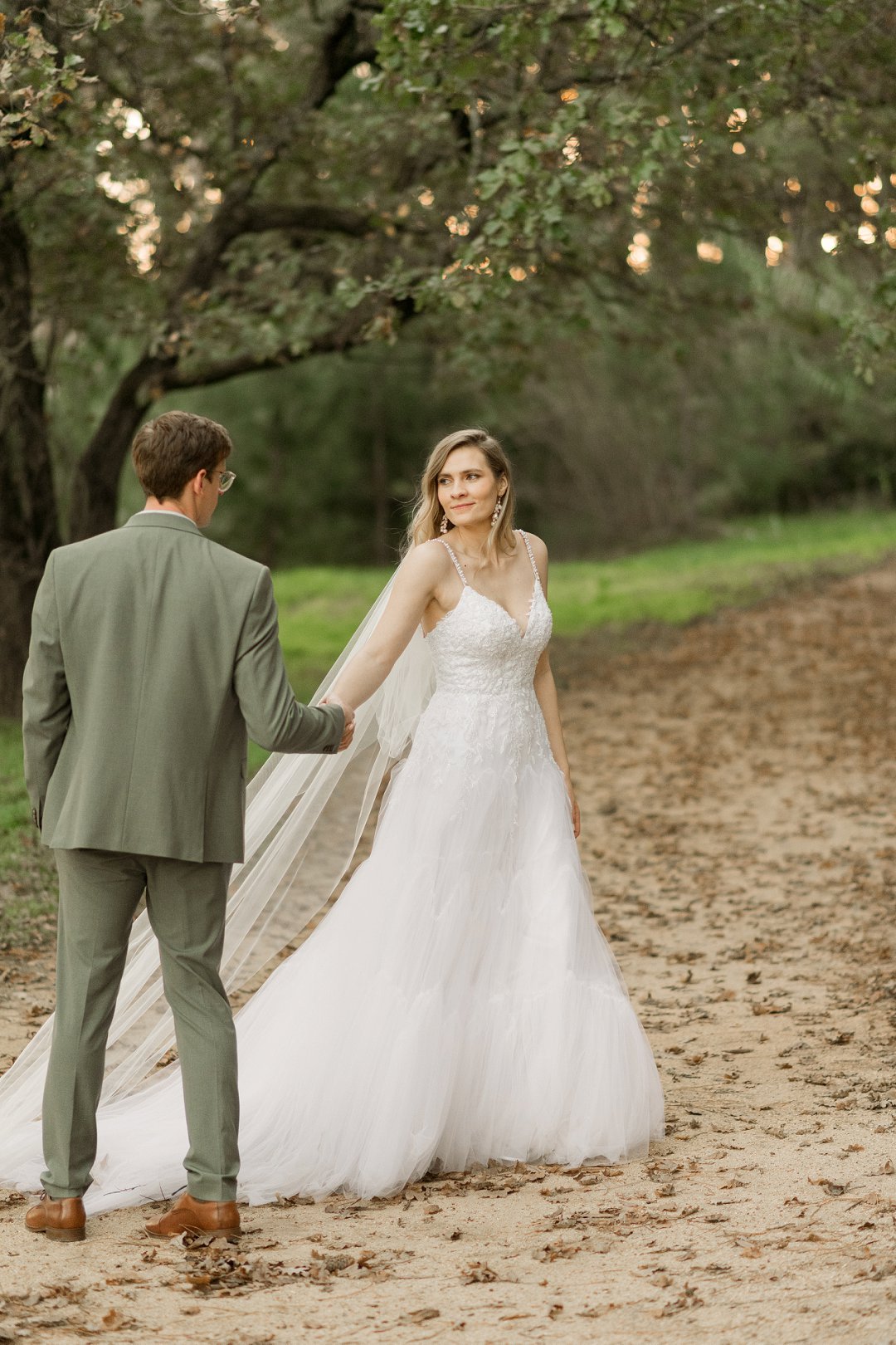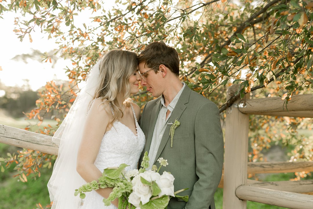 Die bruid het stralend gelyk in ’n rok wat spesiaal vir haar deur ’n vriendin gemaak is. Haar rok was ’n ligte, romantiese A-lyn silhoeët klassiek en vleiend. Die torso en skouerbandjies is versier met pêrels en fyn kralewerk wat blom- en blaarmotiewe subtiel laat skitter het. Die bruidegom het perfek by sy bruid én die gevoel van die troue gepas in ’n liggroen pak, vars wit hemp sonder das, en bruin leerskoene.