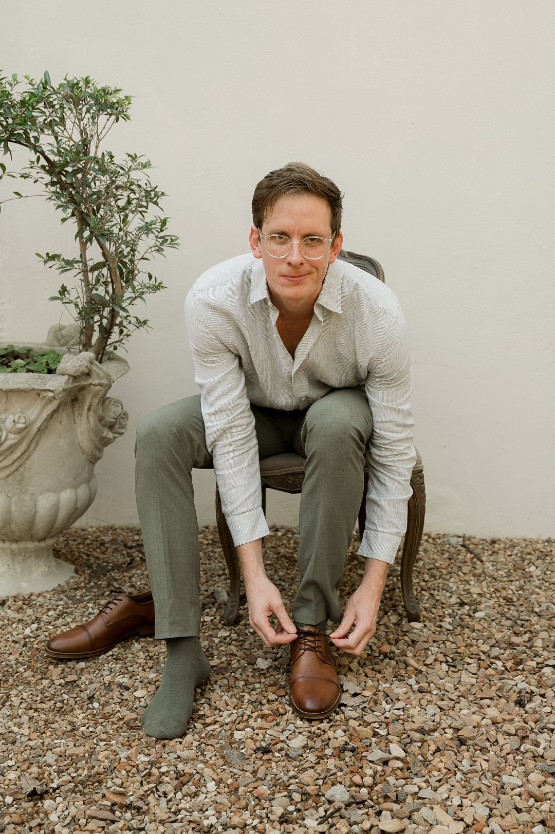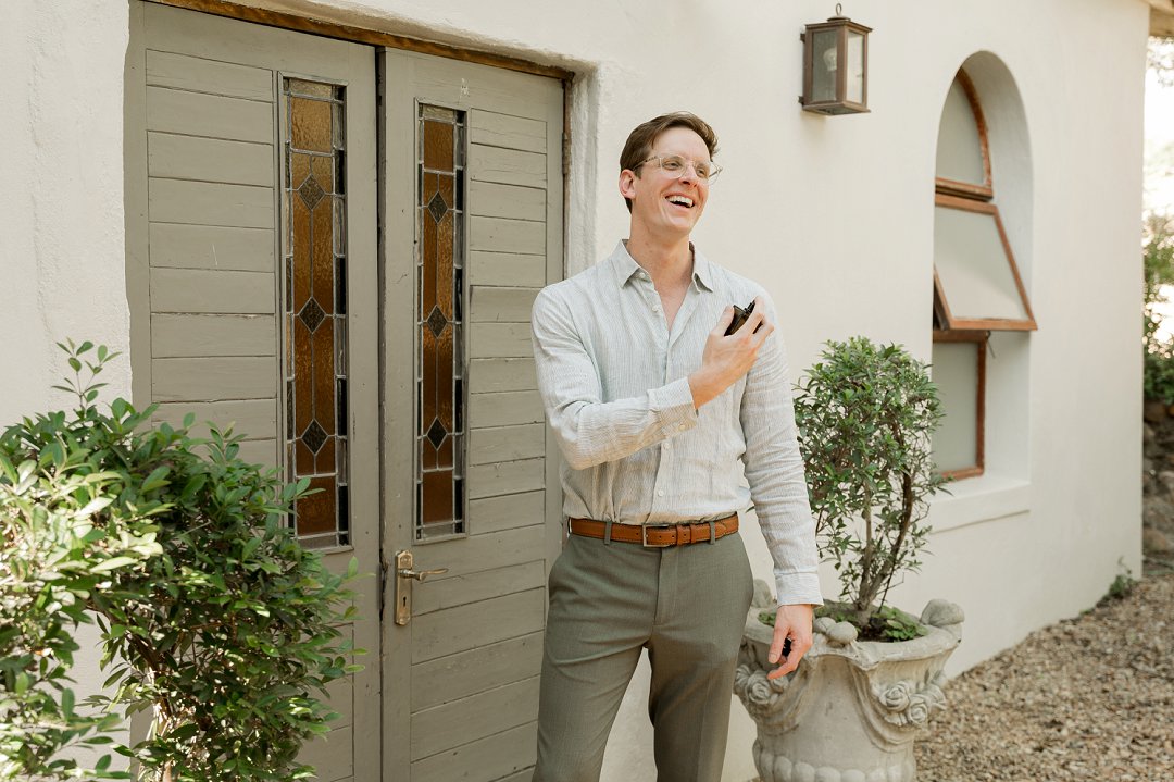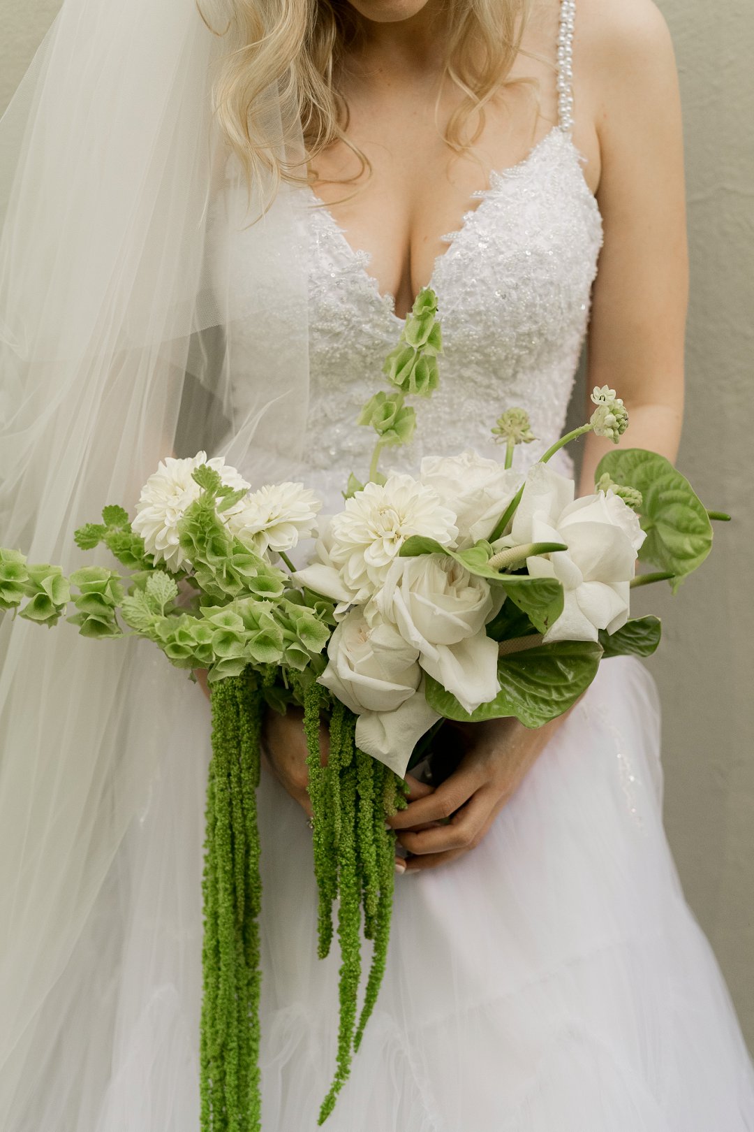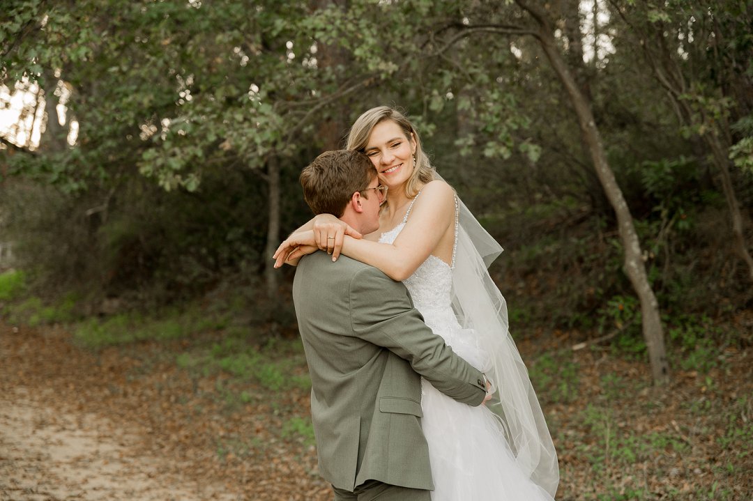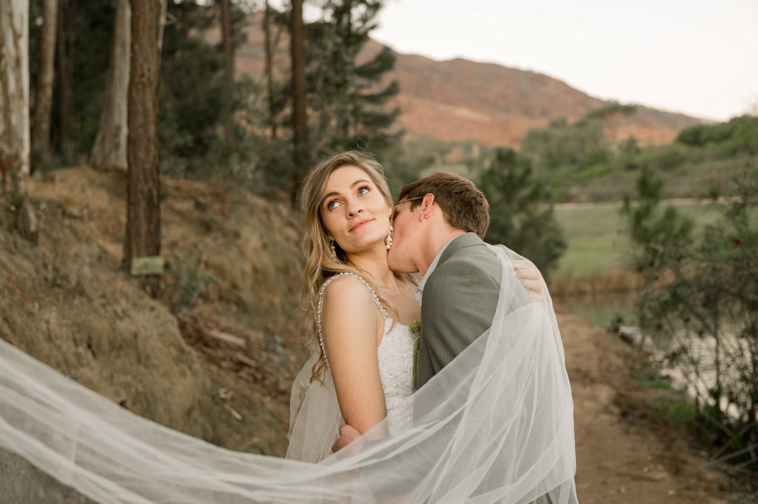 Die bruid het stralend gelyk in ’n rok wat spesiaal vir haar deur ’n vriendin gemaak is. Haar rok was ’n ligte, romantiese A-lyn silhoeët klassiek en vleiend. Die torso en skouerbandjies is versier met pêrels en fyn kralewerk wat blom- en blaarmotiewe subtiel laat skitter het. Die bruidegom het perfek by sy bruid én die gevoel van die troue gepas in ’n liggroen pak, vars wit hemp sonder das, en bruin leerskoene.