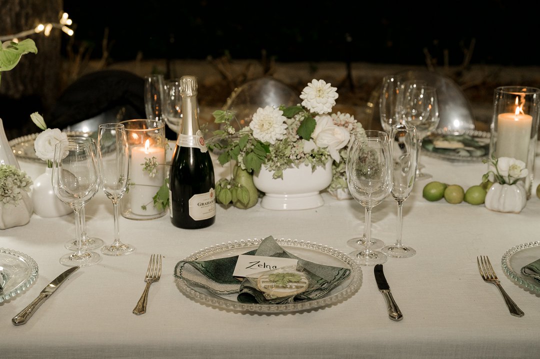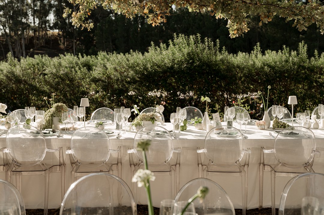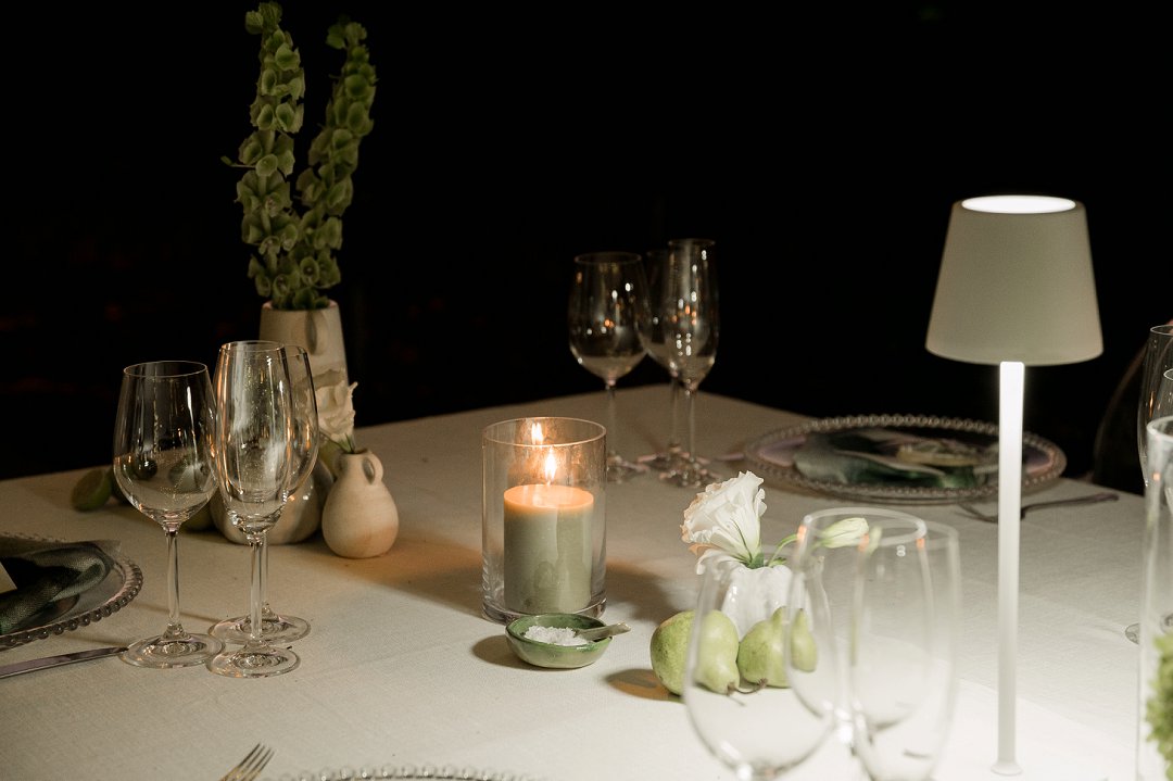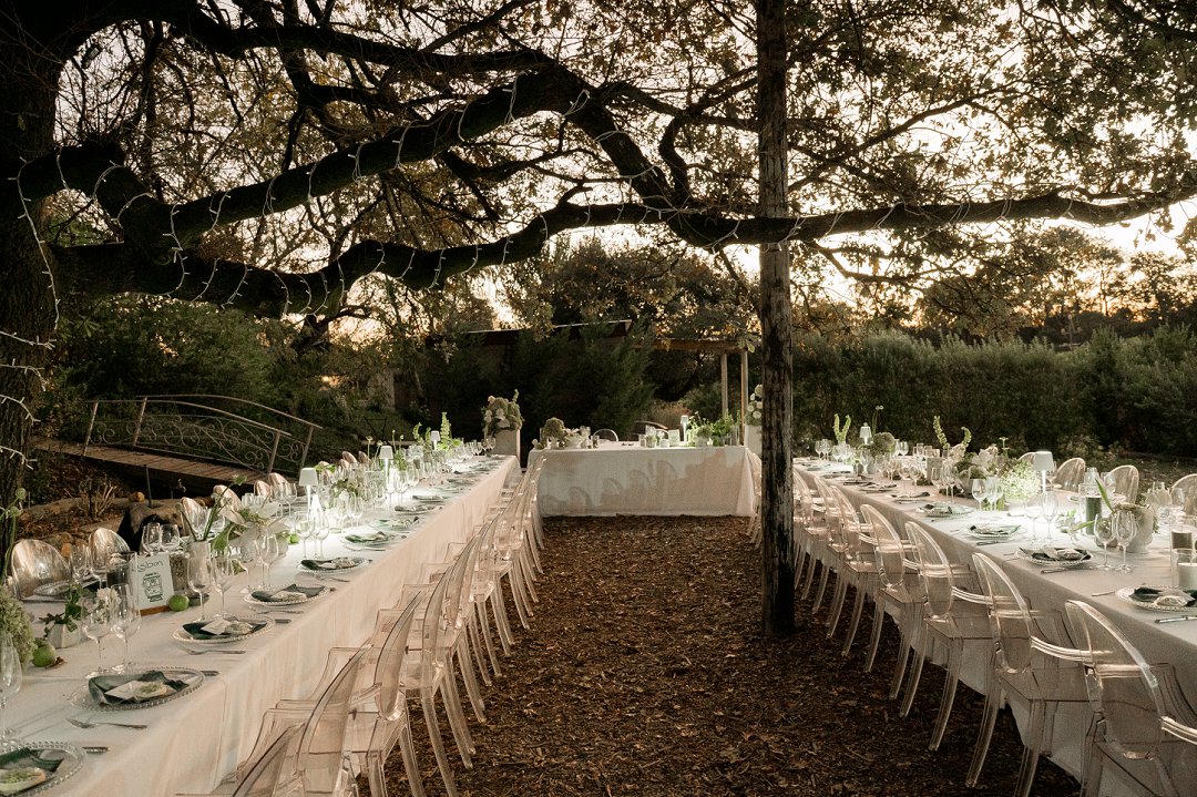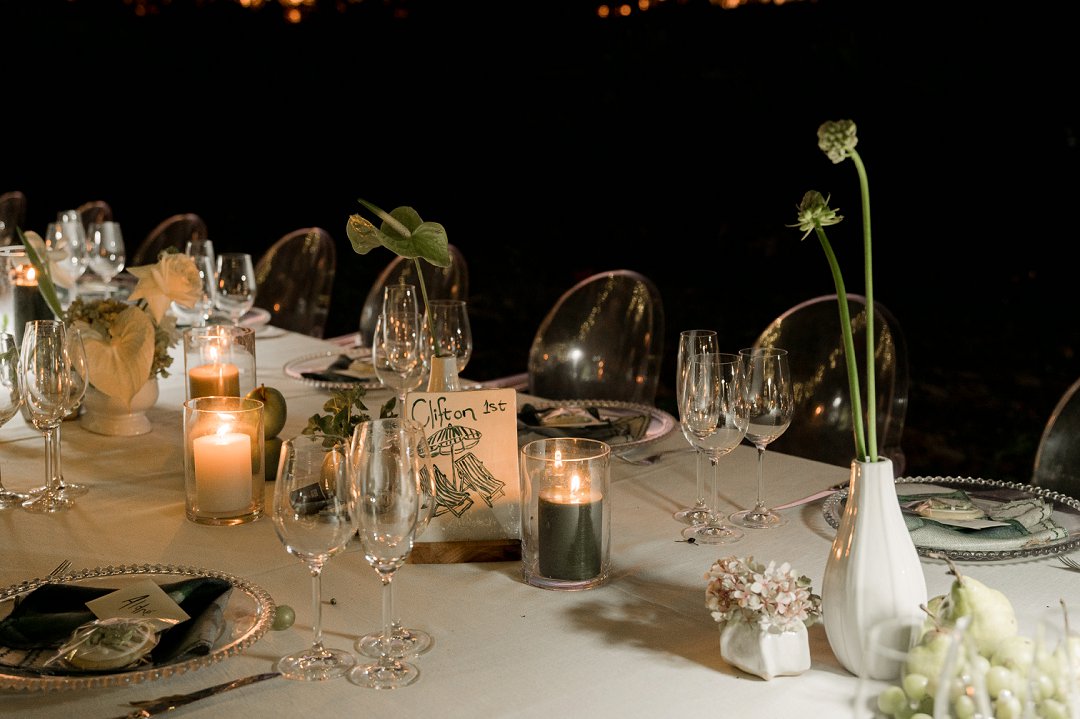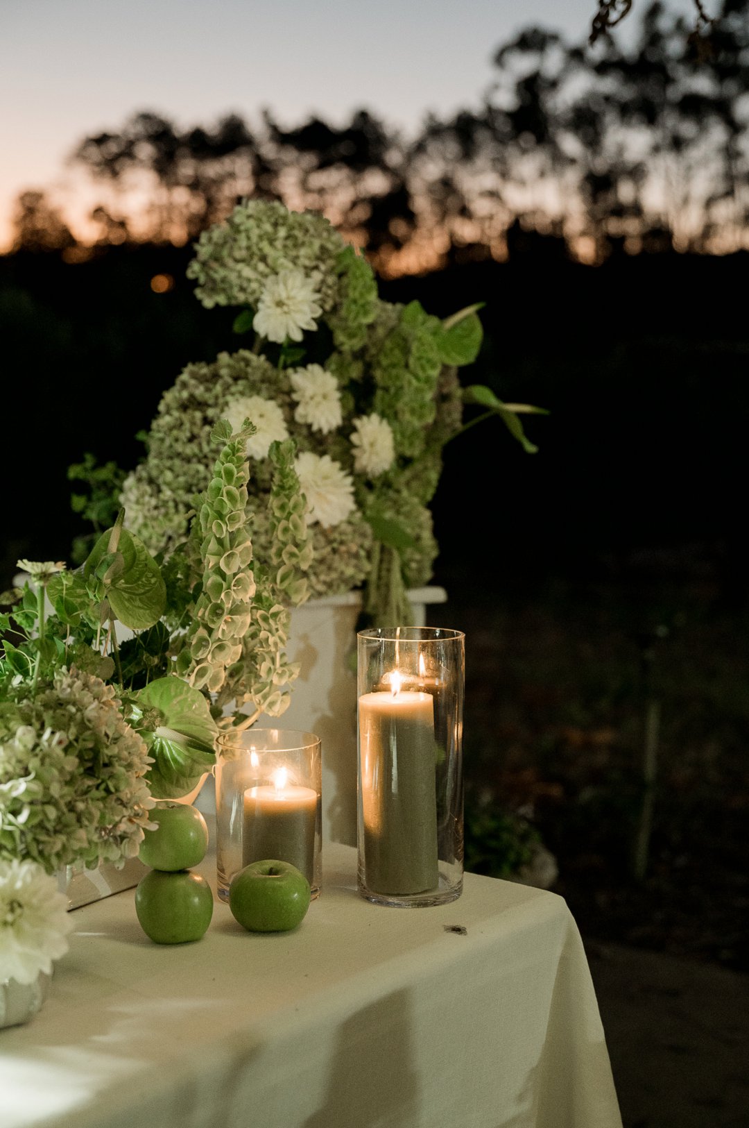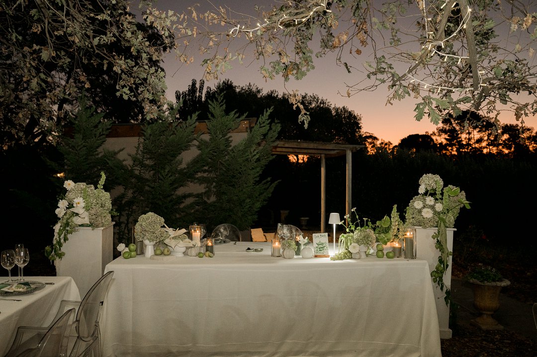 Die tafels was elegant versier met wit tafeldoeke wat tot op die grond gehang het, deurskynende stoele en ’n ontspanne rangskikking van blomme, vrugte en potjies wat die paartjie self gemaak het. Tesame met kerse het lanterns op die tafels ’n unieke en rustige atmosfeer geskep wat die dekor van hierdie troue só besonders gemaak het.