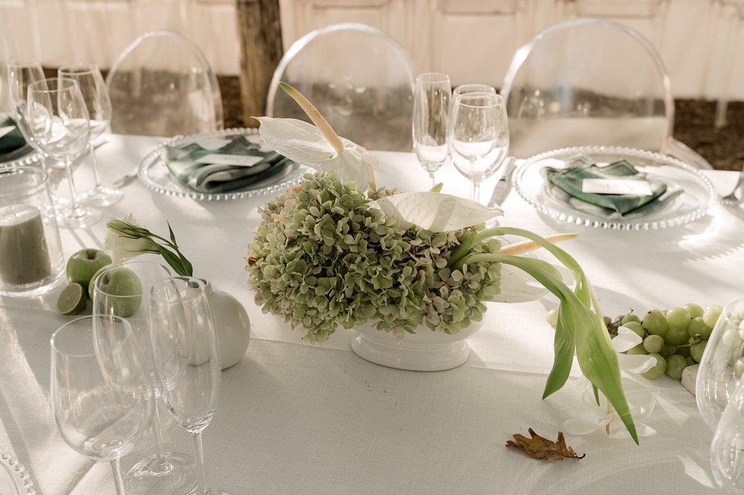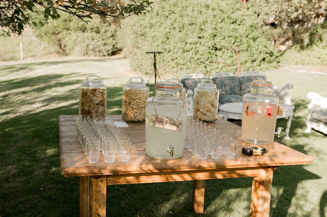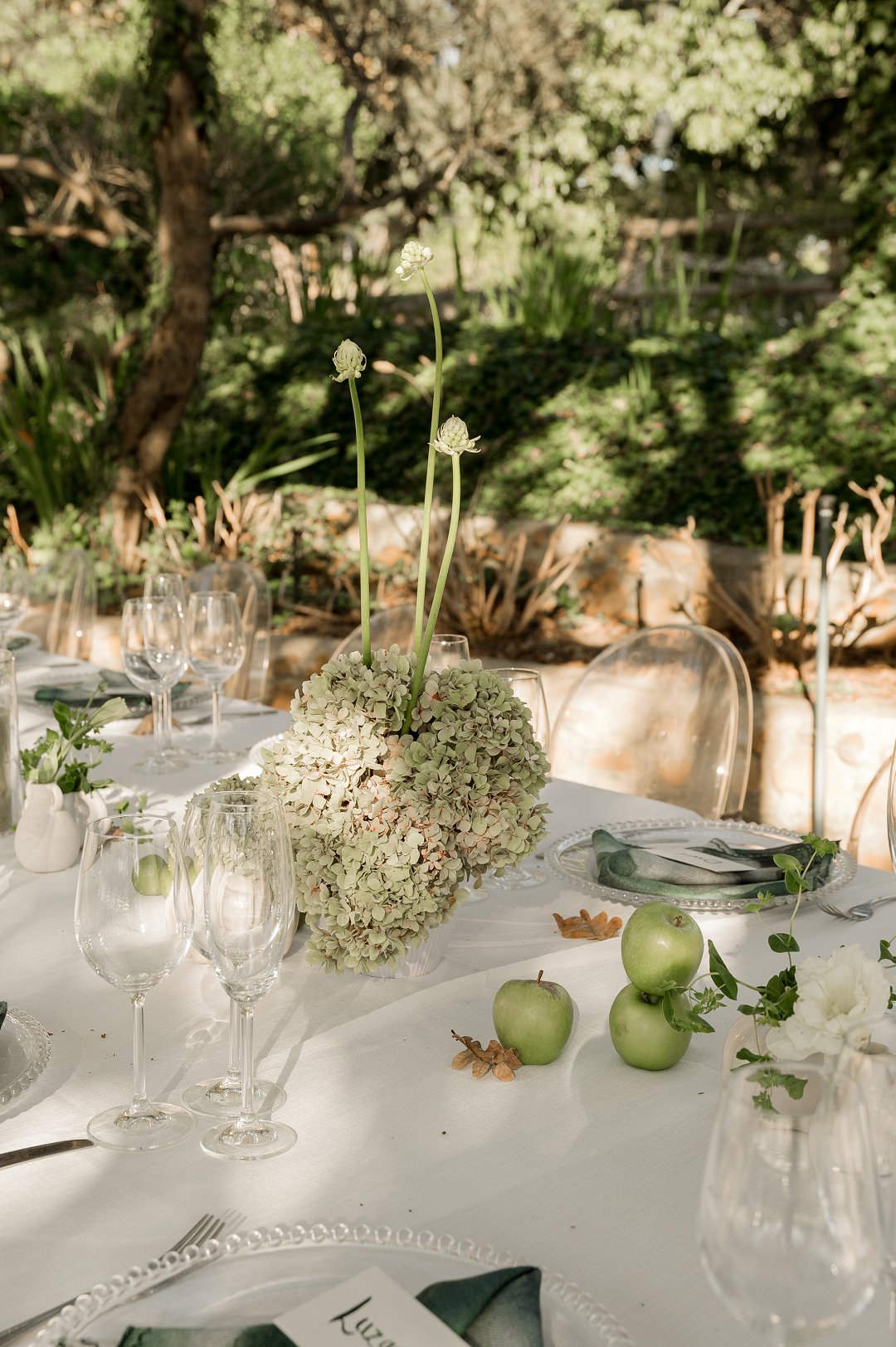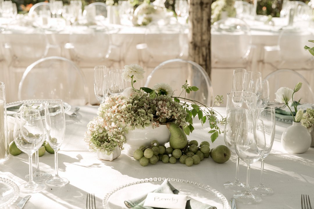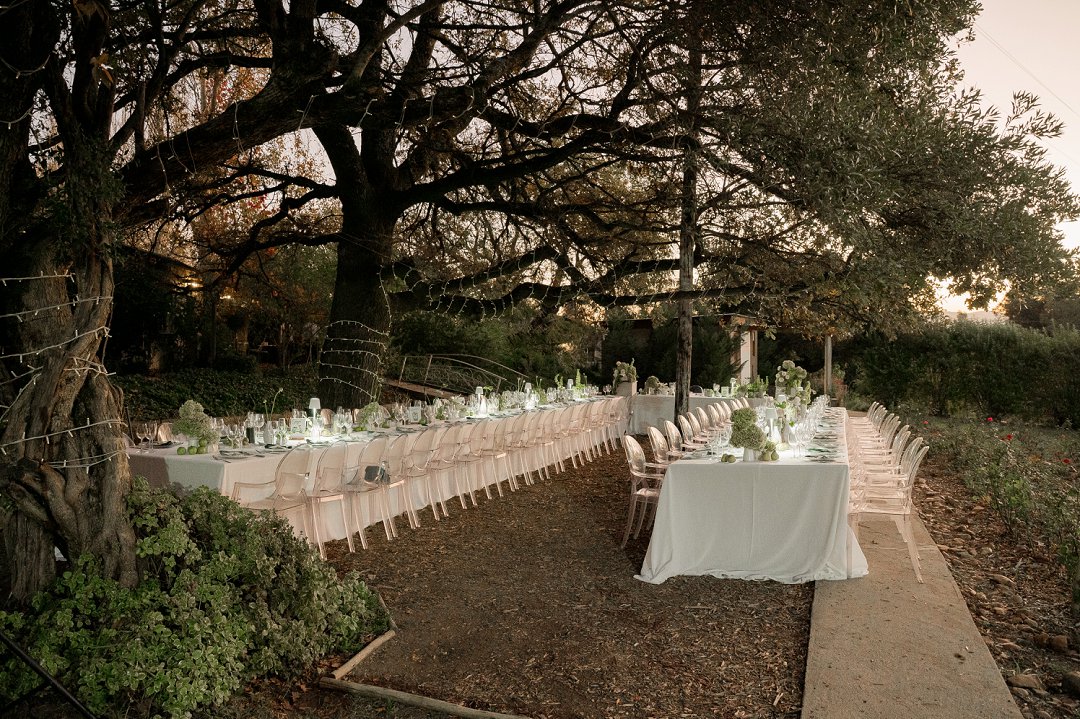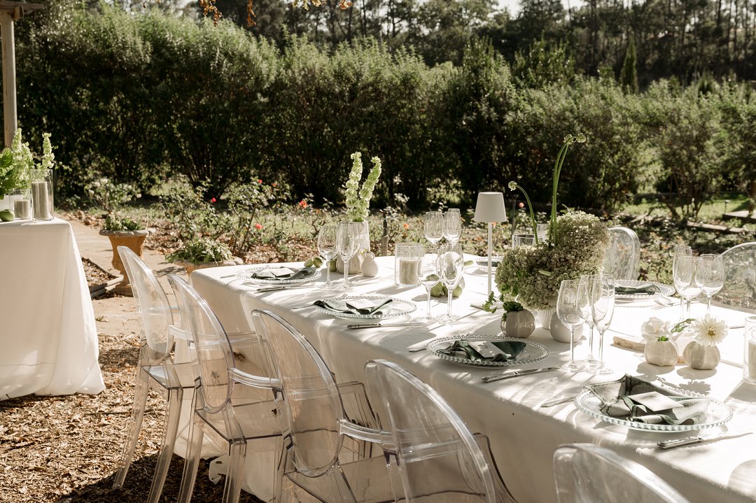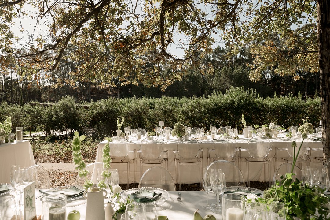 Die tafels was elegant versier met wit tafeldoeke wat tot op die grond gehang het, deurskynende stoele en ’n ontspanne rangskikking van blomme, vrugte en potjies wat die paartjie self gemaak het. Tesame met kerse het lanterns op die tafels ’n unieke en rustige atmosfeer geskep wat die dekor van hierdie troue só besonders gemaak het.