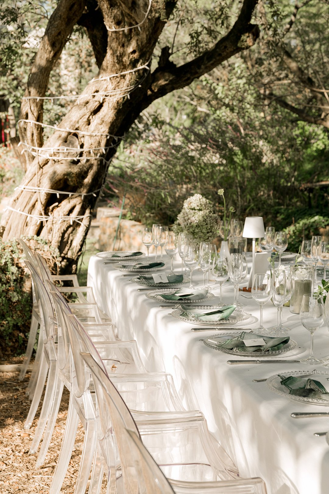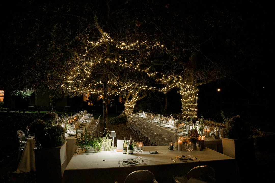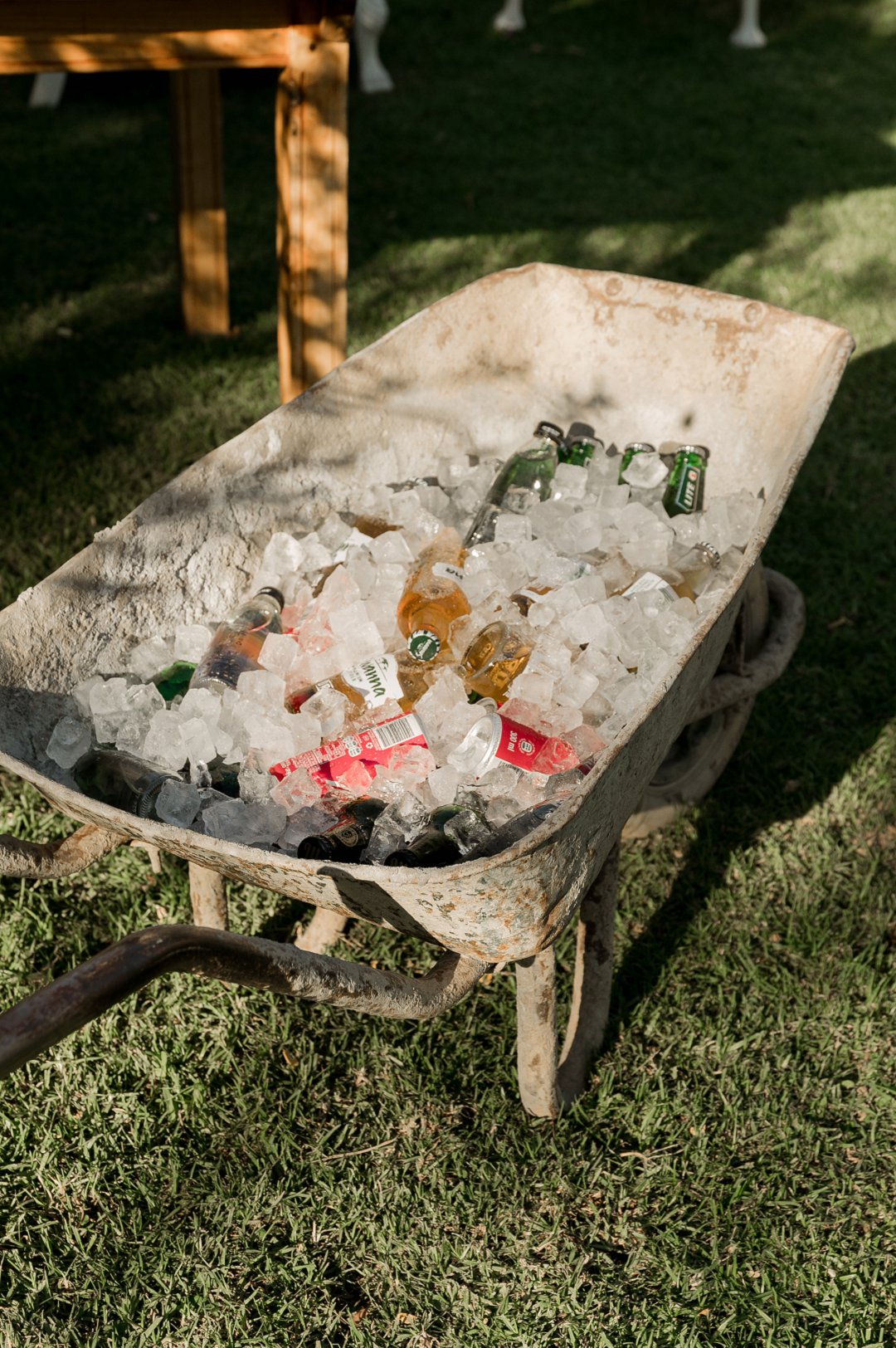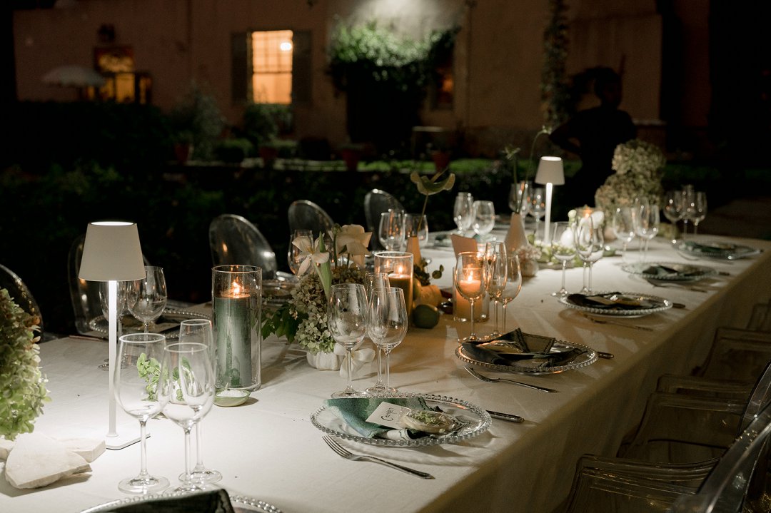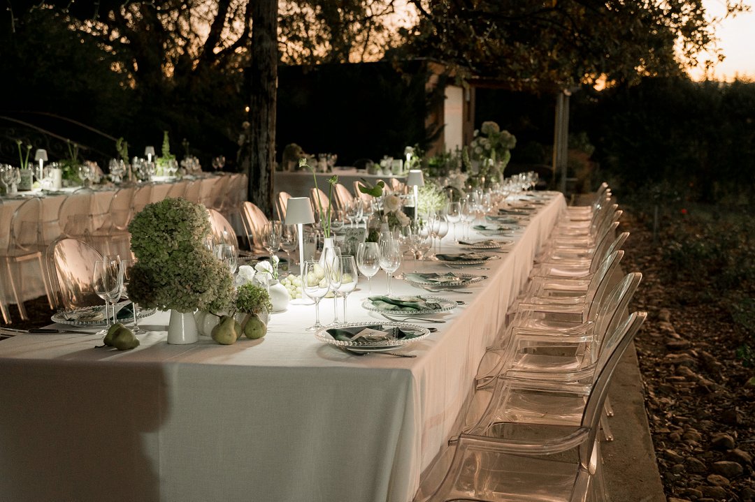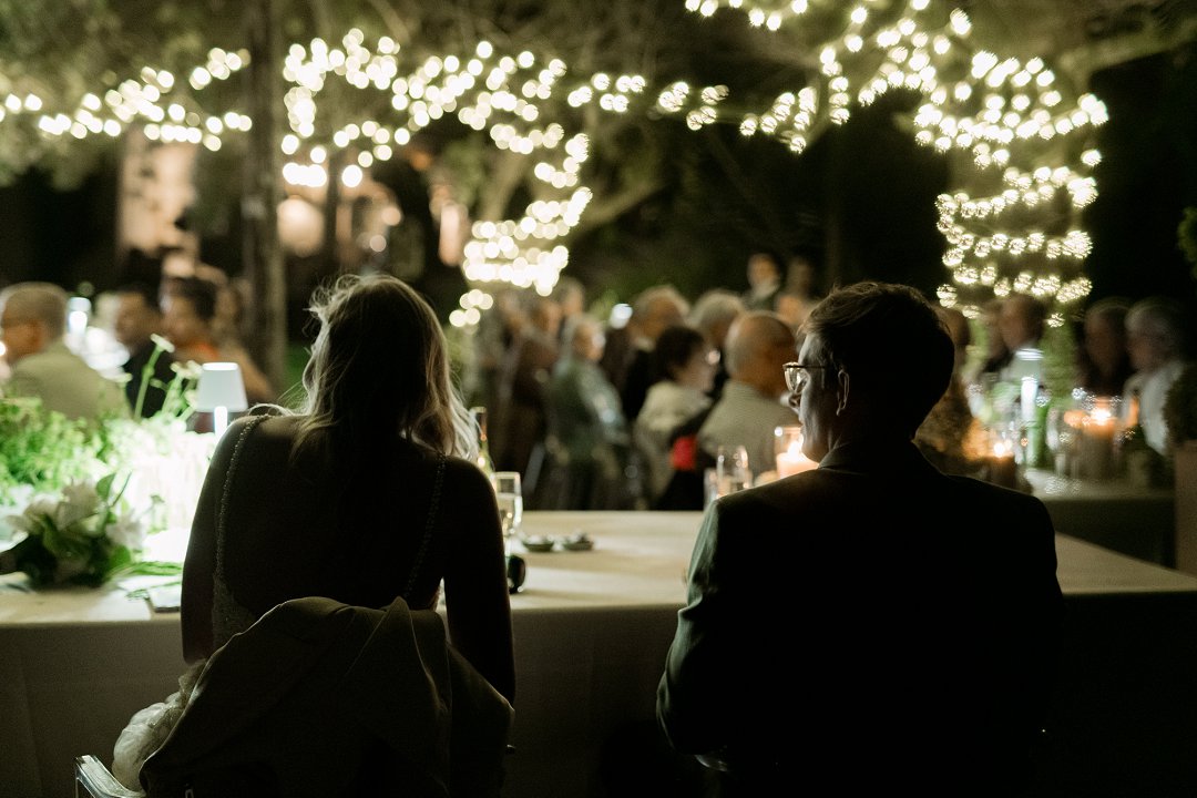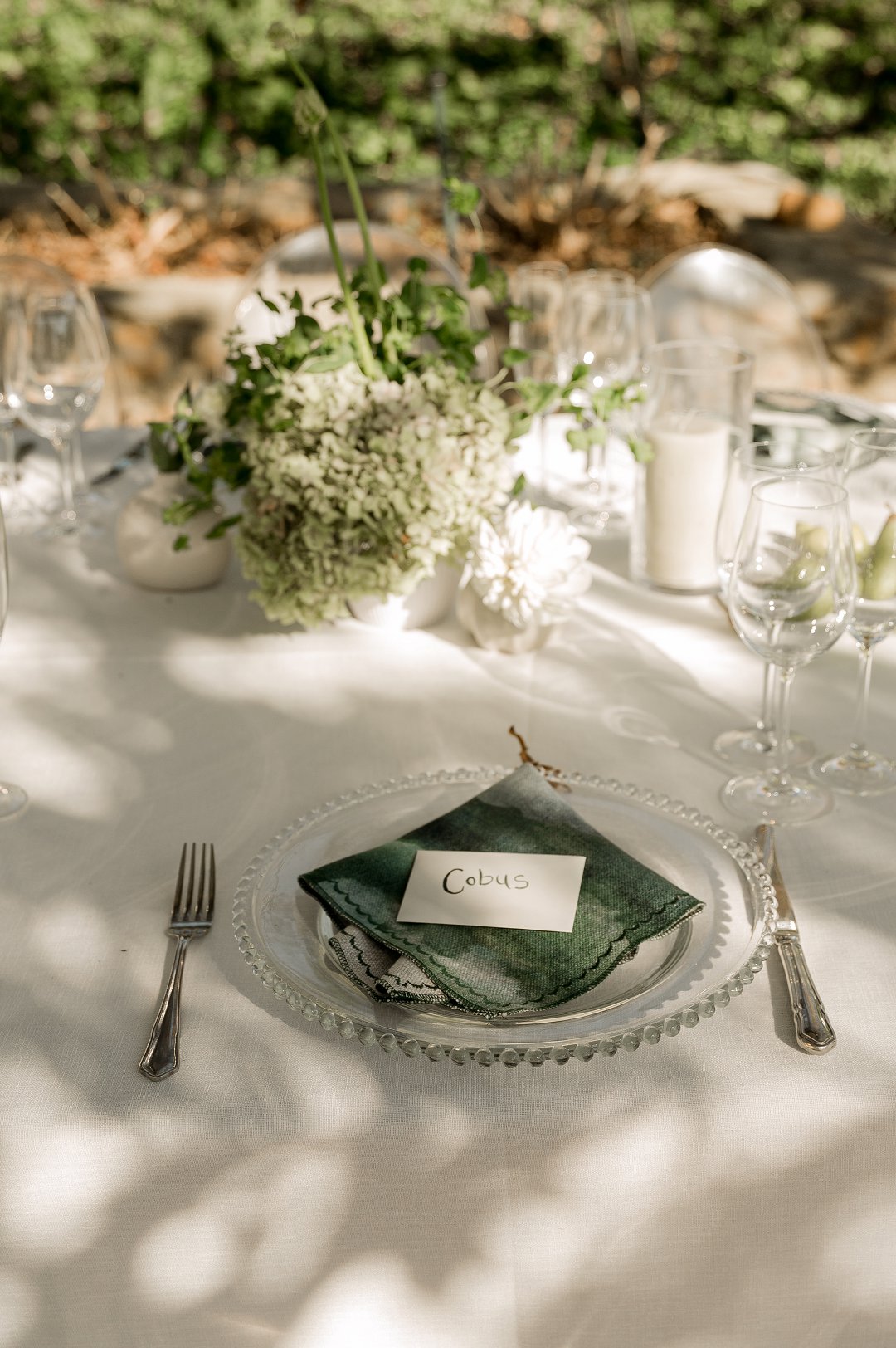 Die tafels was elegant versier met wit tafeldoeke wat tot op die grond gehang het, deurskynende stoele en ’n ontspanne rangskikking van blomme, vrugte en potjies wat die paartjie self gemaak het. Tesame met kerse het lanterns op die tafels ’n unieke en rustige atmosfeer geskep wat die dekor van hierdie troue só besonders gemaak het.