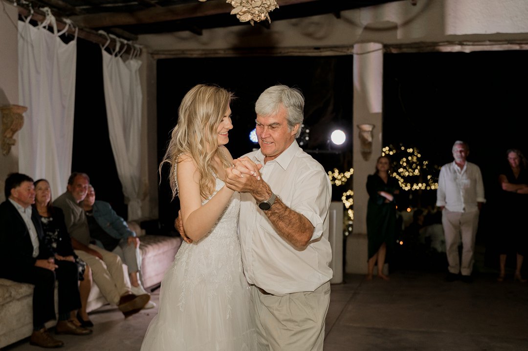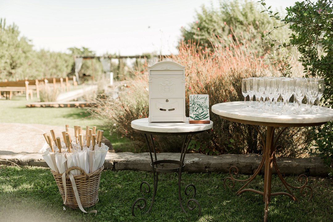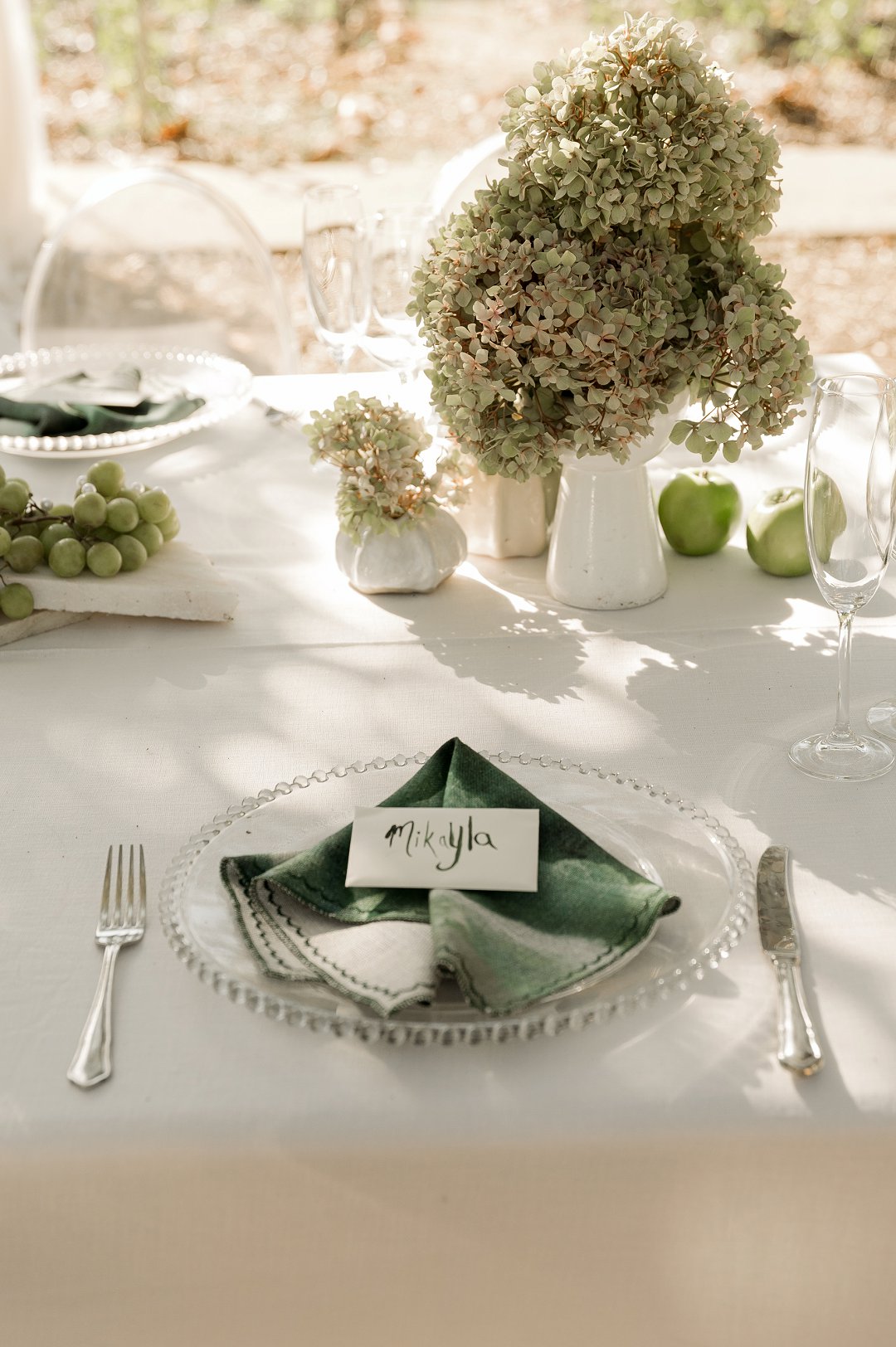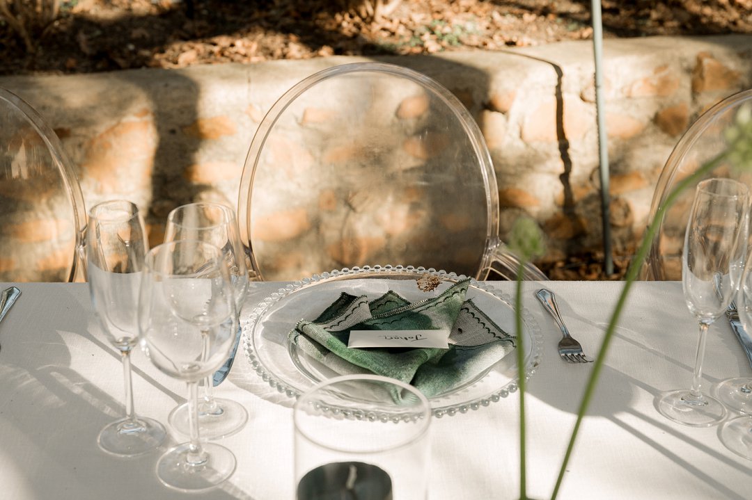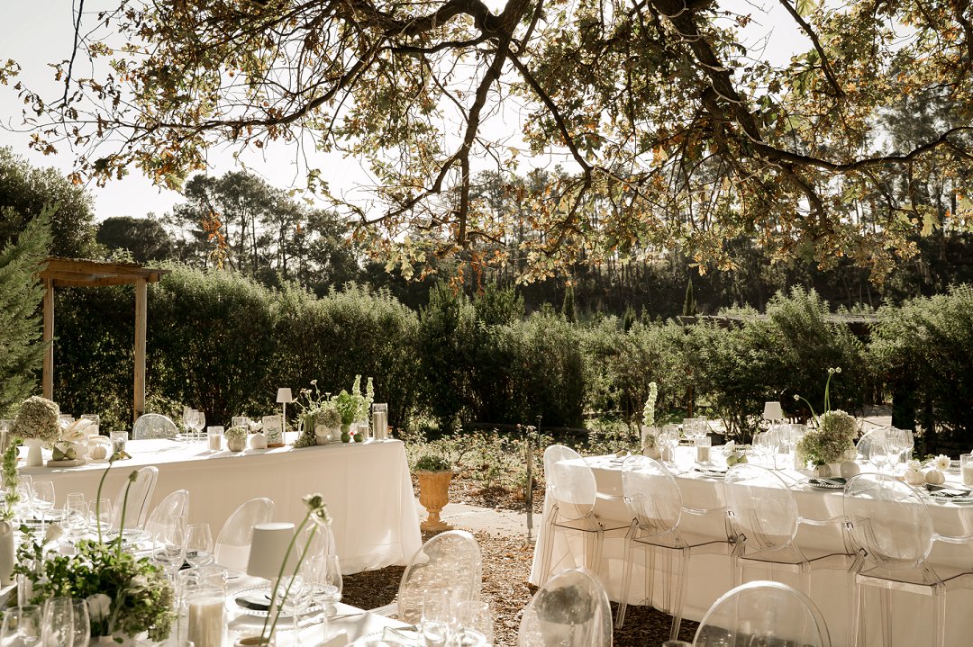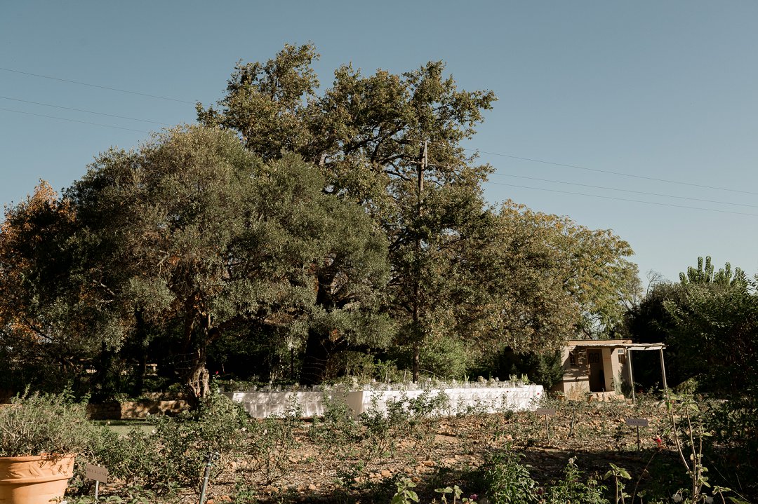 Die tafels was elegant versier met wit tafeldoeke wat tot op die grond gehang het, deurskynende stoele en ’n ontspanne rangskikking van blomme, vrugte en potjies wat die paartjie self gemaak het. Tesame met kerse het lanterns op die tafels ’n unieke en rustige atmosfeer geskep wat die dekor van hierdie troue só besonders gemaak het.