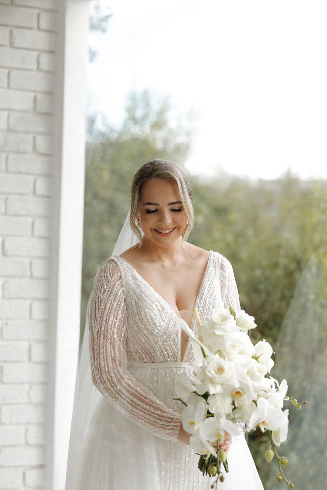 Ons troue was die perfekte kombinasie van moderne styl en elegante eenvoud, met elke element fyn beplan om ’n gevoel van tydloosheid te skep. Die kleurskema van die dekor was klassiek wit, wat oral deurgetrek is van die blomme tot dekor, terwyl al ons gaste pik swart gedra het. (Die bruidegom en twee ma’s het emerald groen gedra om uit te staan)