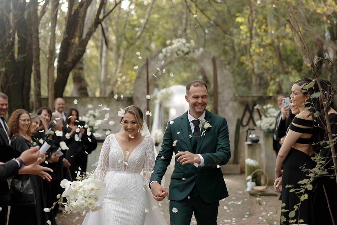 Wat die paartjie se troue so besonders maak, is die harmonie tussen formaliteit, minimalisme en die stylvolle gebruik van swart-en-wit elemente wat saam ʼn tydlose atmosfeer skep. Die buitelug seremonie is in ʼn dig beboste area gehou waar wit blomme in swart potjies oral gesien kon word.