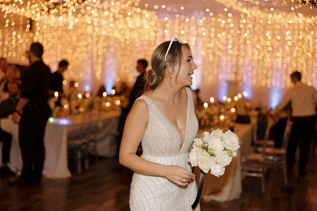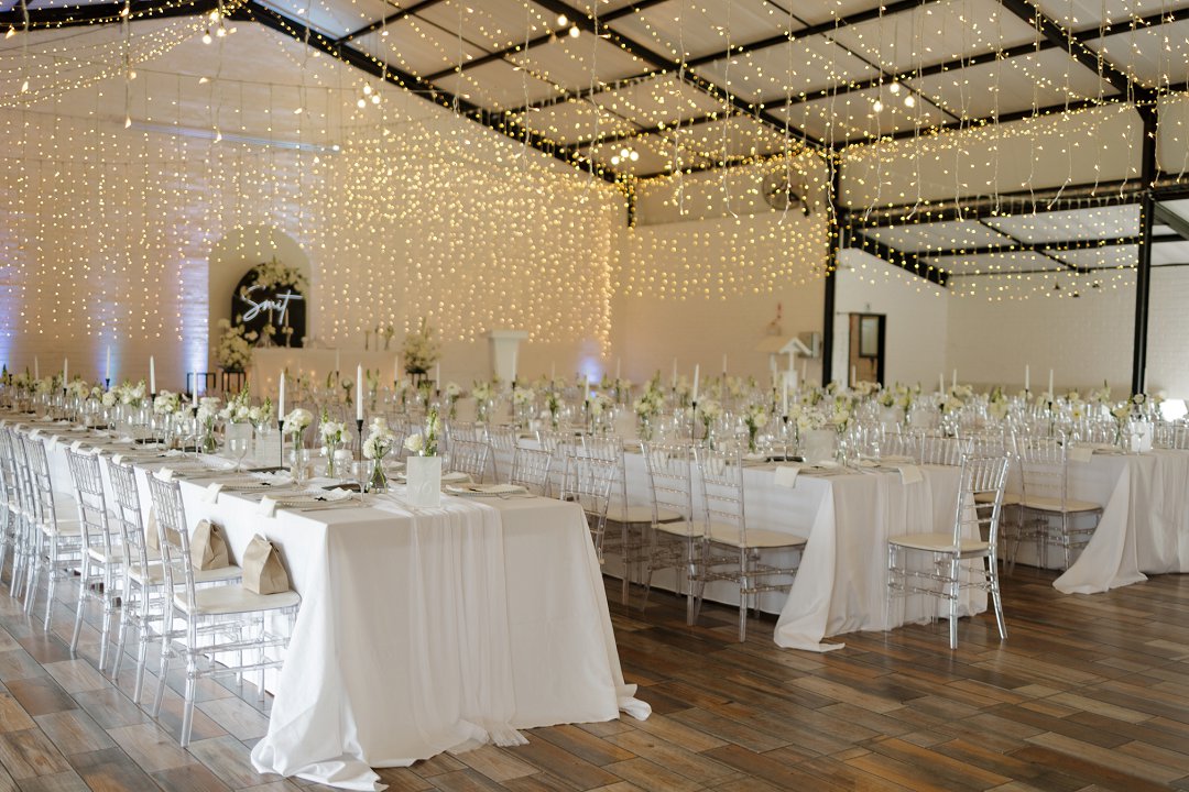 In die onthaalruimte het dit gevoel soos ’n modern sprokieswêreld, maar met ’n romantiese atmosfeer wat jou dadelik ingetrek het. Die beligting was sag en het die wit elemente van die dekor perfek beklemtoon. Die tafels was lank gedek met wit tafellinne, helder glasware en elegante wit blommerangskikking. Ons het vier lang tafels gehad wat dadelik ʼn gevoel van saamhorigheid geskep het.