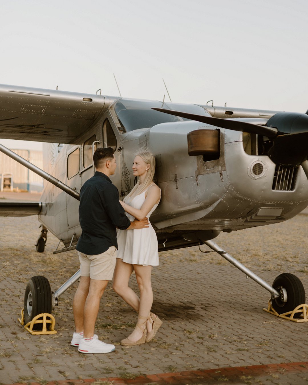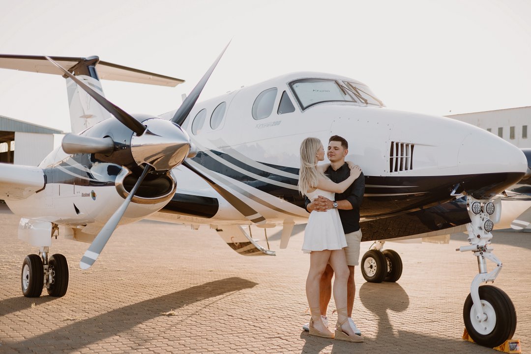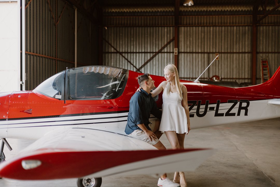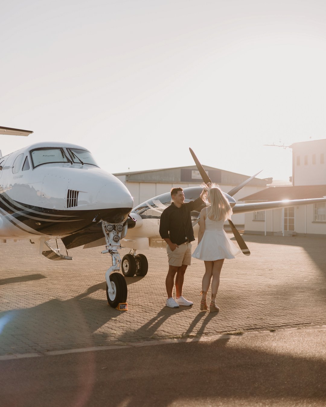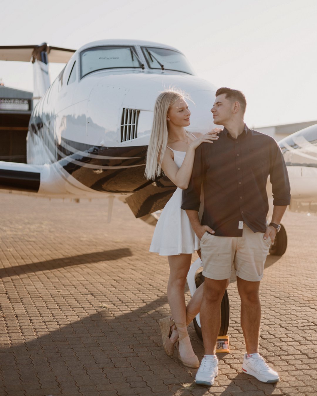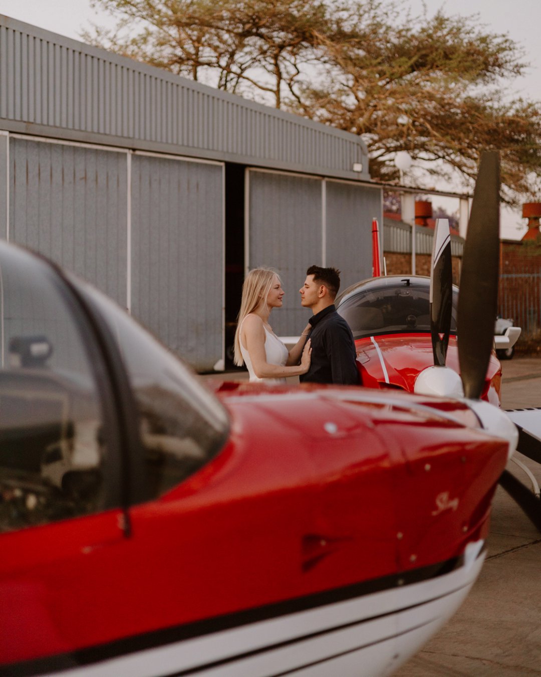 Hunter en Lana se fotosessie is werklik iets besonders. Die sagte oranje sonsaklig skep ’n romantiese, amper dromerige atmosfeer in die foto’s. En vir almal wat van vliegtuie hou, of dit bloot interessant vind, sal hierdie sessie beslis betowerend wees. Verskeie vliegtuie het as agtergrond gedien vir hul spesiale en betekenisvolle fotosessie.