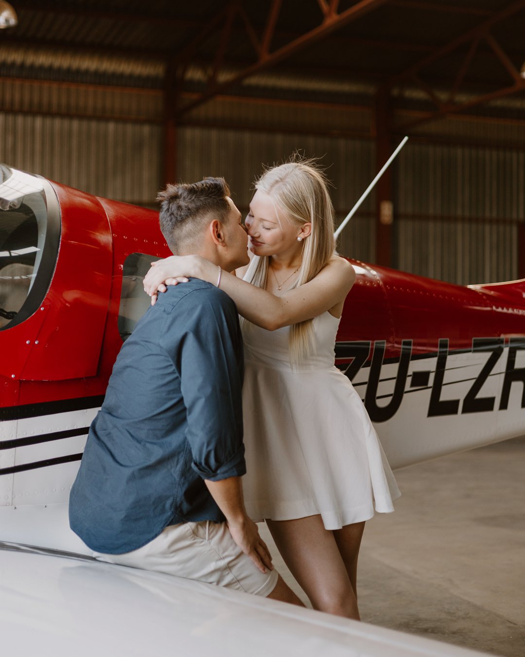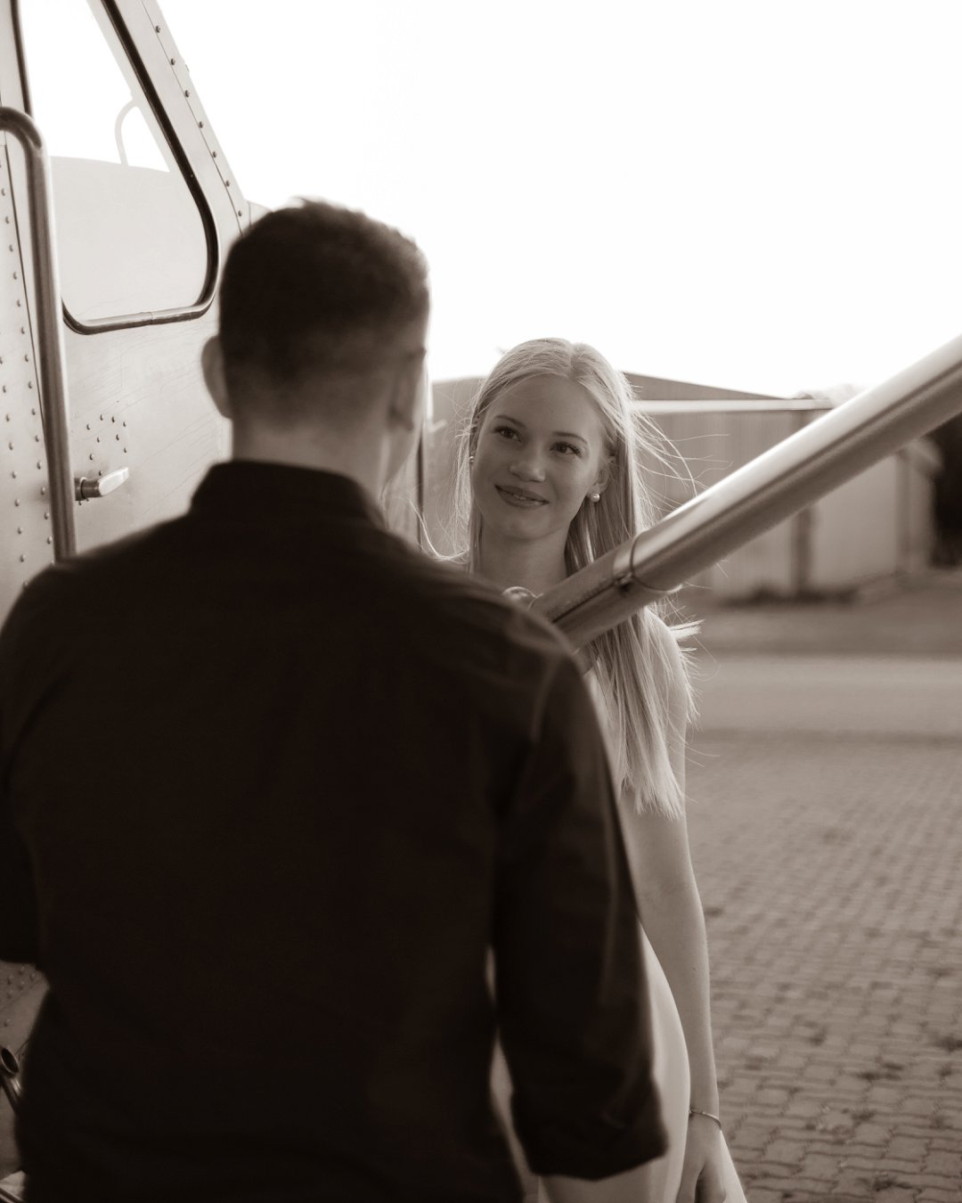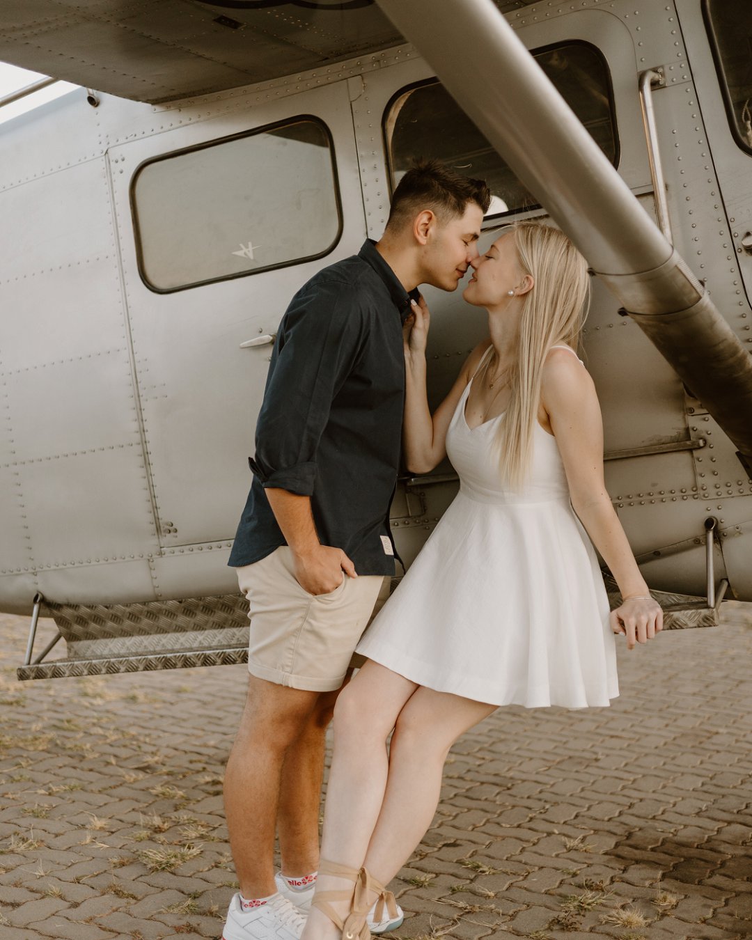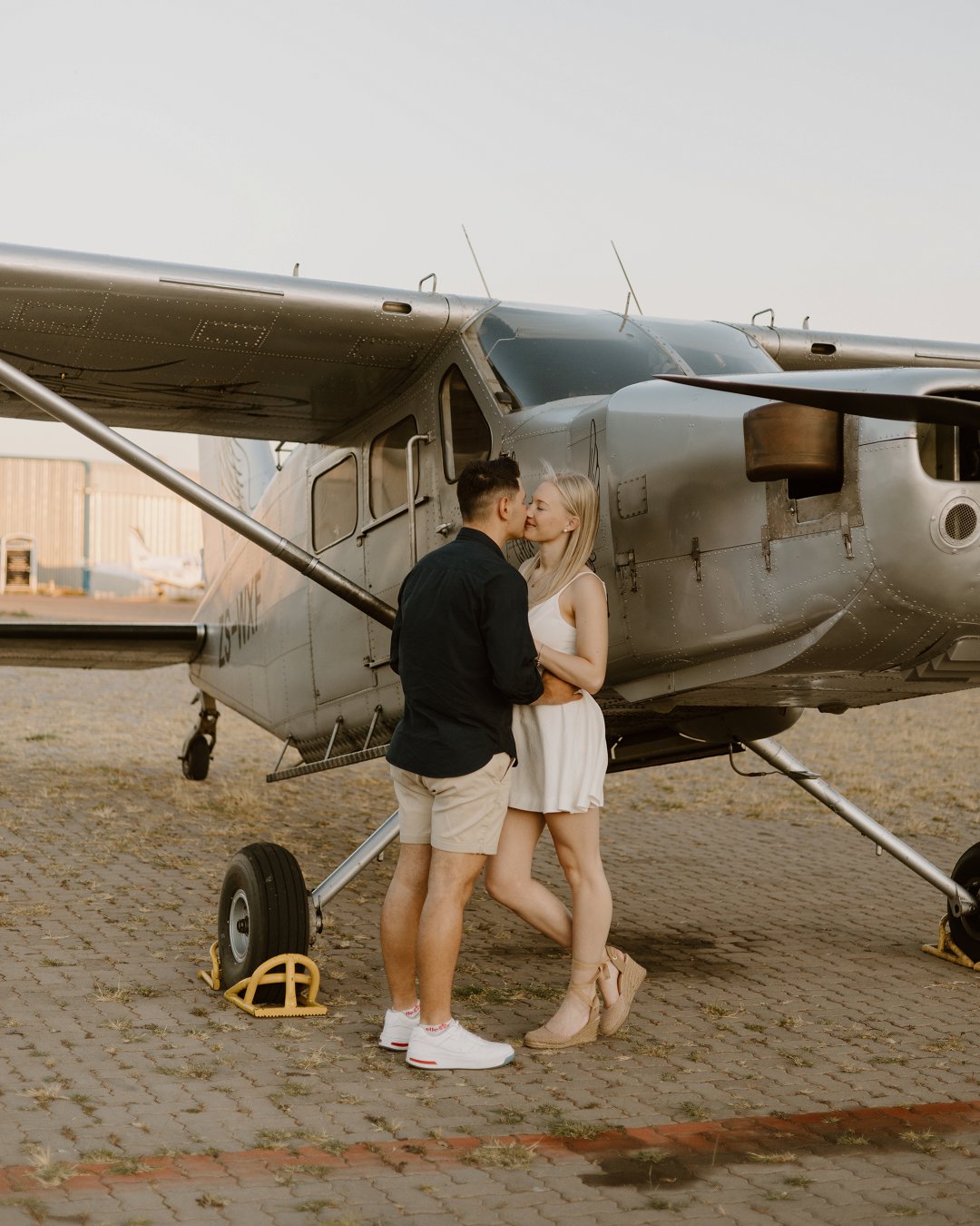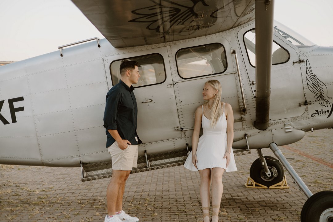 Hunter en Lana se fotosessie is werklik iets besonders. Die sagte oranje sonsaklig skep ’n romantiese, amper dromerige atmosfeer in die foto’s. En vir almal wat van vliegtuie hou, of dit bloot interessant vind, sal hierdie sessie beslis betowerend wees. Verskeie vliegtuie het as agtergrond gedien vir hul spesiale en betekenisvolle fotosessie.