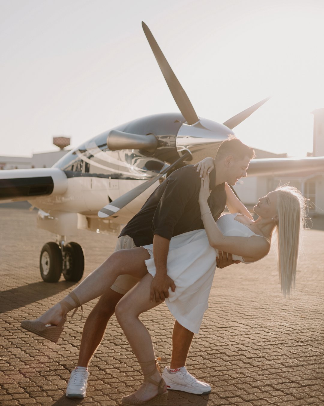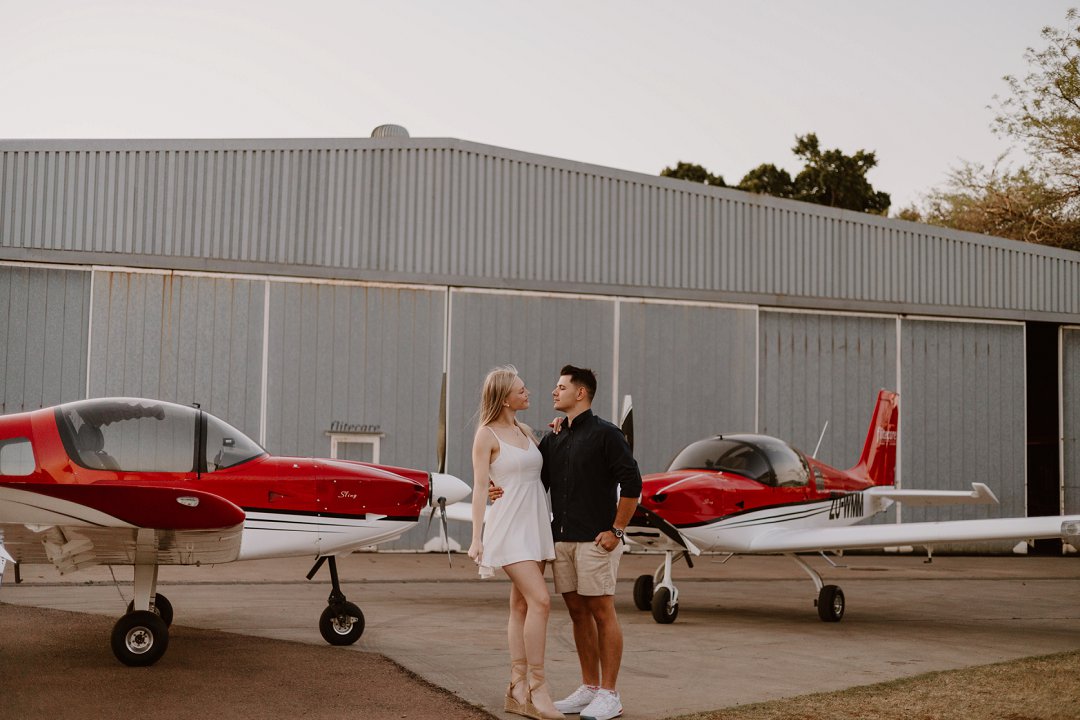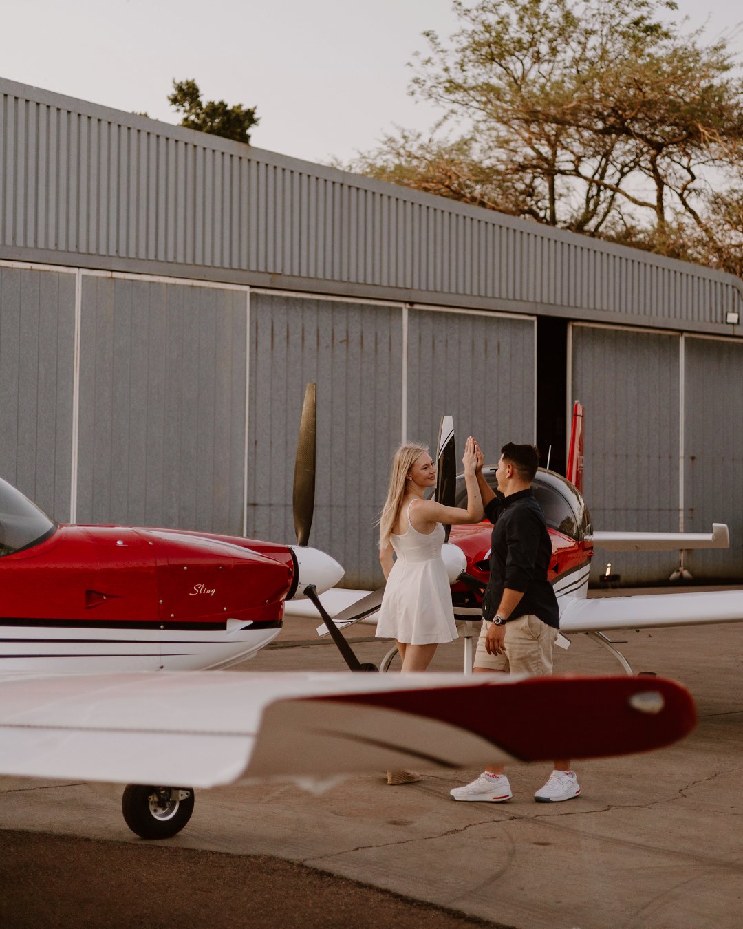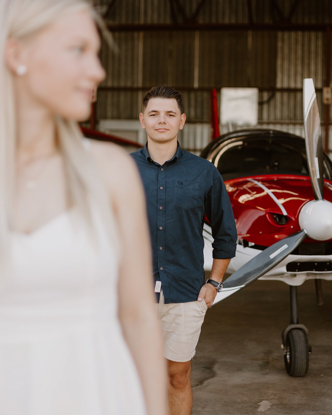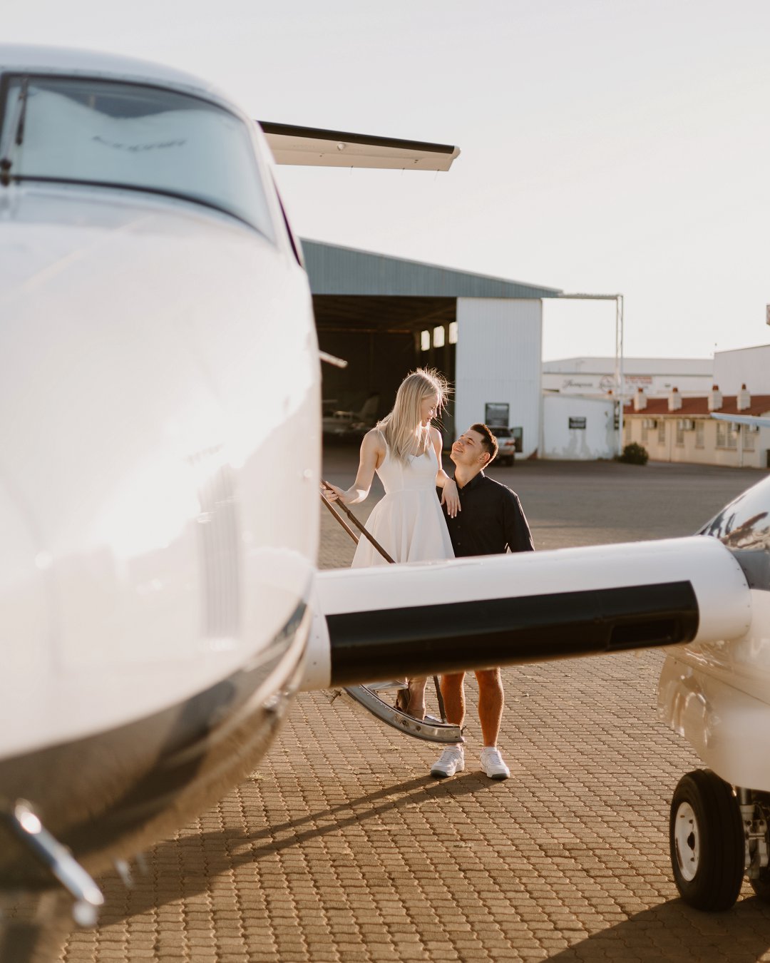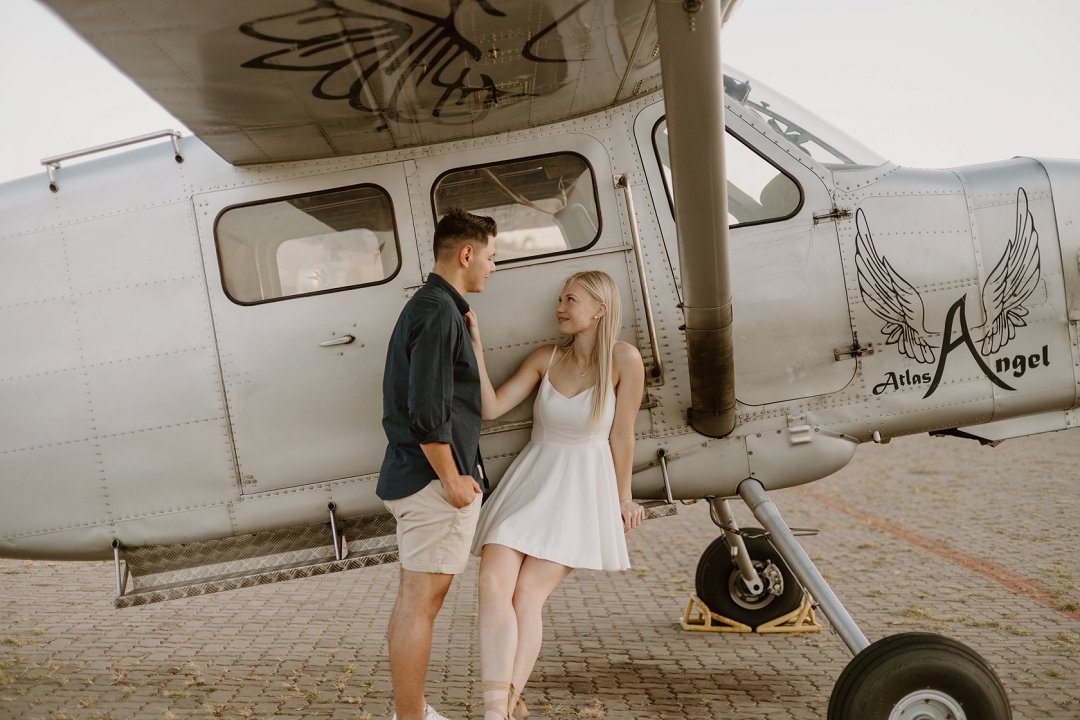 Hunter en Lana se fotosessie is werklik iets besonders. Die sagte oranje sonsaklig skep ’n romantiese, amper dromerige atmosfeer in die foto’s. En vir almal wat van vliegtuie hou, of dit bloot interessant vind, sal hierdie sessie beslis betowerend wees. Verskeie vliegtuie het as agtergrond gedien vir hul spesiale en betekenisvolle fotosessie.
