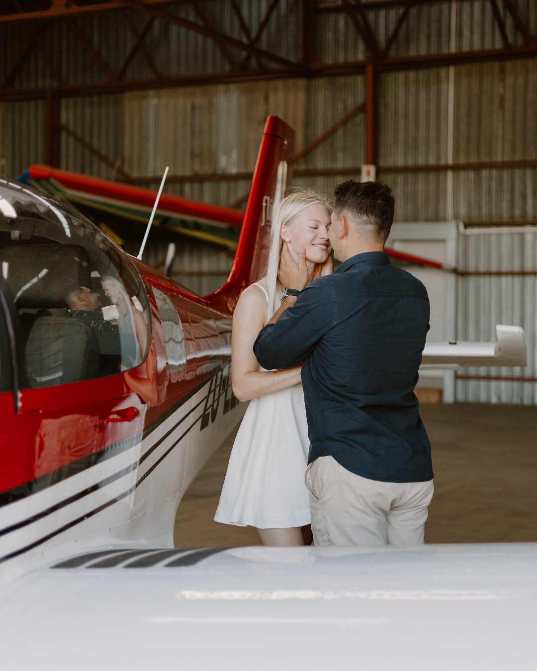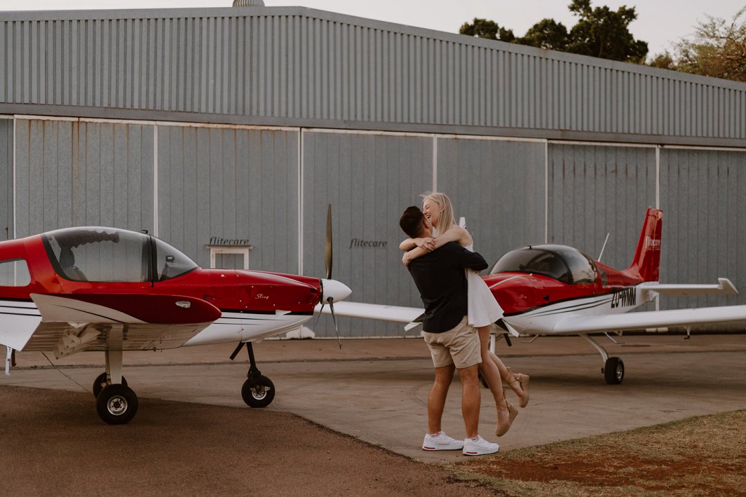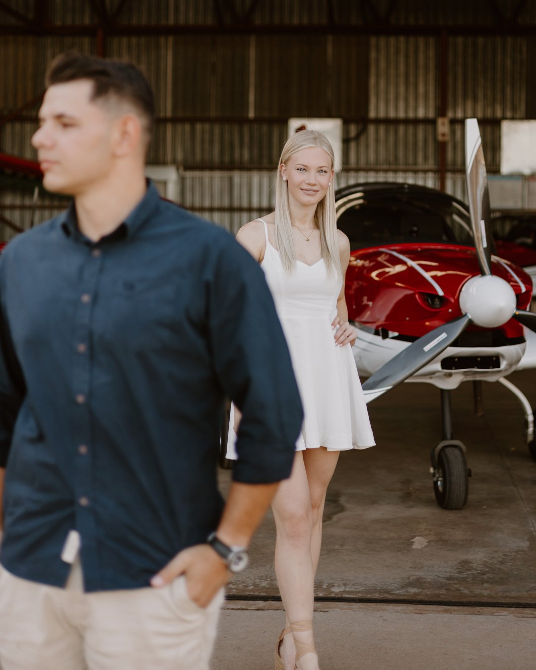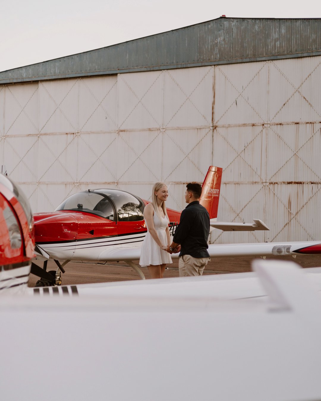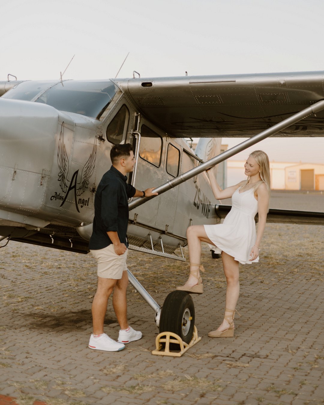 Hunter en Lana se fotosessie is werklik iets besonders. Die sagte oranje sonsaklig skep ’n romantiese, amper dromerige atmosfeer in die foto’s. En vir almal wat van vliegtuie hou, of dit bloot interessant vind, sal hierdie sessie beslis betowerend wees. Verskeie vliegtuie het as agtergrond gedien vir hul spesiale en betekenisvolle fotosessie.
