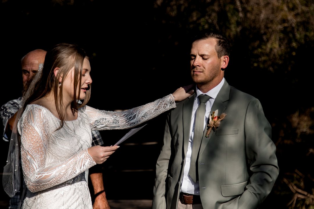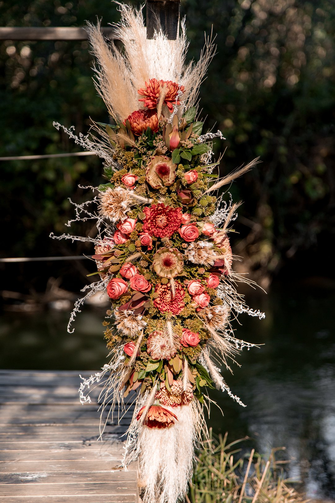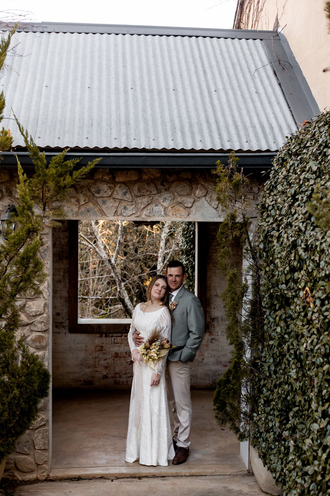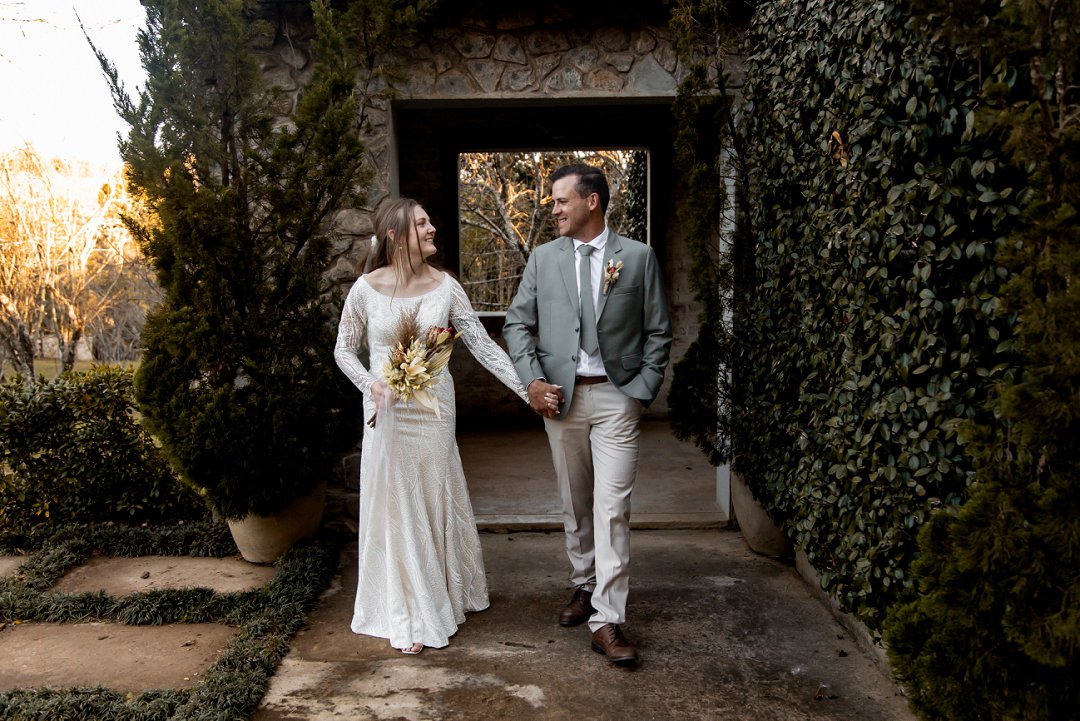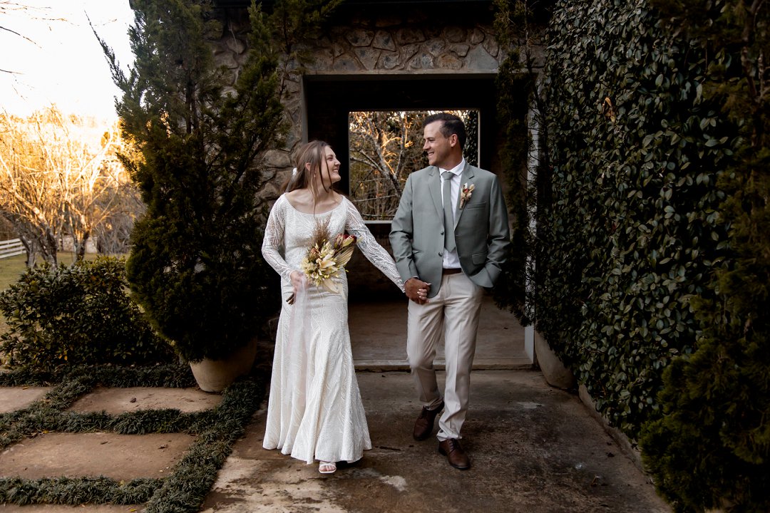 Die buitelug seremonie was soos iets uit ’n droom op ’n groen grasperk, omring deur asemrowende winter landskappe en sagte sonskyn wat oor die paartjie geval het. Die dekor het karakter en warmte uitgestraal met ’n mengsel van vars en gedroogde blomme wat ’n unieke, romantiese flair geskep het.