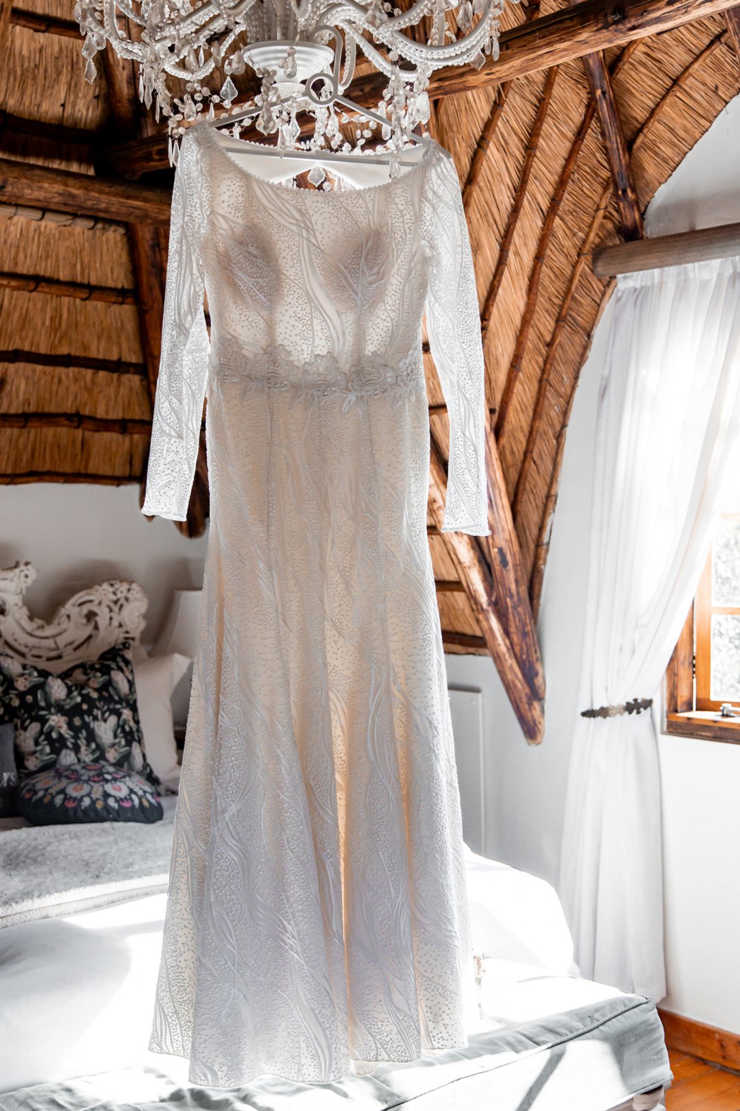 Dit het die mees verstommende detail oor die hele rok gehad, met lang moue. Die kralewerk op die agterkant van die rok en op die ronde nek het daardie gevoel van ingetoë en elegante voorkoms gegee, maar terselfdertyd het die oop rug van die rok ‘n sweempie klassieke romanse en moderne glans gegee.