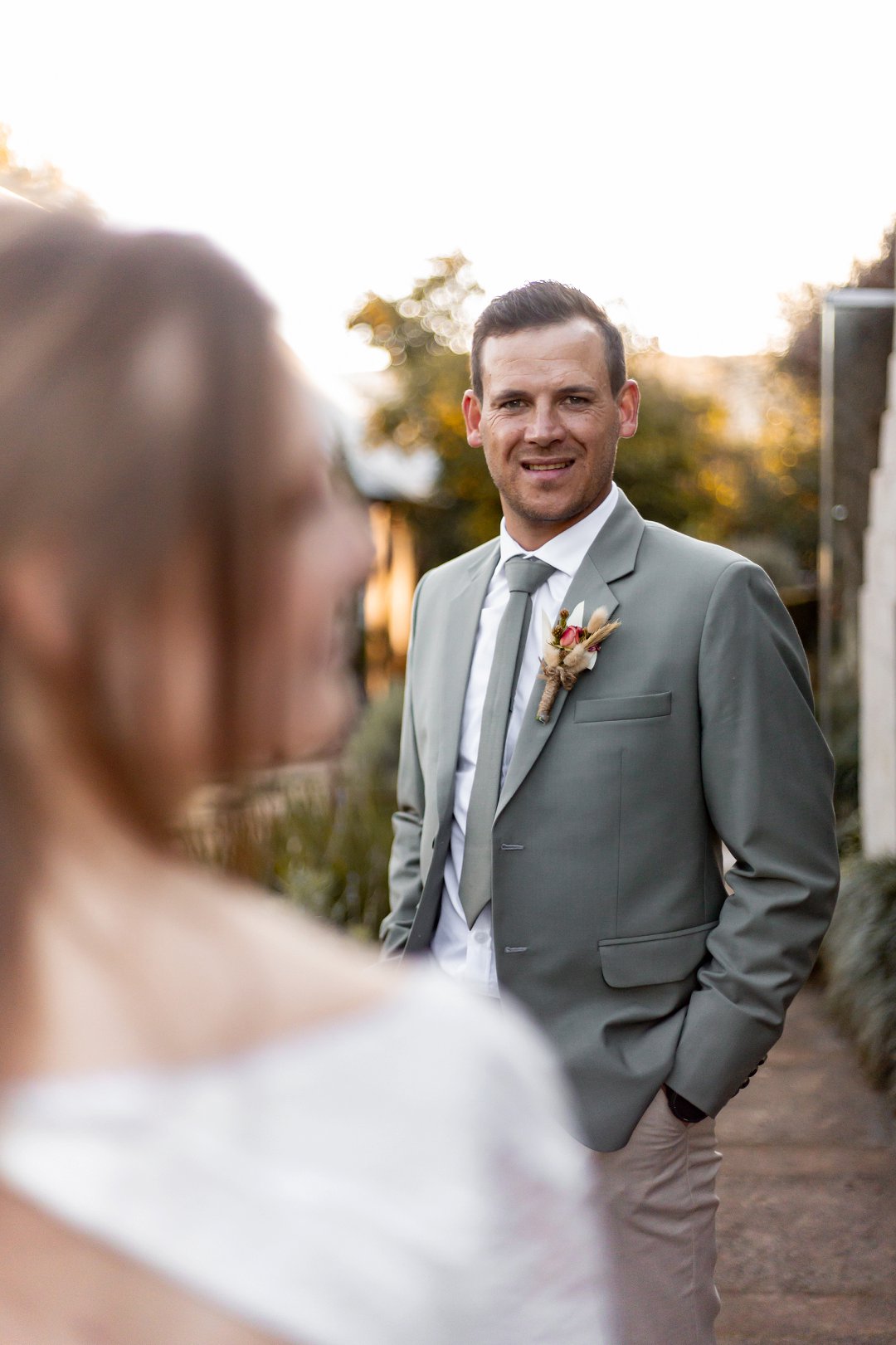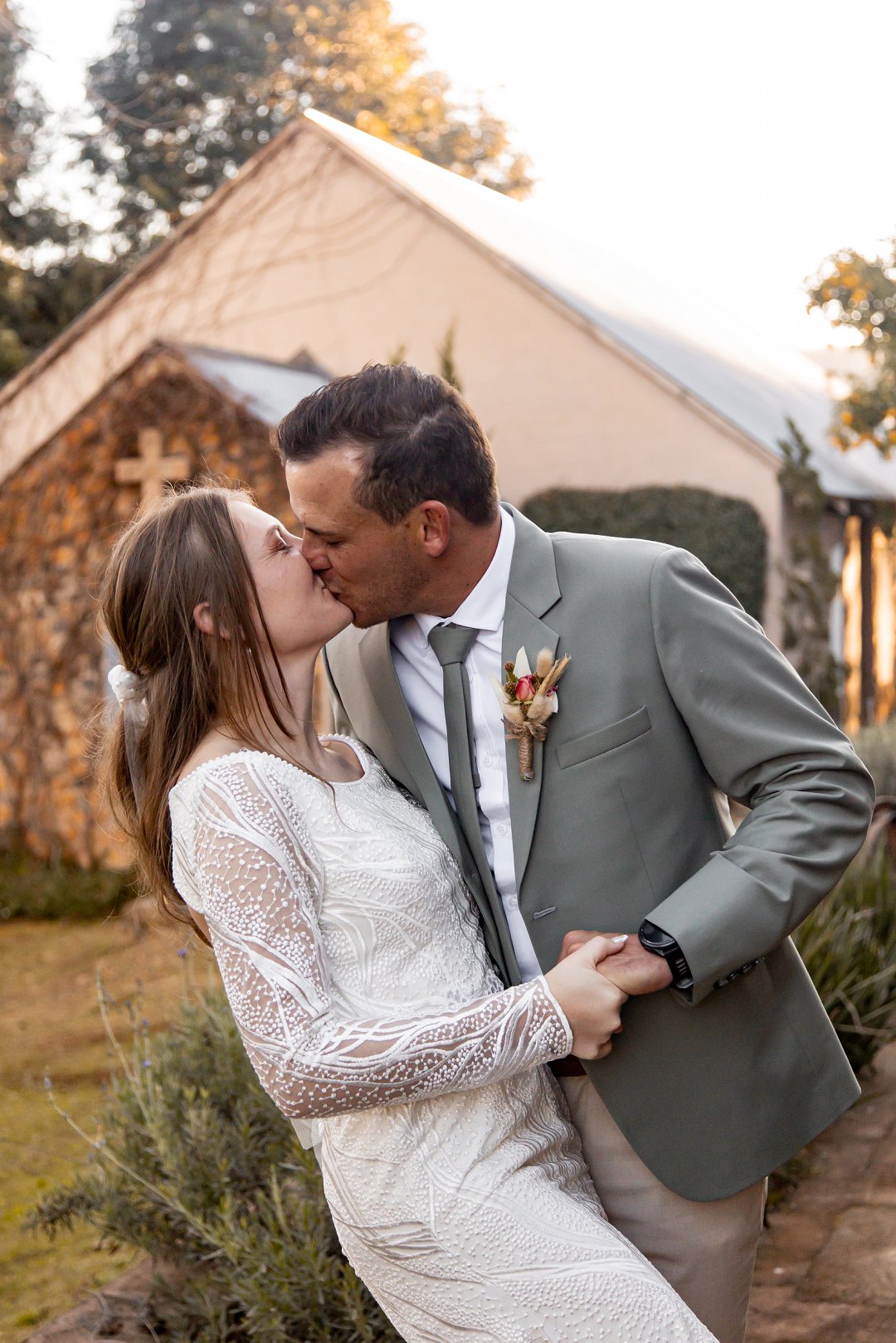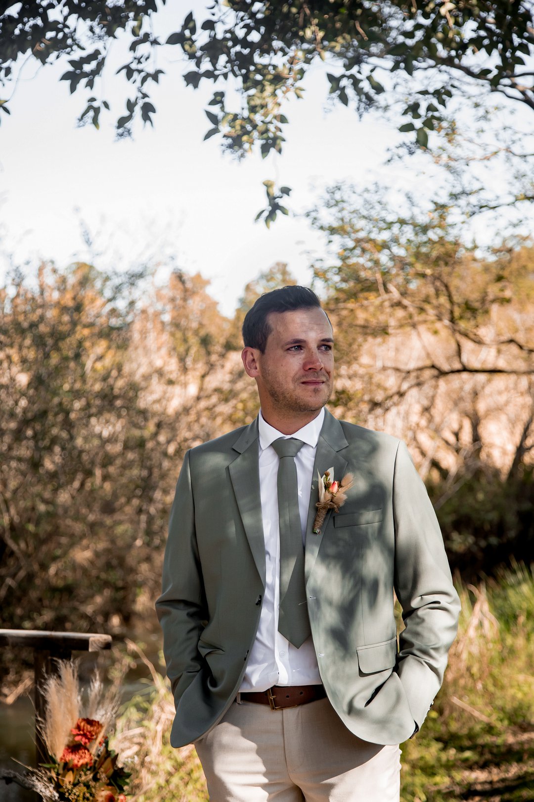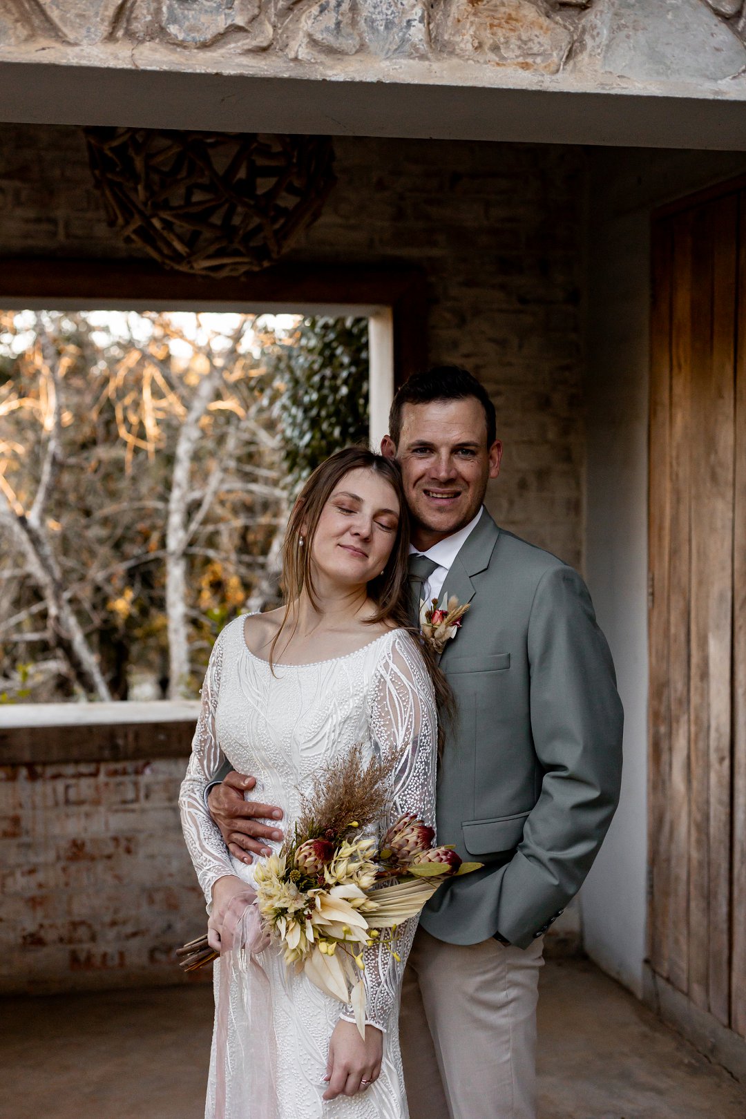 Chanell het almal se asem weggeslaan in haar pragtige trourok, versier met fyn kralewerk en elegante lang moue. Die toonbeeld van styl en romanse vir ’n wintertroue. Pierre het ewe sjarmant gelyk in sy stylvolle ligte broek, sagte groen baadjie en bypassende das, ’n kleurkombinasie wat perfek by die atmosfeer van hul betowerende dag gepas het.