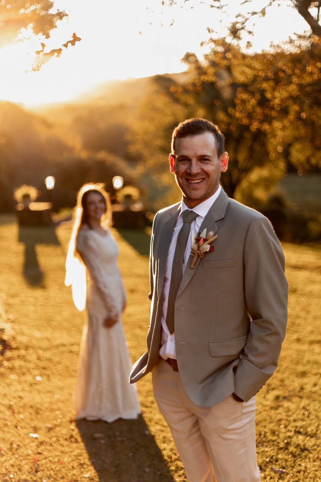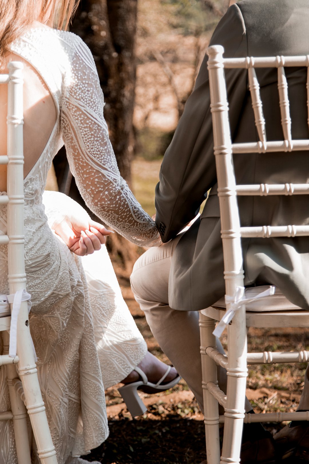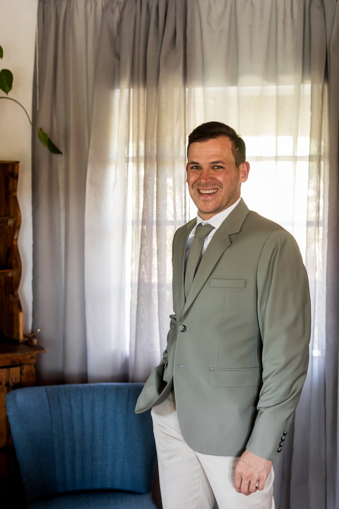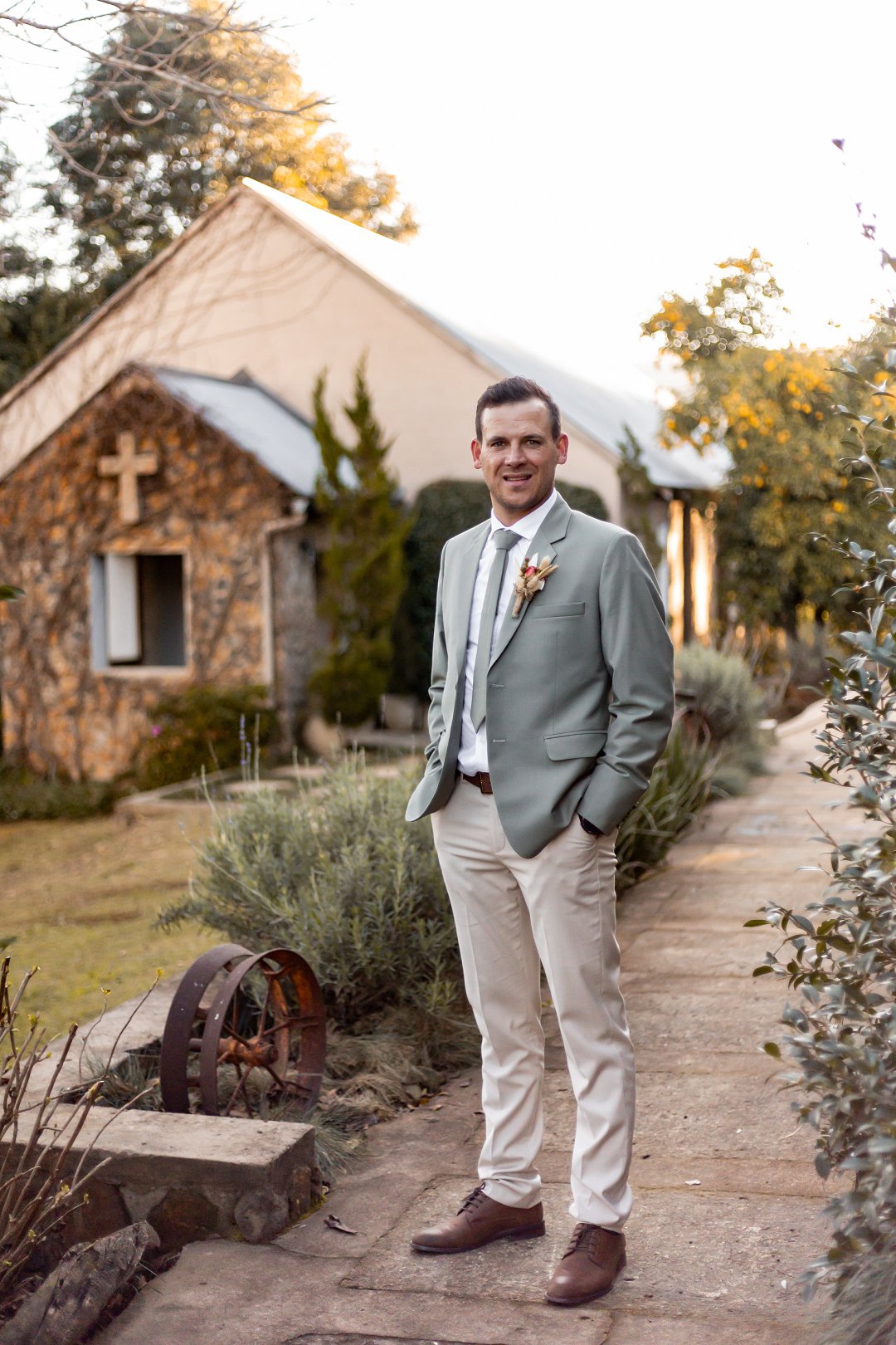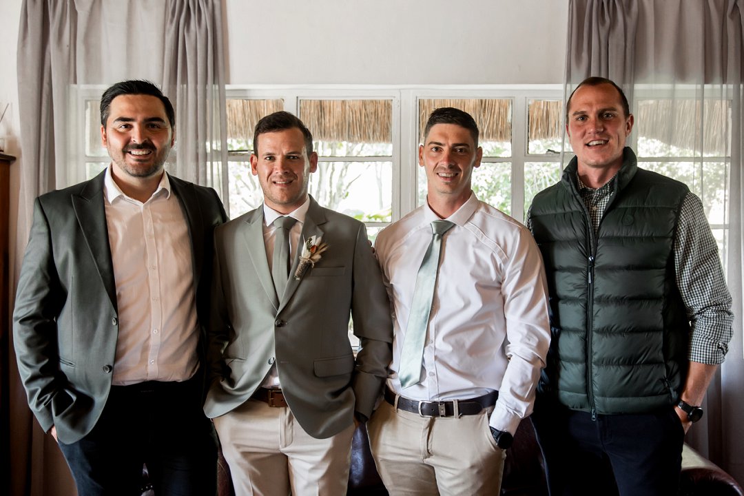 Chanell het almal se asem weggeslaan in haar pragtige trourok, versier met fyn kralewerk en elegante lang moue. Die toonbeeld van styl en romanse vir ’n wintertroue. Pierre het ewe sjarmant gelyk in sy stylvolle ligte broek, sagte groen baadjie en bypassende das, ’n kleurkombinasie wat perfek by die atmosfeer van hul betowerende dag gepas het.
